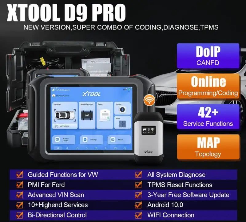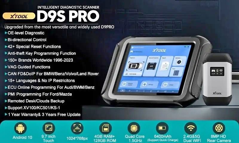 XTool D9S Pro Automotive Professional Key Programmer & Diagnostic Tool with Bi-Directional, ECU Coding & Topology Map XTool D9S Pro is an advanced automotive diagnostic system featuring a large 9.7-inch screen and dual WIFI modules for stable data transfer between the tablet and VCI. Designed for mechanics, electricians and automotive repair stores, it provides full-system automotive diagnostics, live data, Bi-directional control test, ECU coding and ECU programming. D9S Pro also supports 42 common special functions namely: Throttle adaptation, ABS bleeding, Service light reset, EPB test, SAS calibration, BMS reset, Injector coding, DPF regeneration, and TPMS reset. With 98% vehicle coverage and compatibility with over 100 brands and 10,000 car models OE-Level Full System Diagnostics: XTool D9S Pro is an OE-level full diagnostic scanner as it can scan ECUs in different types of vehicle systems and subsystems namely: Engine, TCM(Transmission), SRS(Airbag), ABS, TPMS, BCM, BODY, AC and much more, read /clear codes, view the live data from each available system, perform active tests to check the work status of modules, providing you with a dealership- level only diagnosis, getting the accurate and in-depth results across all automotive systems. Intelligent Topology Mapping Change Everything: Equipped with color coded module status for faster full system diagnostic results. View the communication structure between modules clearly. Note: Topology Map compatibility with GM, CHRYSLER, JEEP, DODGE, FORD, TOYOTA, NISSAN, HONDA, BMW, BENZ, HYUNDAI, MAZDA (MORE COMING SOON). Not all vehicle makes and models are supported Please Note: Functions may differ from vehicle make and models (Not all makes and models are supported)
