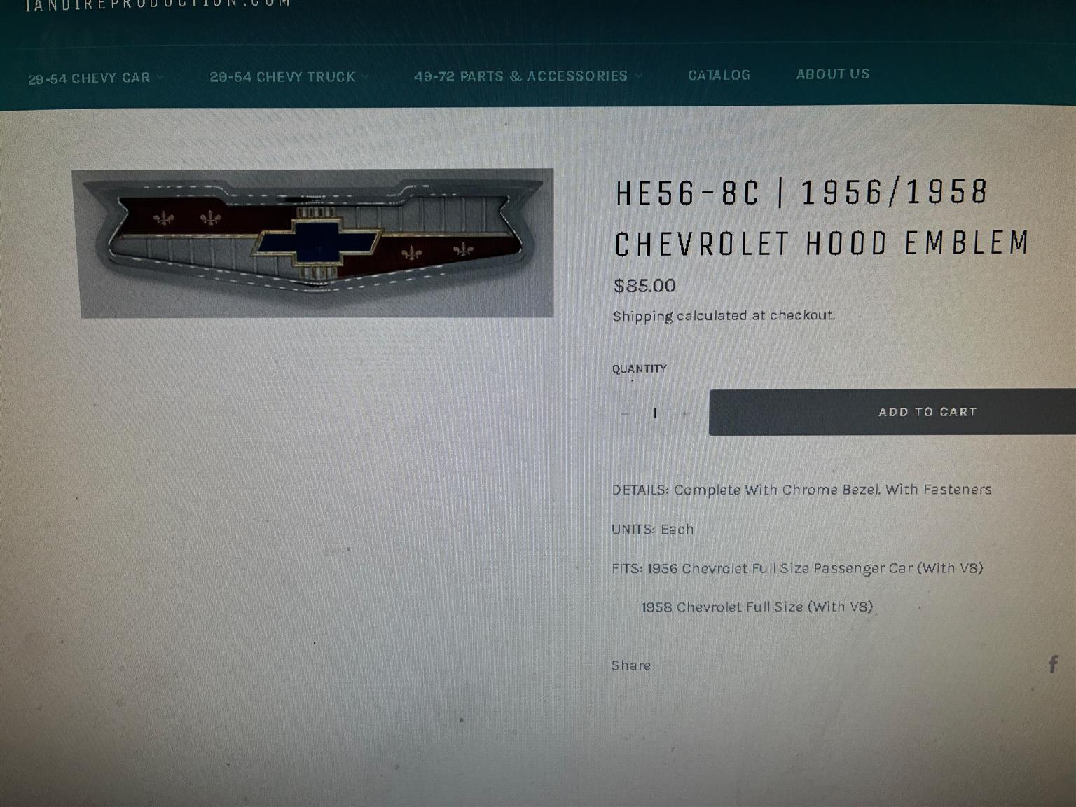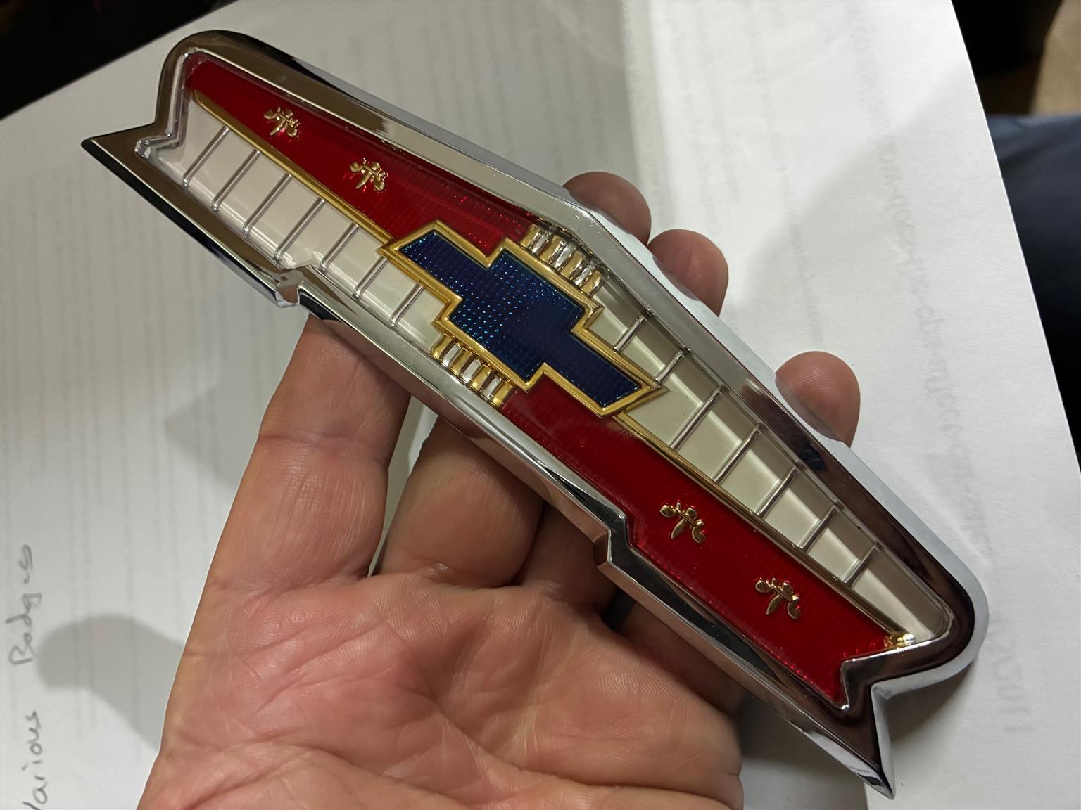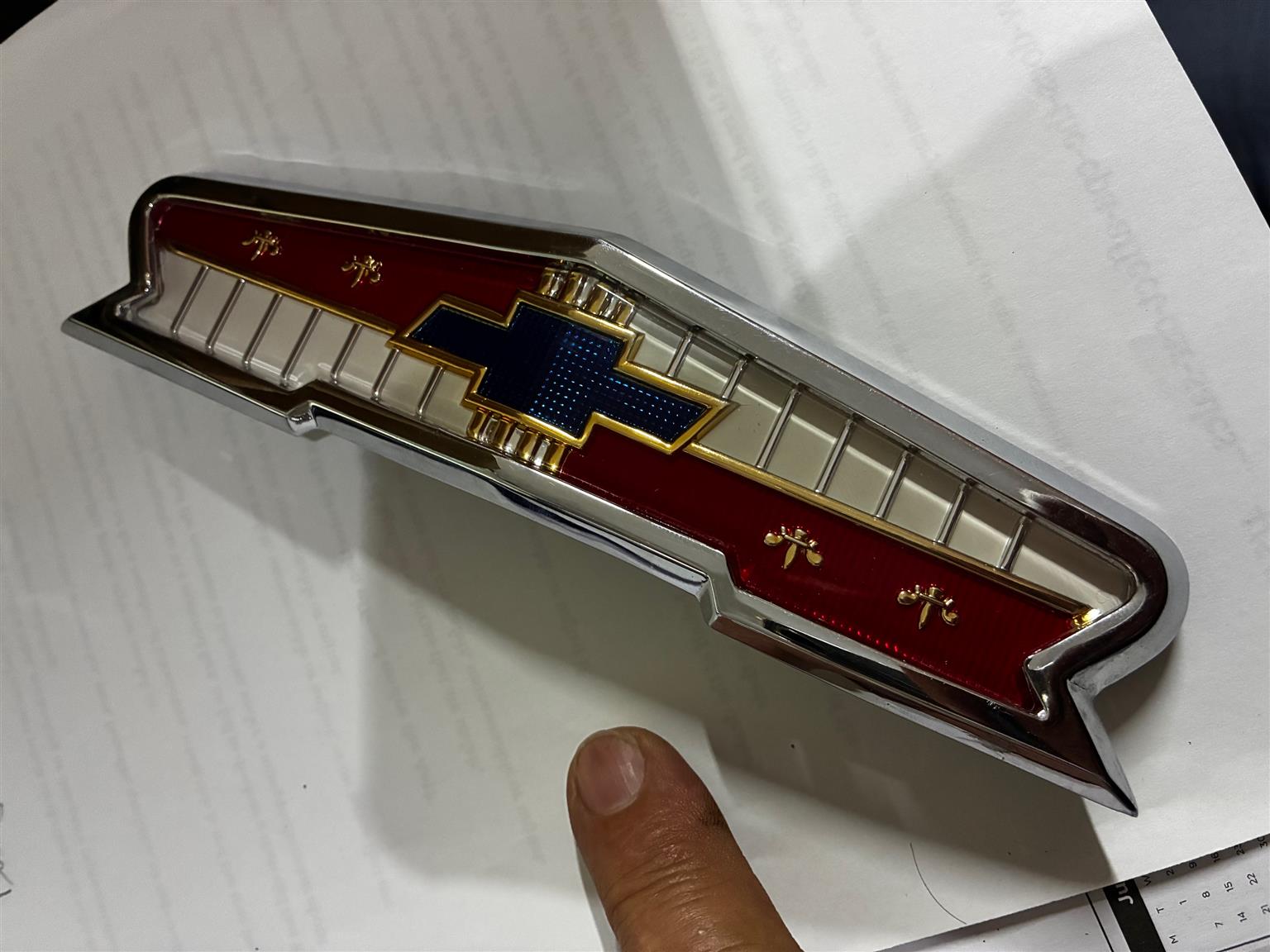 Chev Hood Emblem badge Impala 1956 - 58 Chevy Chevrolet GM Bel Air V8 style bezel assembly BRAND NEW bonnet badge as per pictures Tri Five.