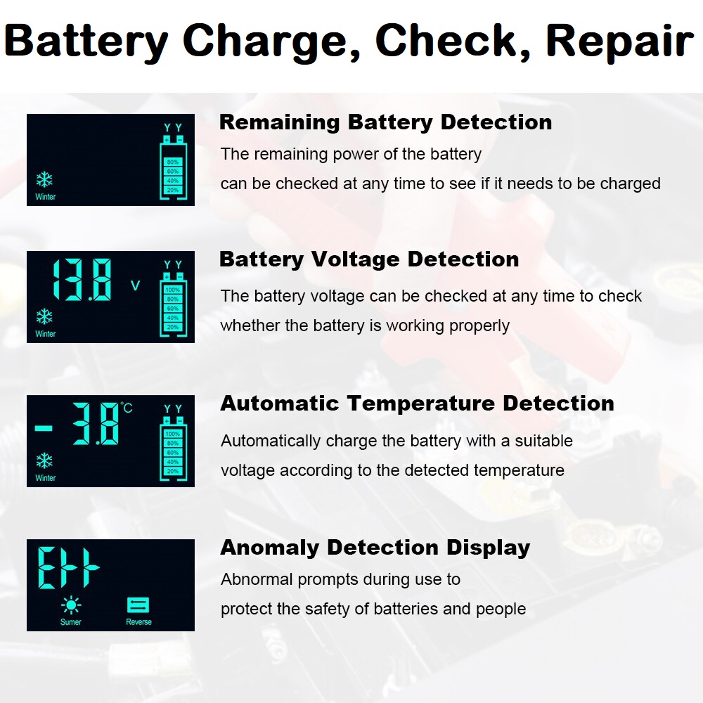 3 Stages Automatic Charging: Fully automatic battery repair charger with 3 charge stages.
