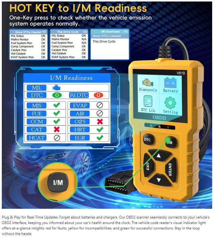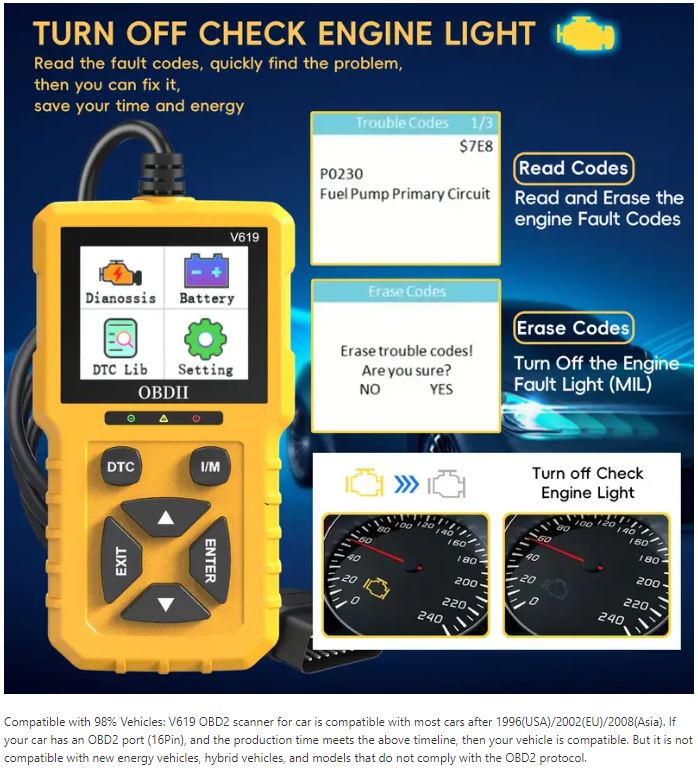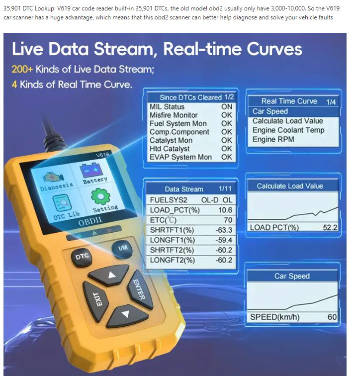 V619 – OBDII Car Scanner Diagnostic Tool, Auto Check Engine Code Reader with Reset & 35901 DTCs, Enhanced OBDII/EOBD Car Scan Tools for All Vehicles After 1996