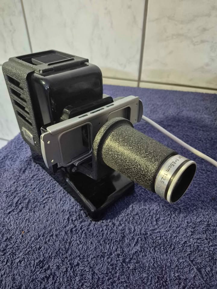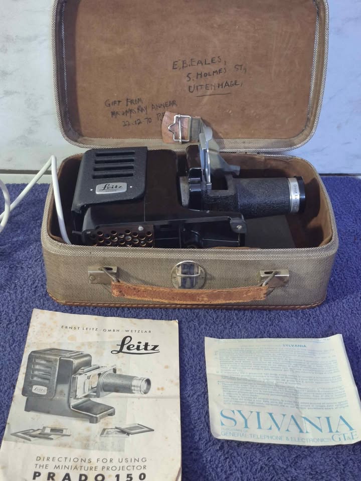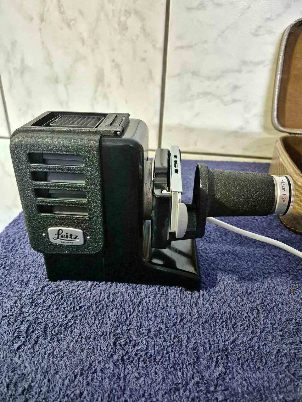 Leitz was a German company known for producing high-quality optical equipment. The Prado series of projectors was used for displaying photographic slides. The projector features an 85mm f/2.5 lens. The name "Leitz" and "Wetzlar, Germany" are visible on the nameplate.