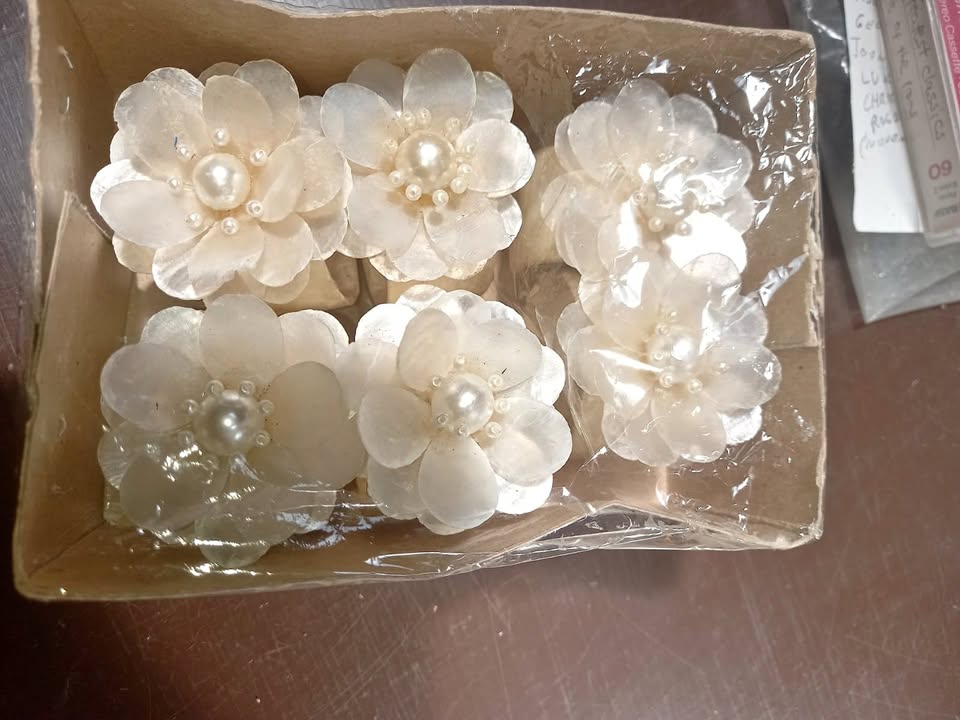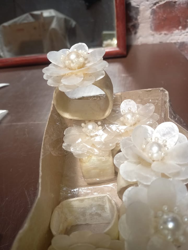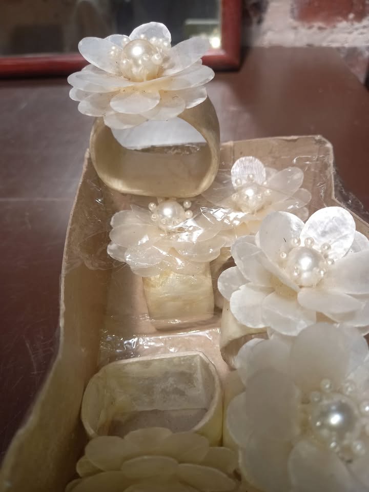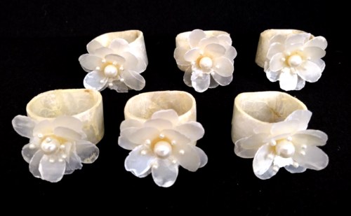 SERVIETTE HOLDERS Capiz Shell Napkin Made with natural Capiz Shell. set of 6, vintage, napkin holders. Each ring is "D" shaped. Beautiful off-white color. Made of Capiz shells from the Philippines. Lovely flower on top with faux pearls for added detail and beauty. Napkin ring holders are in good vintage condition. The flowers are attached tightly to the rings. Stunning napkin holders to add class and elegance to any table. Measures 2 inches tall x 2 inches wide x 1 inch thick. Beautiful 6 pc set