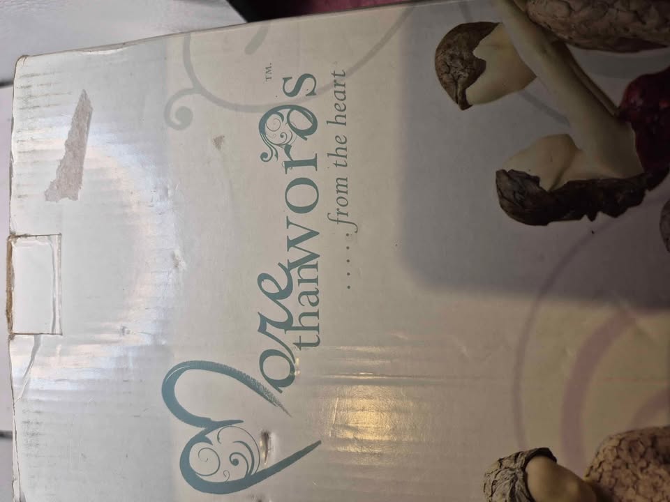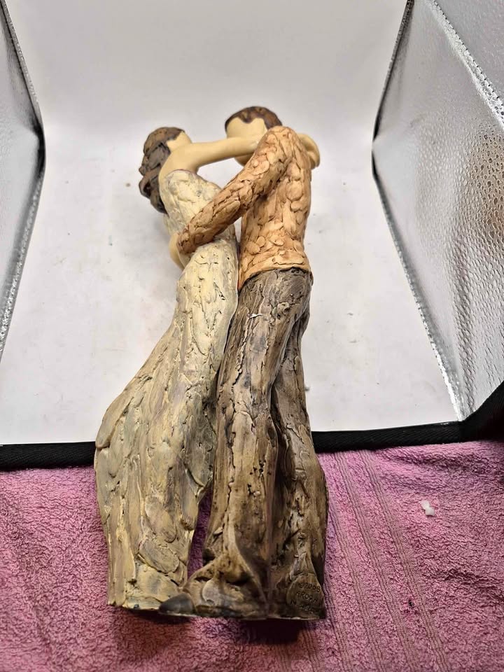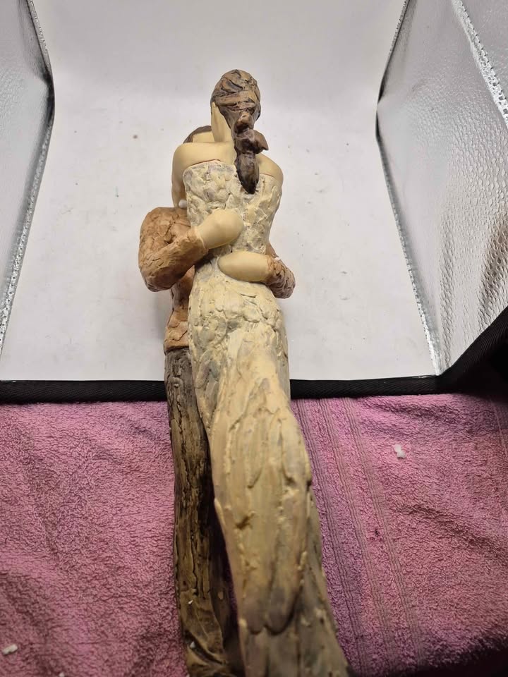 This figurine features a man and woman embracing, often with a "Soul Mates" ornament. It is part of the "More Than Words" collection, known for its expressive, sentiment-based figurines inspired by sculptor Neil Welch. The figurines are crafted from a resin/stone mix and are characterized by their faceless design, which allows viewers to project their own emotions and experiences onto the piece. These sculptures capture emotional moments and special occasions, expressing unspoken feelings through poignant poses. They are often given as gifts for occasions such as weddings, anniversaries, or engagements.