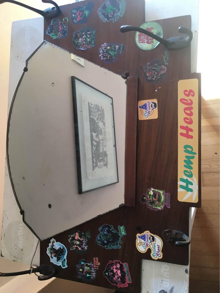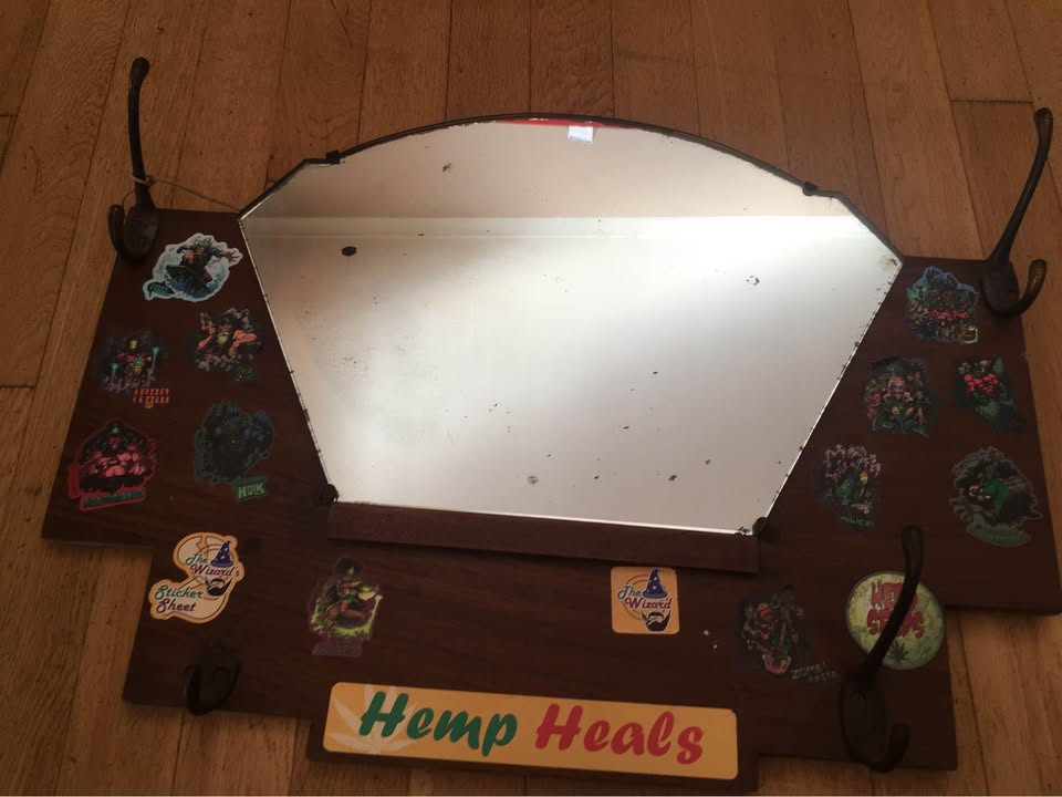 Art decor mirror with 4 hooks . Can be used as hall stand for coats / hats . Good condition. Make an offer. Very old..collectors item