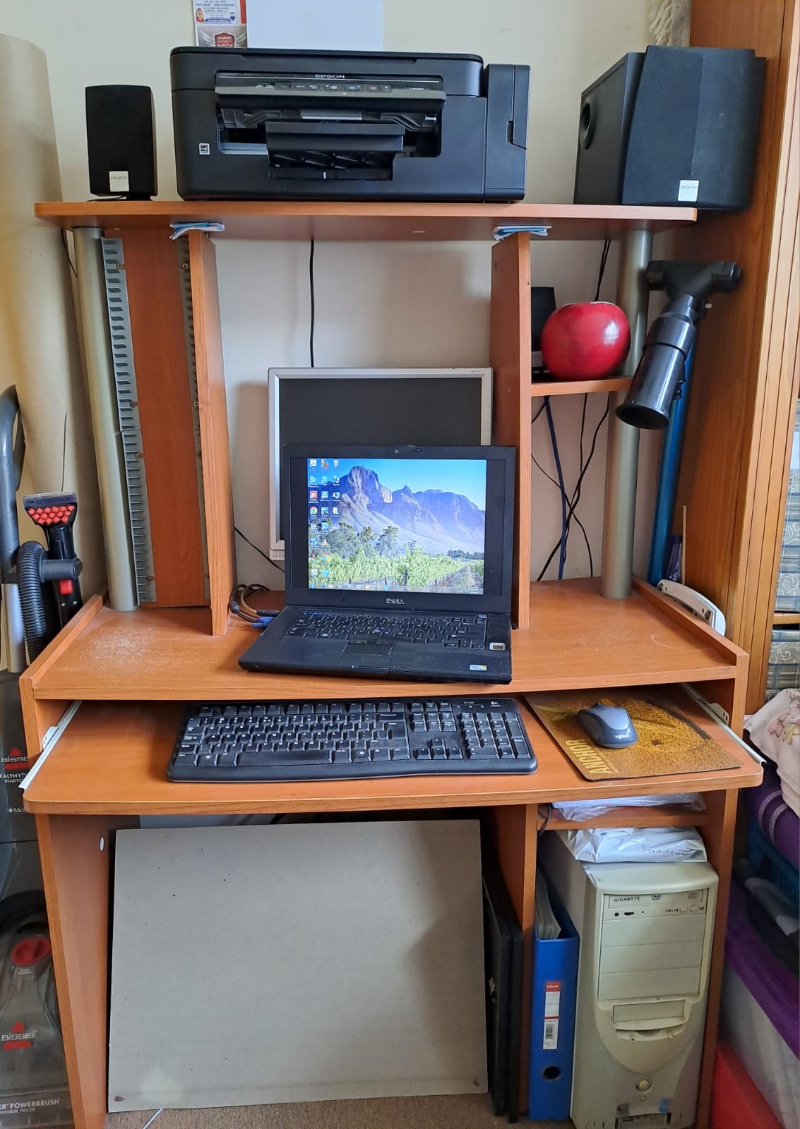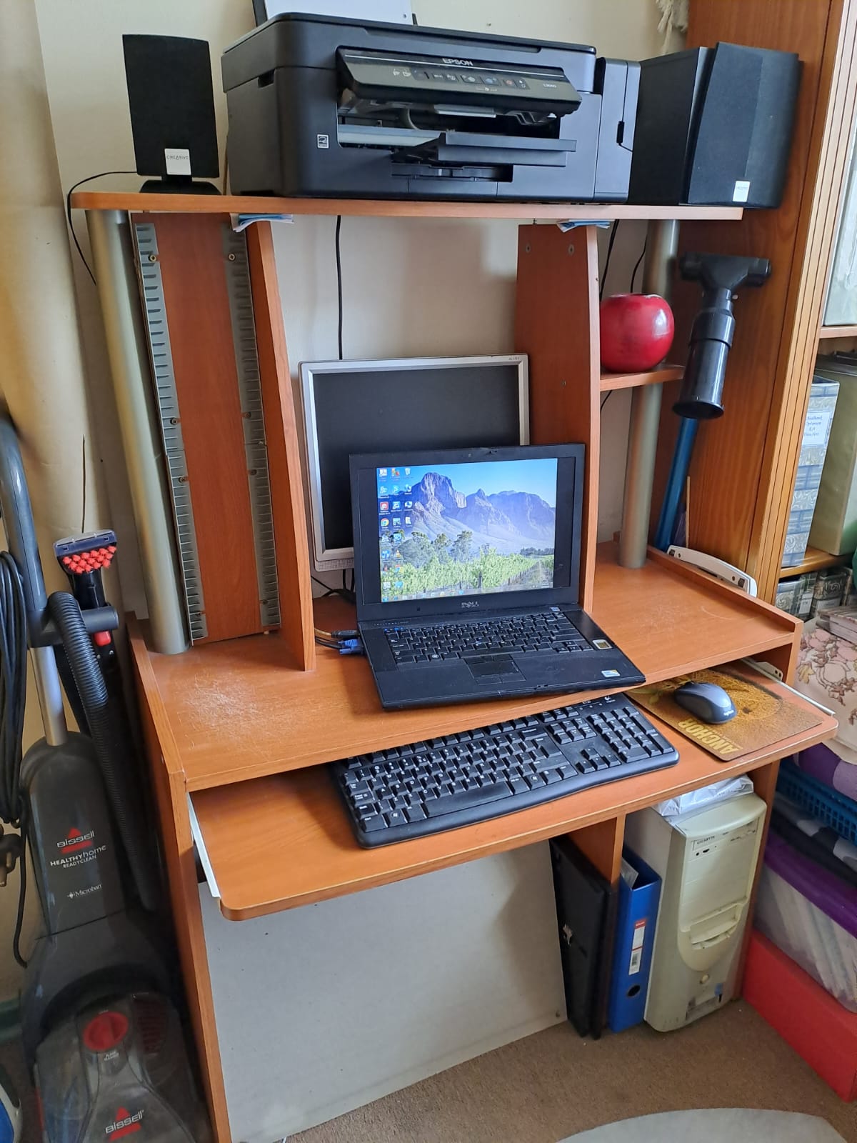 Computer workstation table with shelf for printer, space for CDs/DVDs, and slide out tray for keyboard.