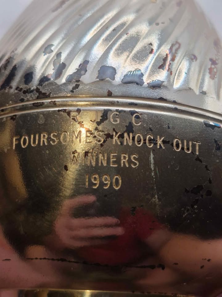 A trophy from a golf competition, specifically the "RFGC Foursomes Knock Out Winners 1990". "RFGC" likely stands for a golf club, possibly the Royal Johannesburg Golf Club, which is a prominent golf club in South Africa. "Foursomes" refers to a golf format where two players compete as a team, playing one ball alternately. "Knock Out" indicates a knockout or single-elimination tournament format. "Winners 1990" signifies that this trophy was awarded to the winners of this specific competition in the year 1990.