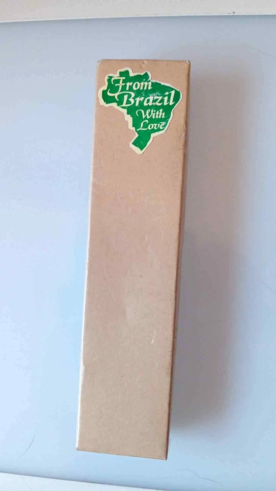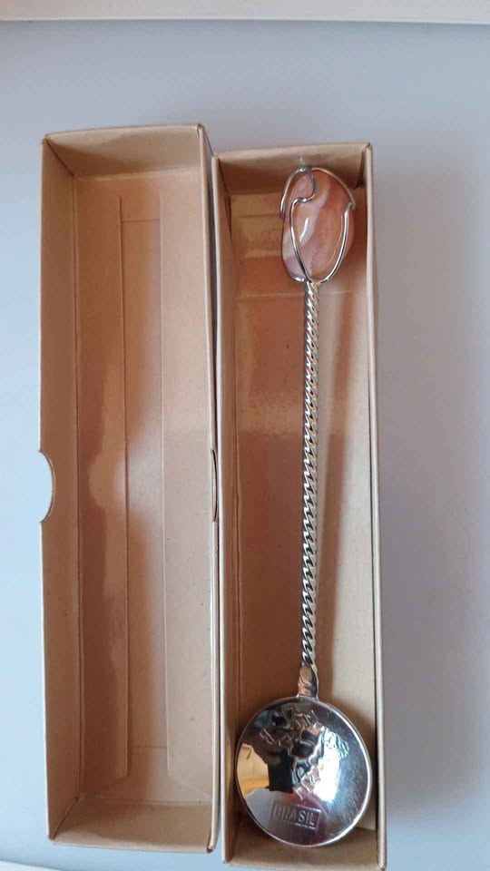 vintage souvenir spoon from Brazil. It is a collectible spoon featuring a wire-wrapped semi-precious stone on the handle and the word "Brasil" engraved on the bowl, which also depicts a map of South America. The spoon is often associated with the brand Barasch Sylmar and is made in Brazil with semi precious stone a carnelian