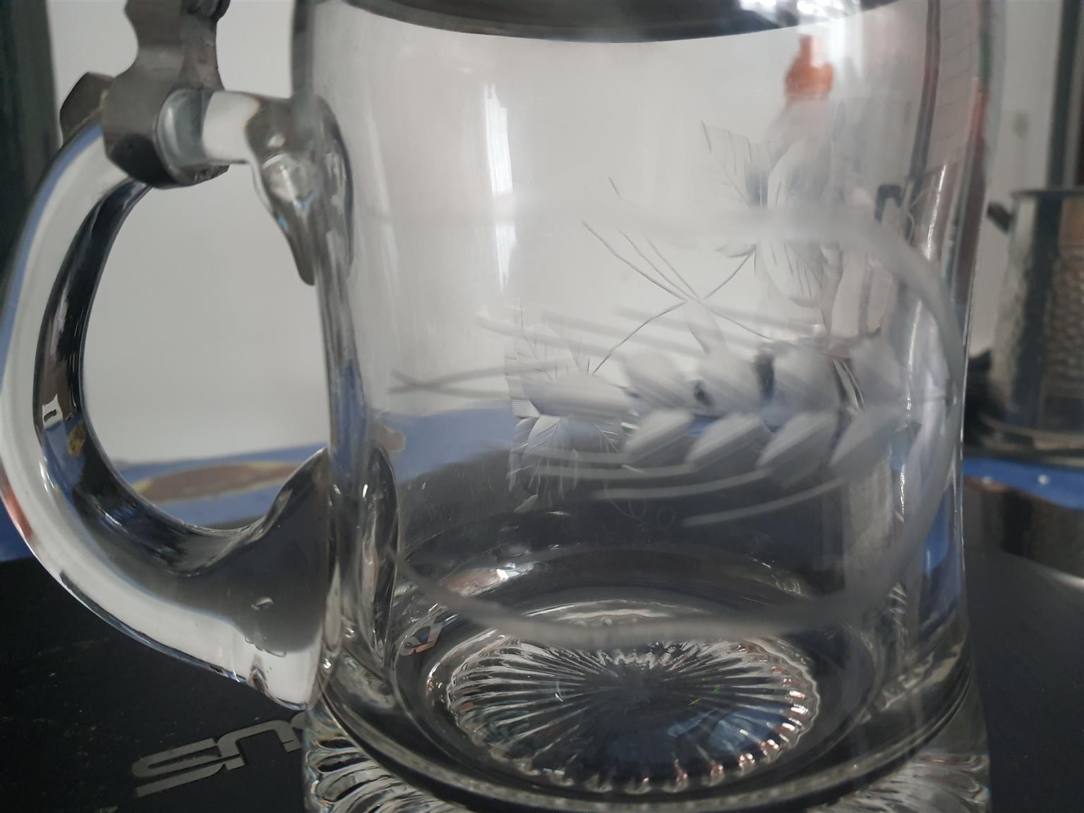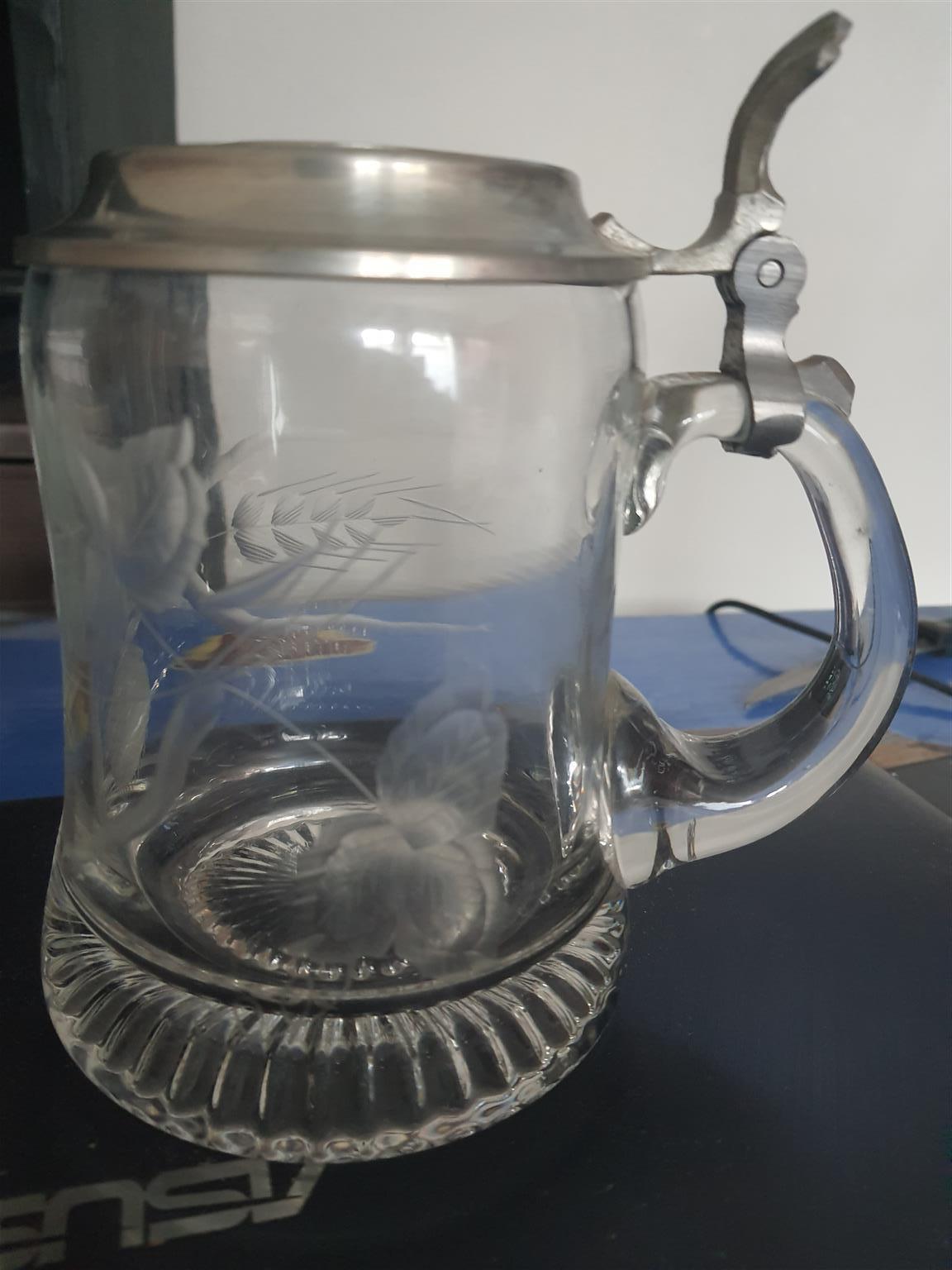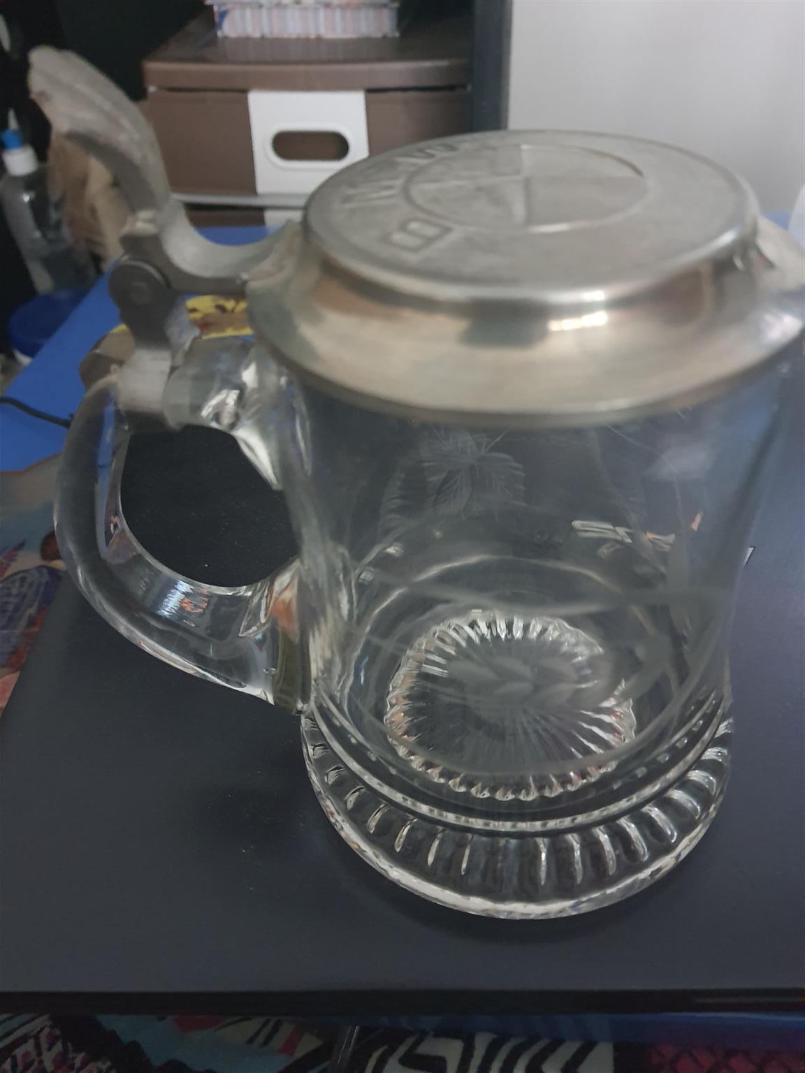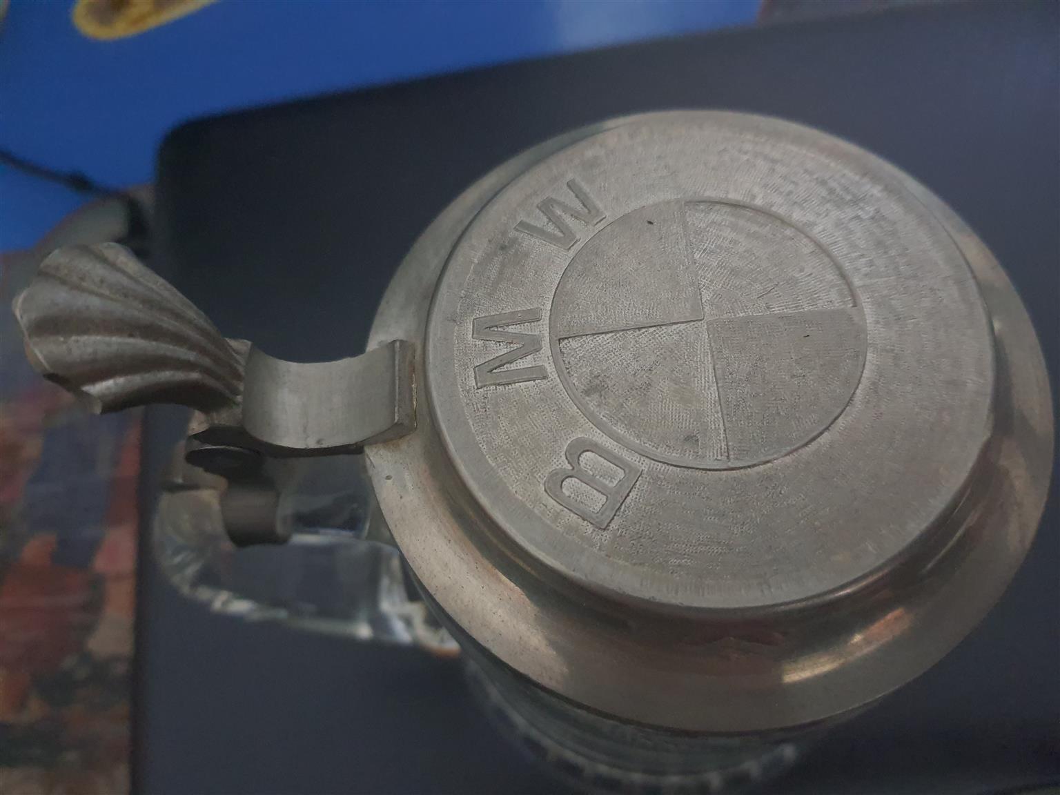 BMW Pewter lid glass beer stein mug - ERBO ZINN 8" for sale. In very good condition - no cracks or marks on it. A real collector's item. Price negotiable.