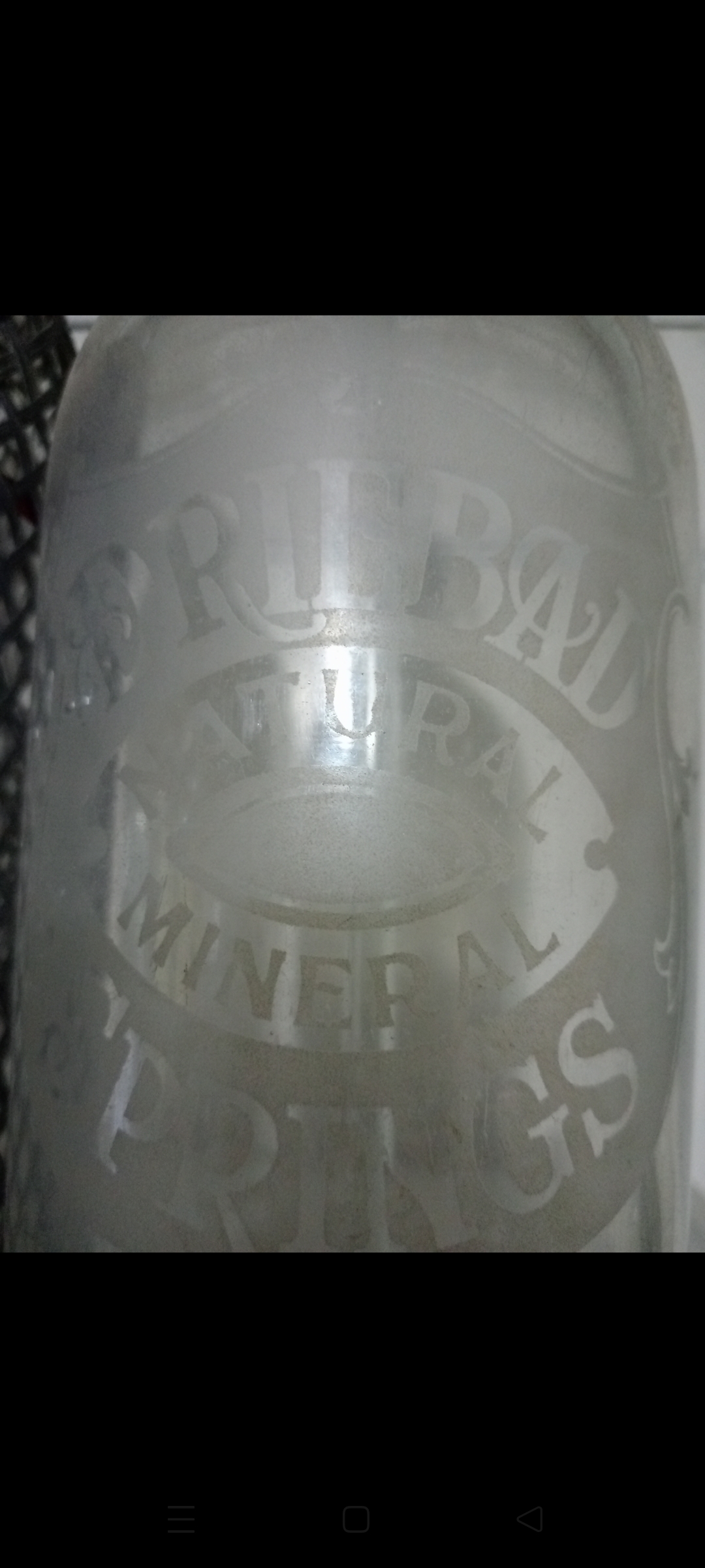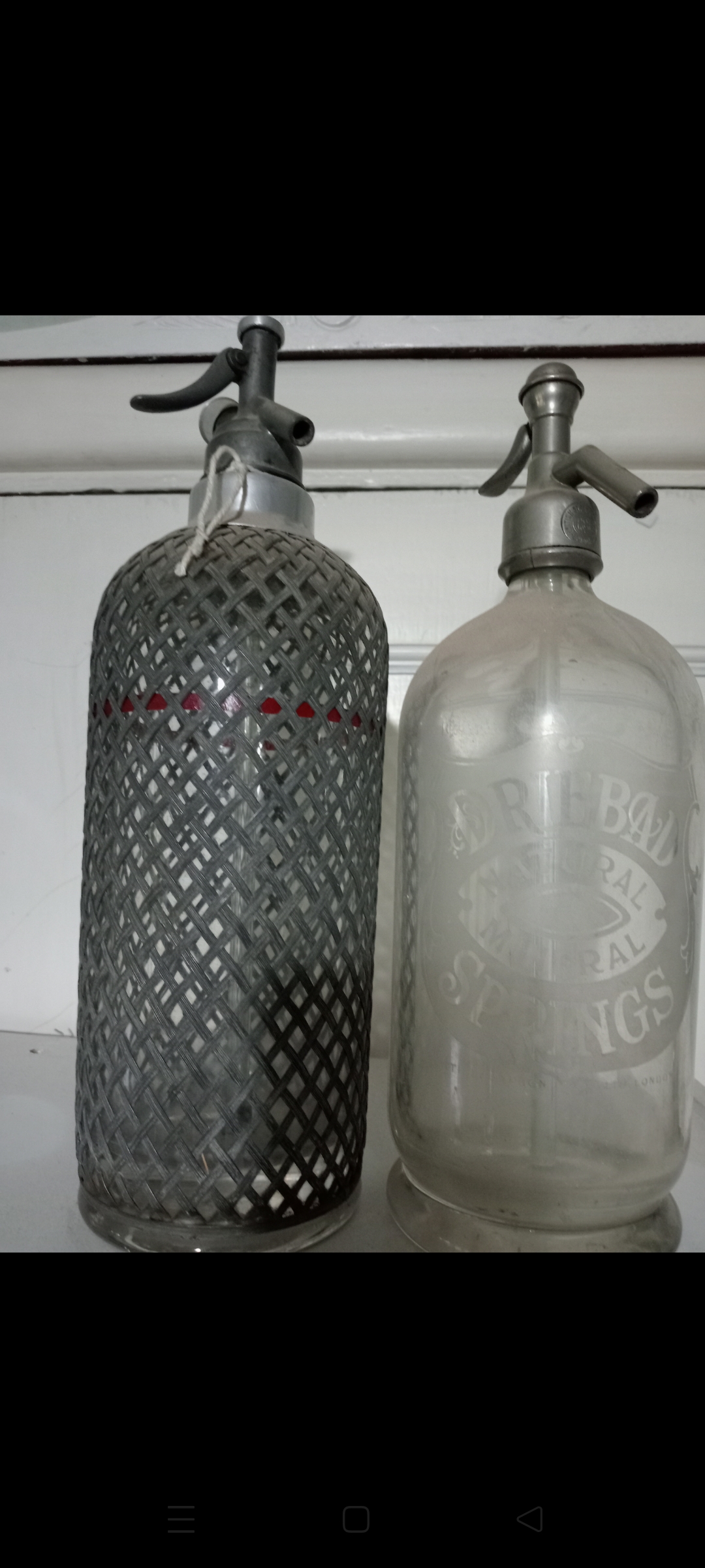 2 Antique glass canisters, one covered in metal mesh, one sandblasted with wording, spring water.
