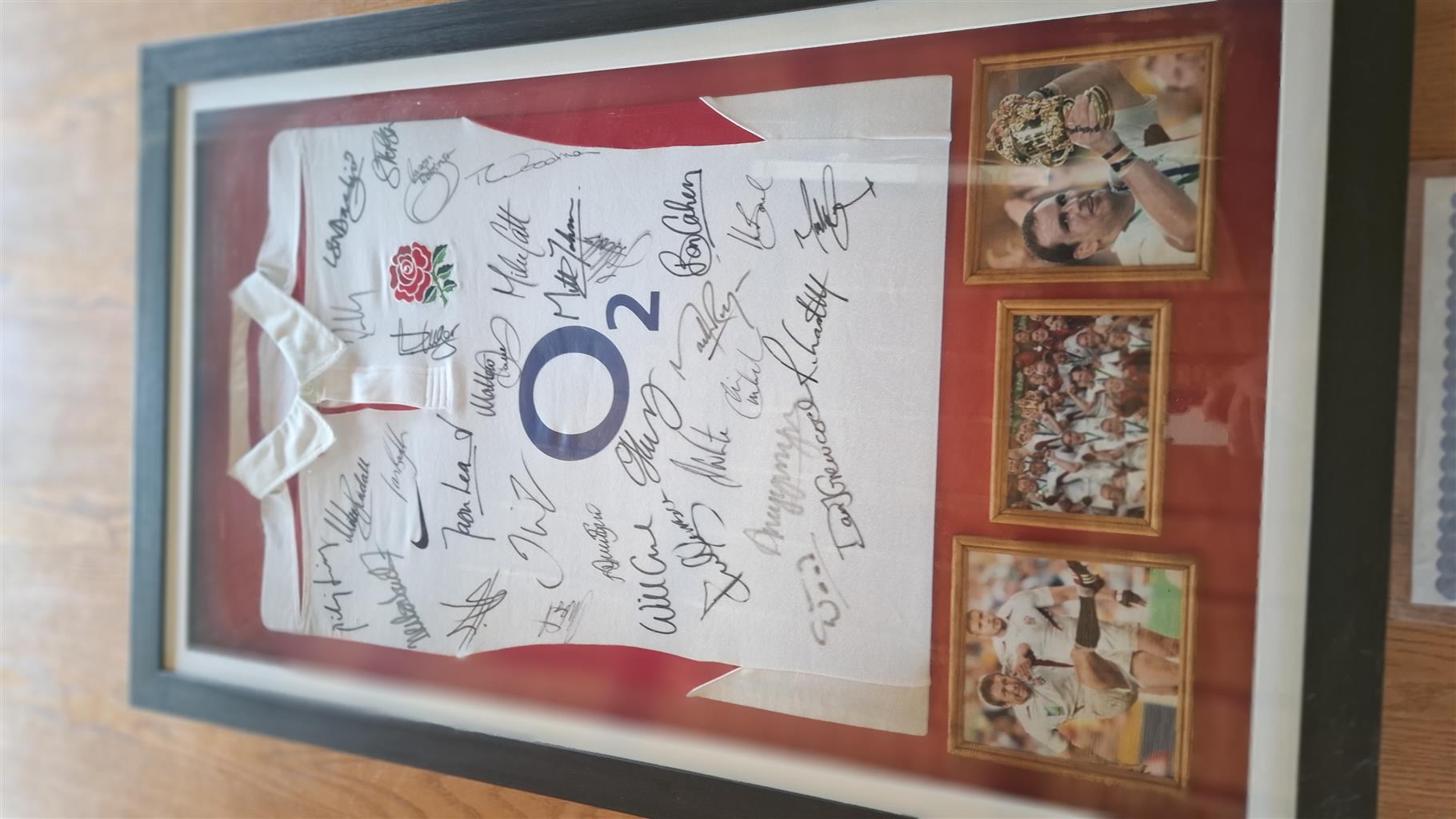 Signed by the 2003 RWC winning team England. Framed and few photos at the bottom from the final.