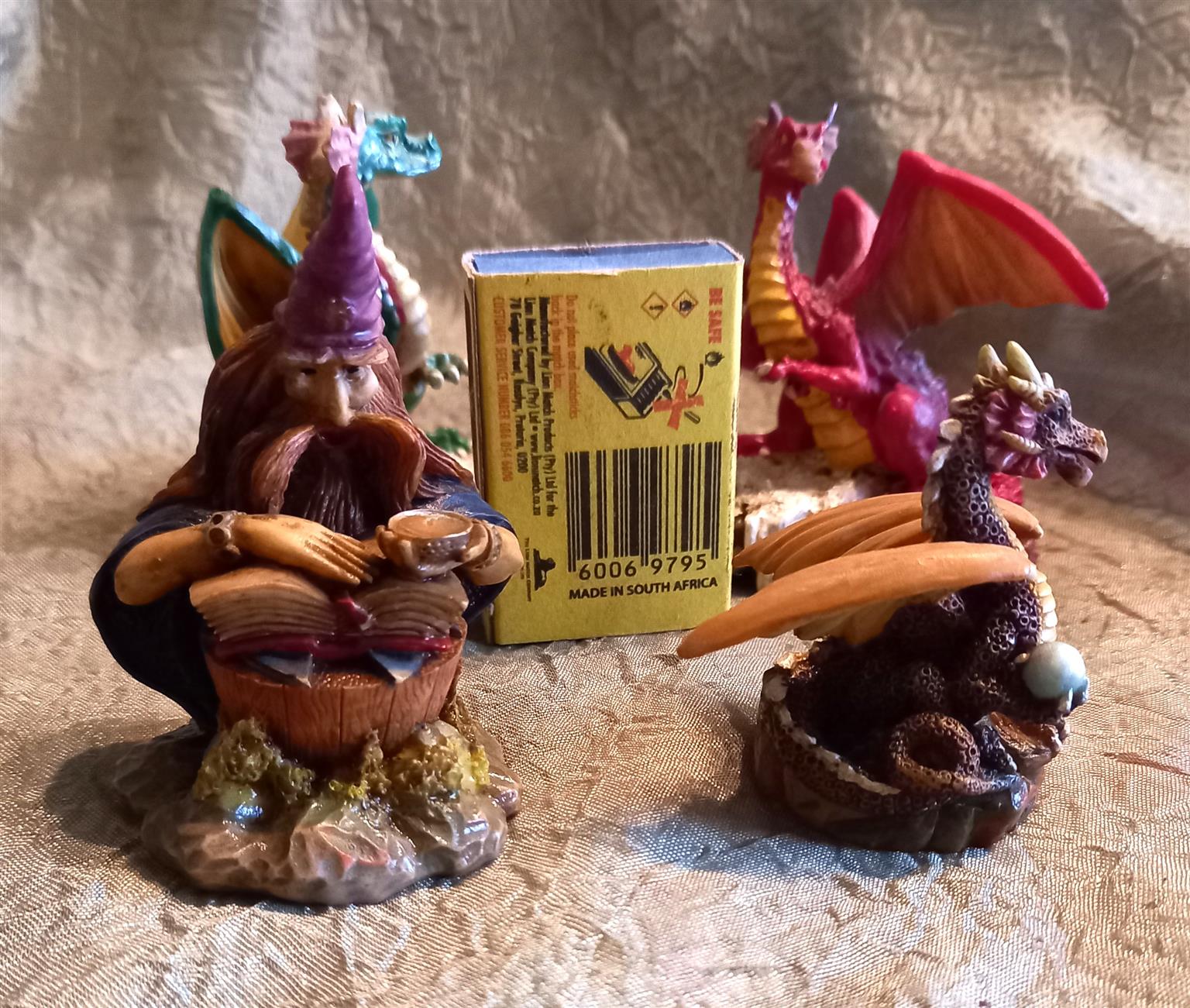 Set of 4 mini fantasy figures. A wizard, 2 small dragons and a baby dragon, Charming collection from the Dragon Tales studio. All 8cm high. Good buy for Dragon lovers and collectors. Price is for the set of 4