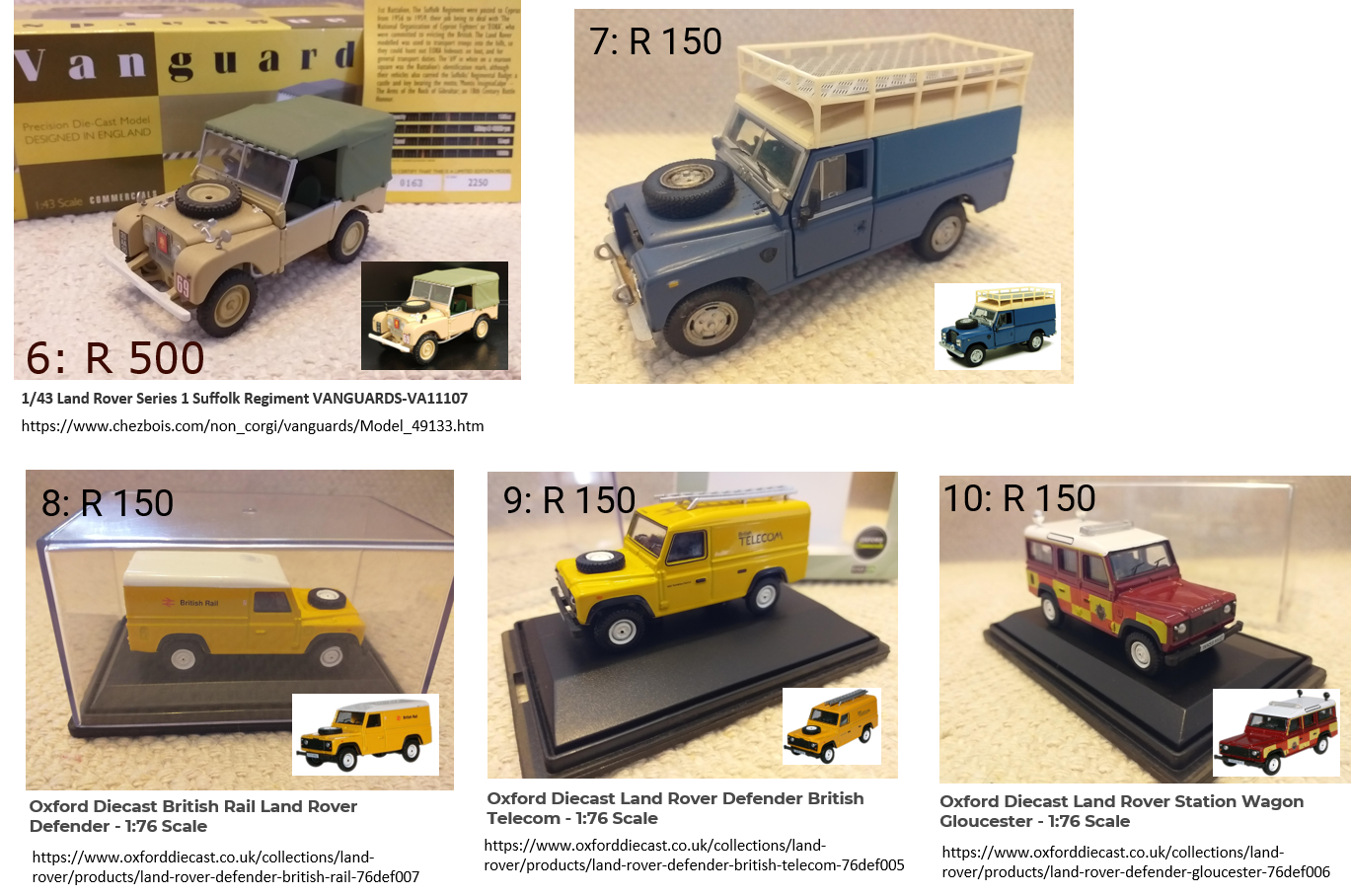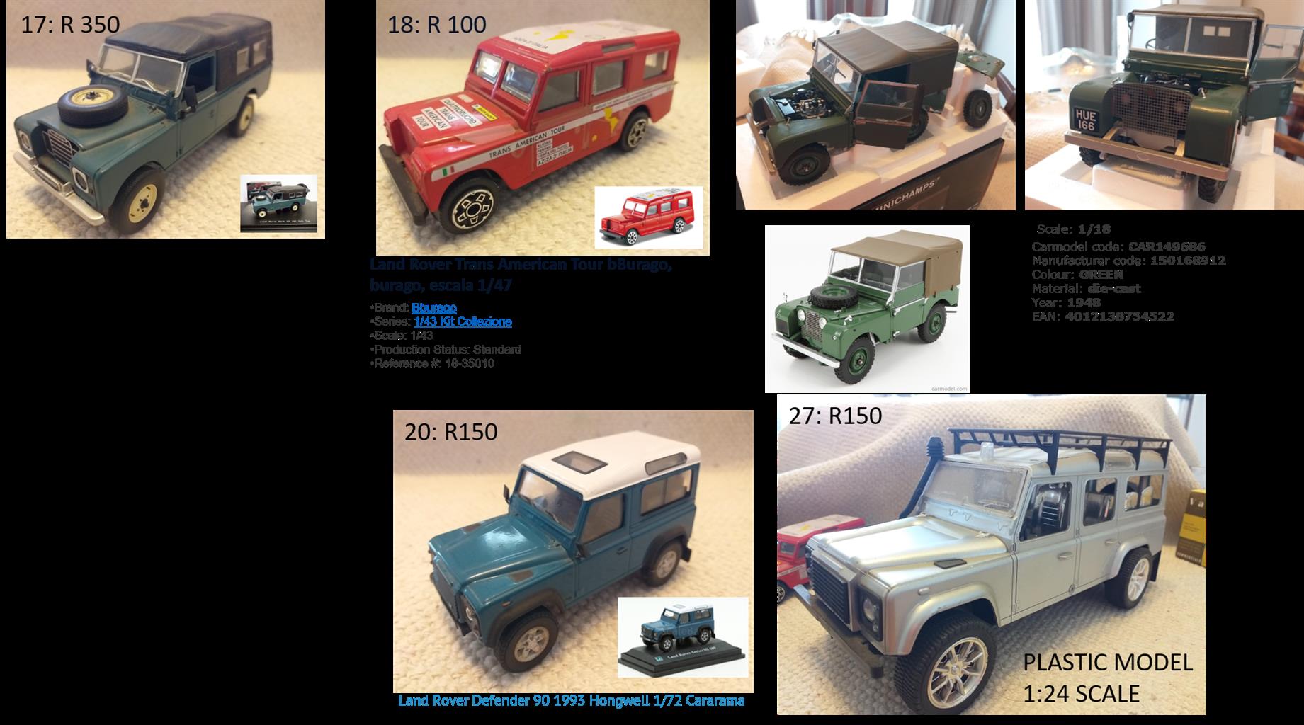 Various Land Rover Defender diecast models from scale 1/76 up to 1/18. Some models still in original packaging.
