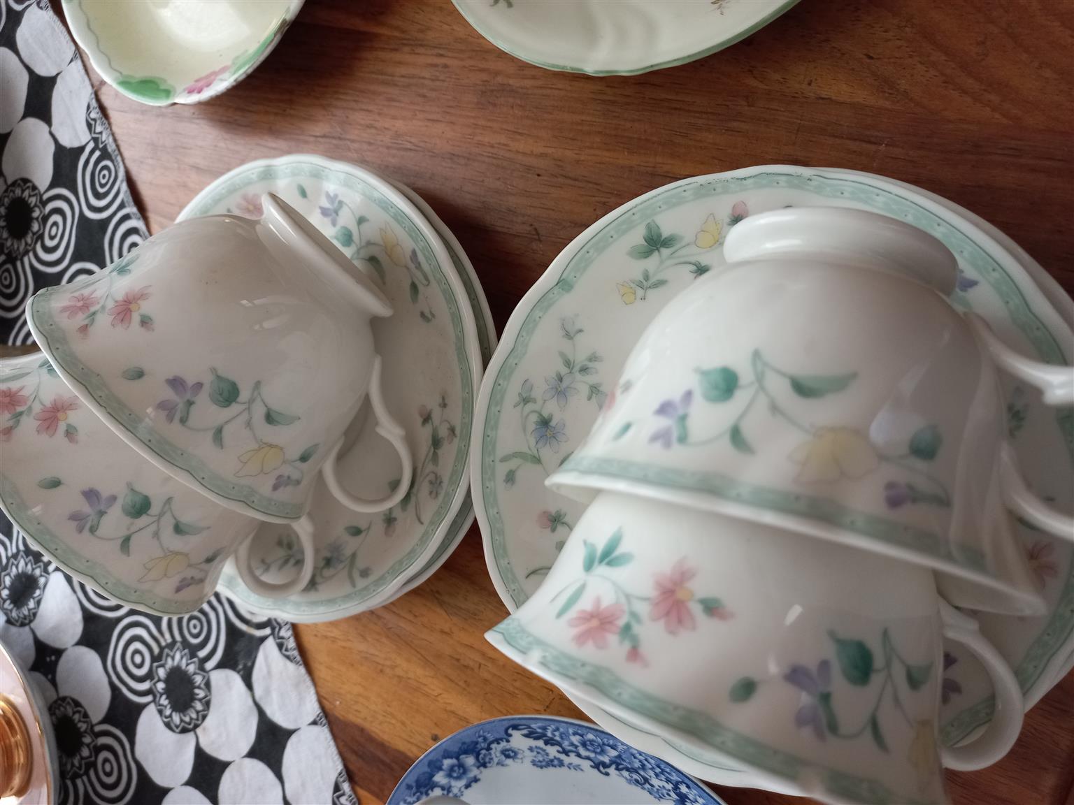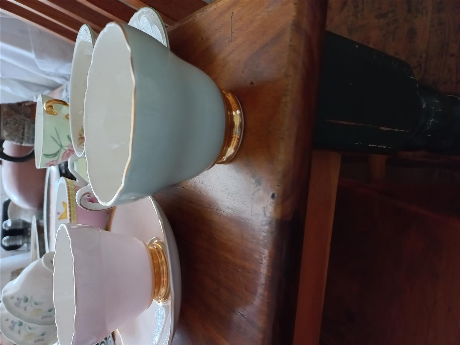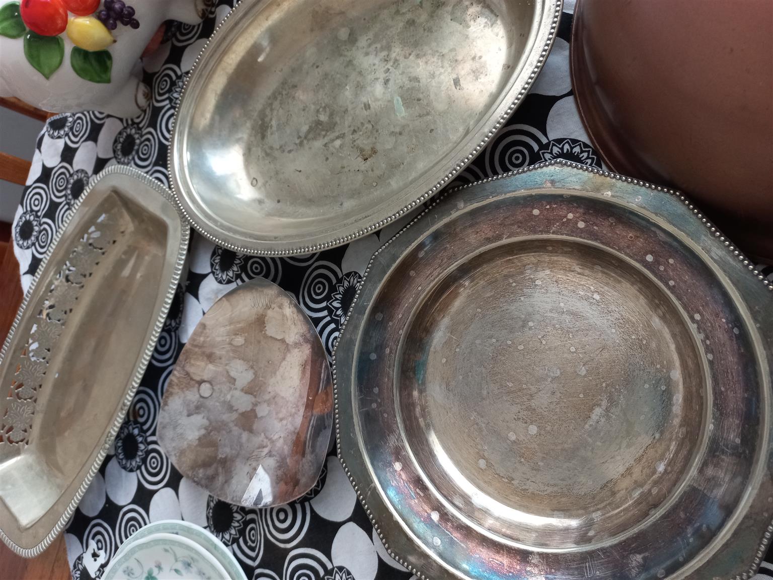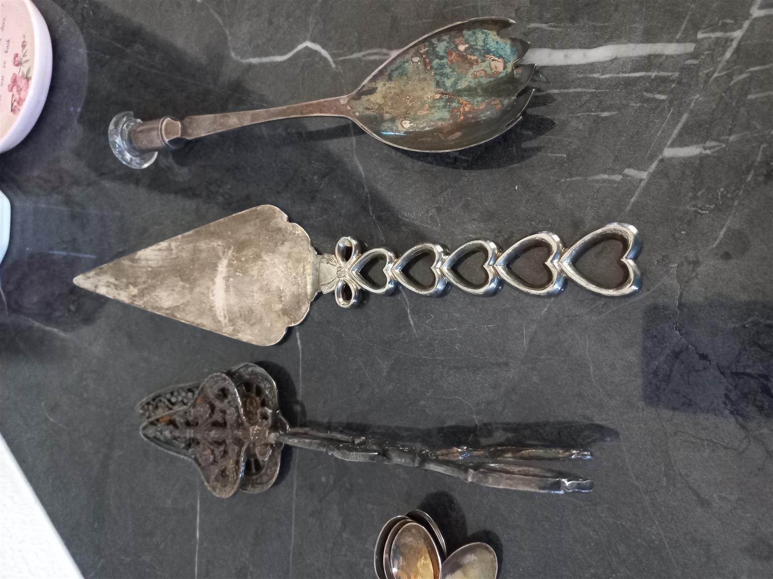 Angora silver plated serving dishes, vintage odd cups and saucers, antique serving spoons and cake lifter ceramic piggy money box whiskey bottle Diana and Charles German beer mug Japan mug. Make me offer to take all