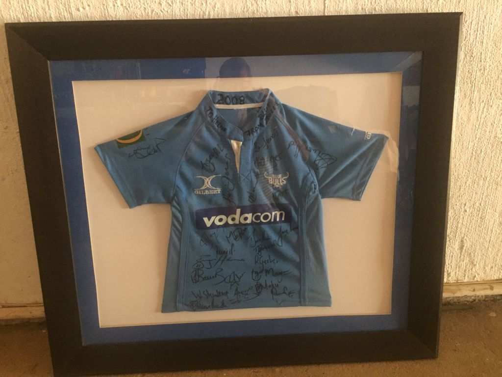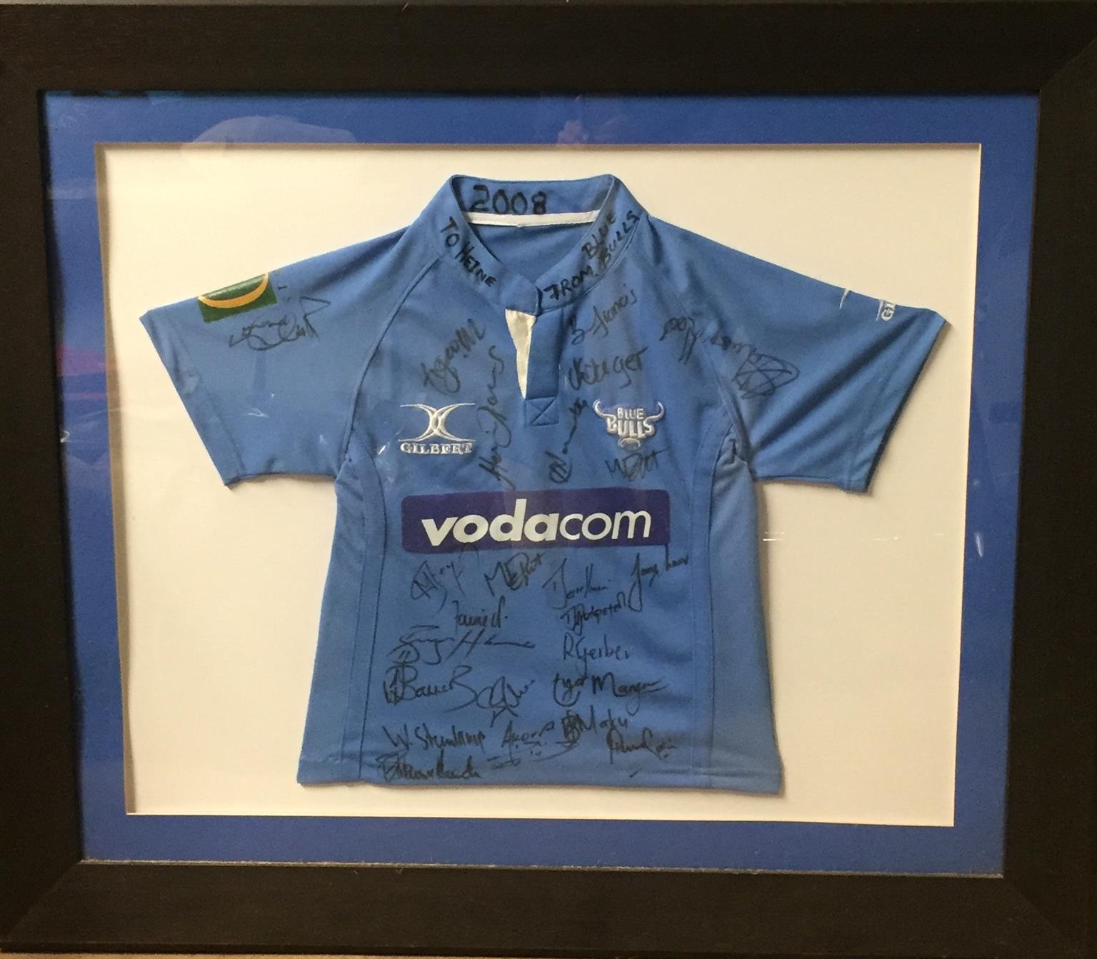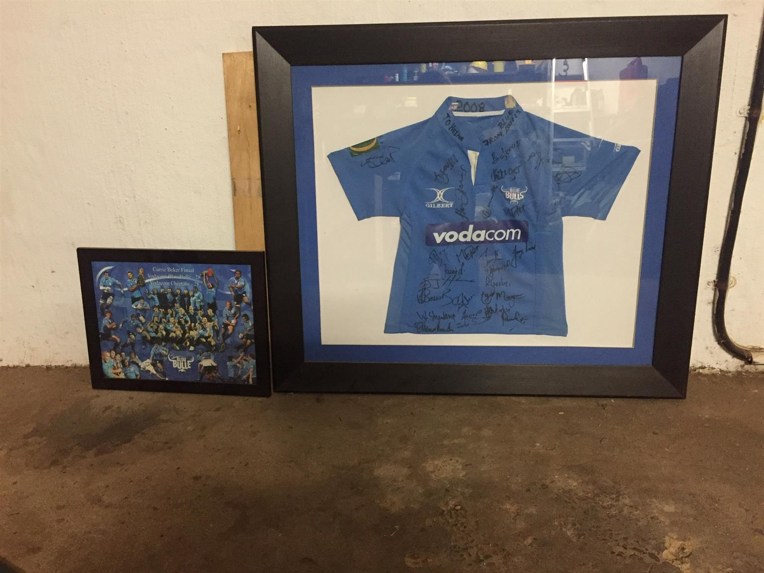 Getekende Blou bull trui te koop geraam en geteken 2008 was vir 9 jarige seun prys R1200 saam 2008 met finale wedstryd wat gelyk op was teen vrystaal geraamde foto