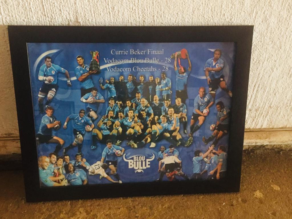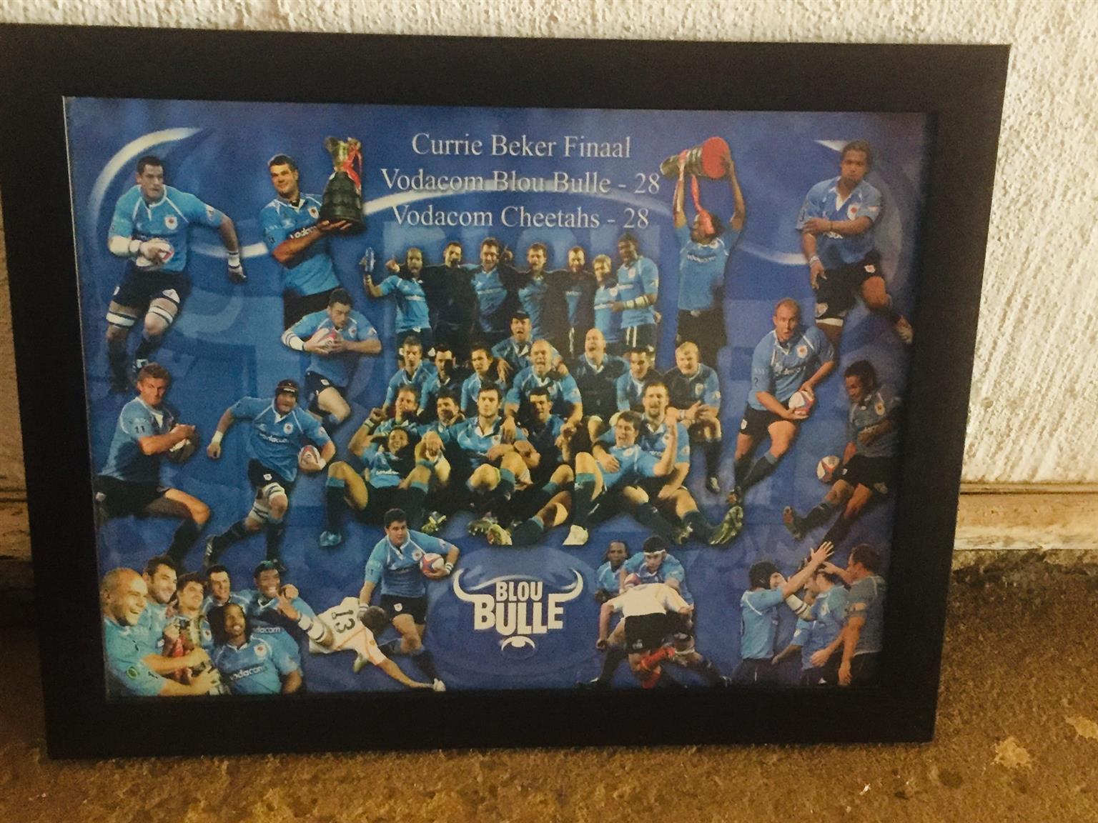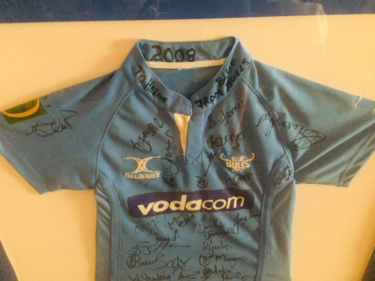 Getekende Blou bull trui te koop geraam en geteken 2008 was vir 9 jarige seun prys R1200 saam 2008 met finale wedstryd wat gelyk op was teen vrystaal geraamde foto