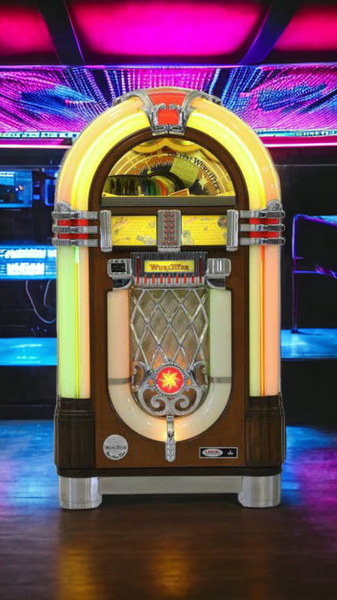 MANCAVE SPECIAL Wurlitzer 1015 Jukebox - CD Version. This classic collectable is considered to be the ultimate Jukebox, a unique, timeless work of art.Recapture the wild cool design stylings of the 50s & 60s with the modern convenience of digital music technology. Whether it is in the home, bar, man-cave, rec-room, gameroom, entertainment area... this modern and updated design of the most beautiful jukebox ever built is sure to enhance the decor / mood of almost any surrounding. Chrome and glitter, rotating light columns with magically changing colors. A fascinating spectacle of light and sound. The commercial-quality CD changer plays all of your favorite music