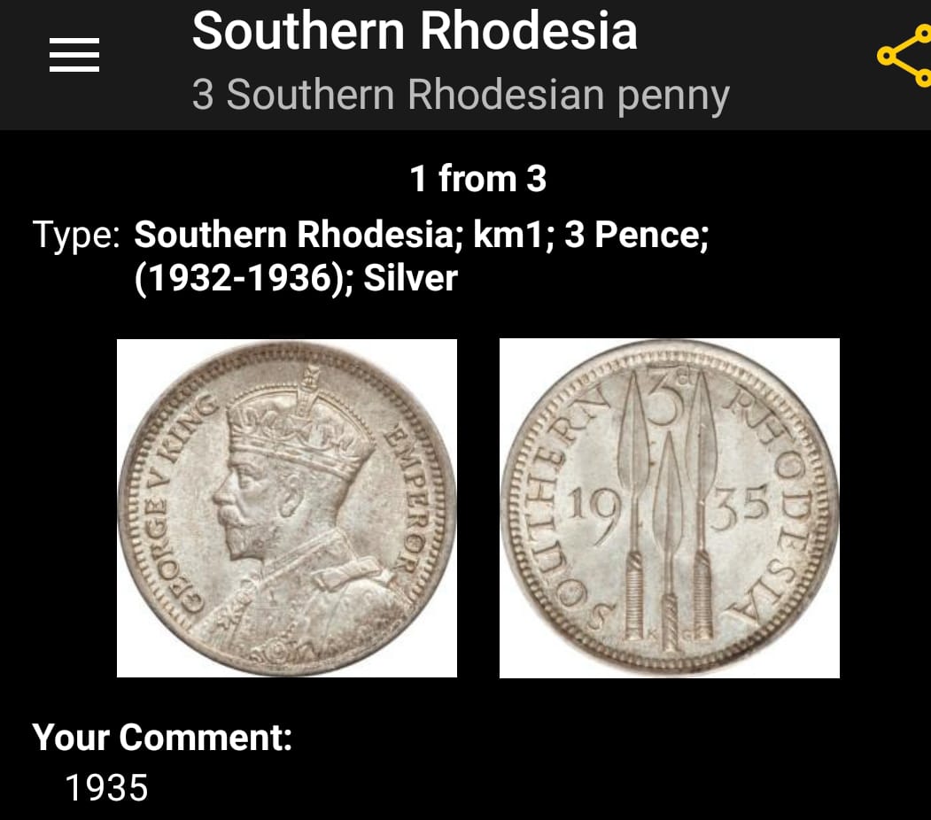 3d (Thrupence) silver Coins 1934 & 1936. King George 5th front and three Assegais (Spears) on the reverse. VF condition.