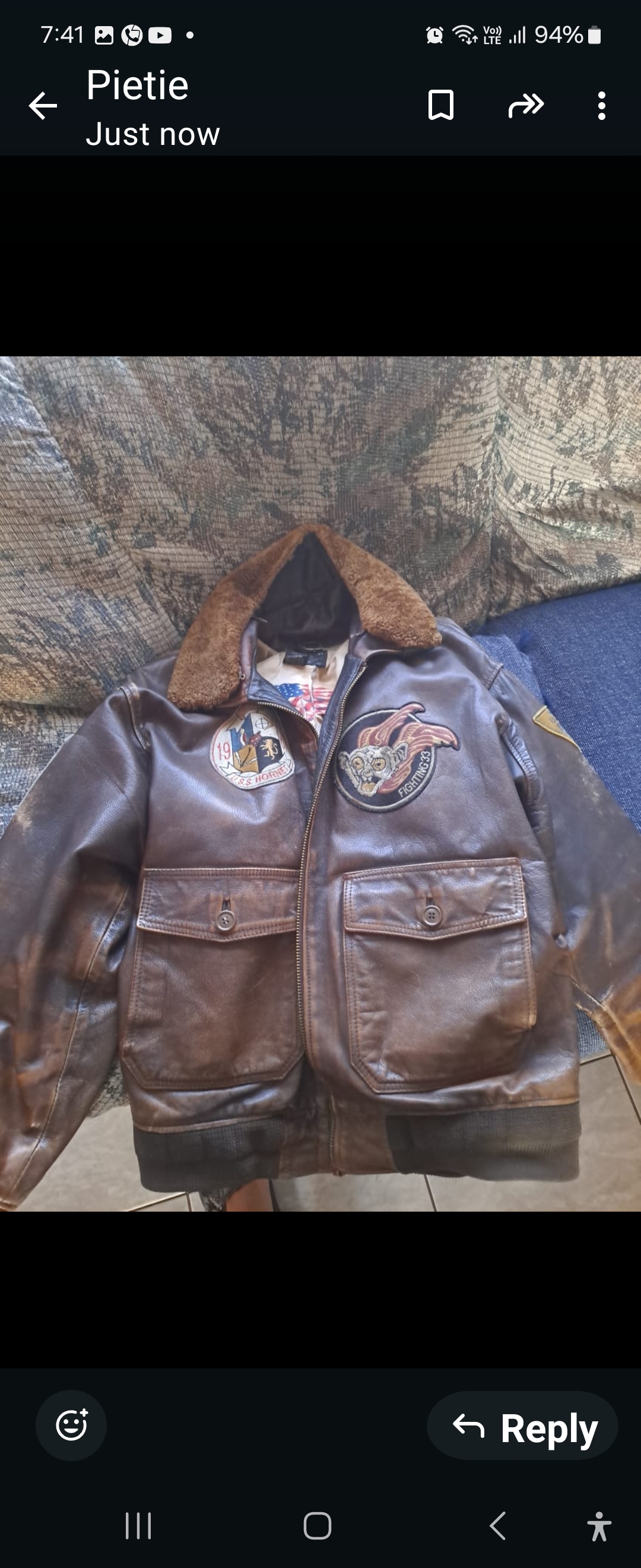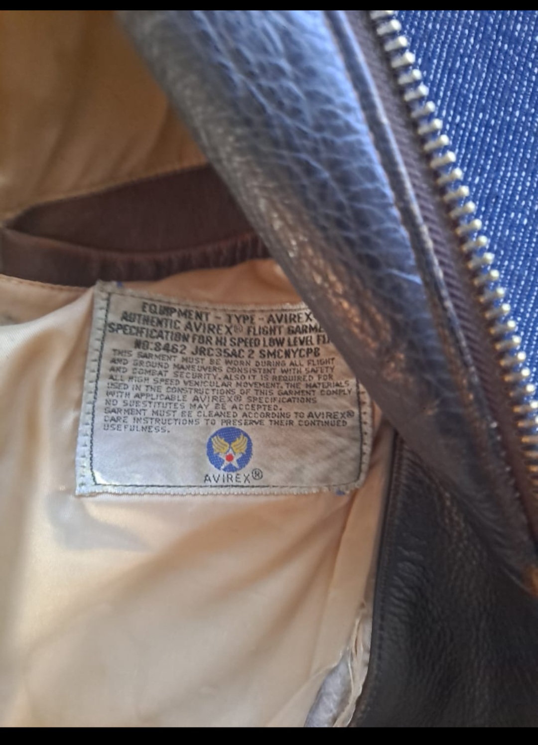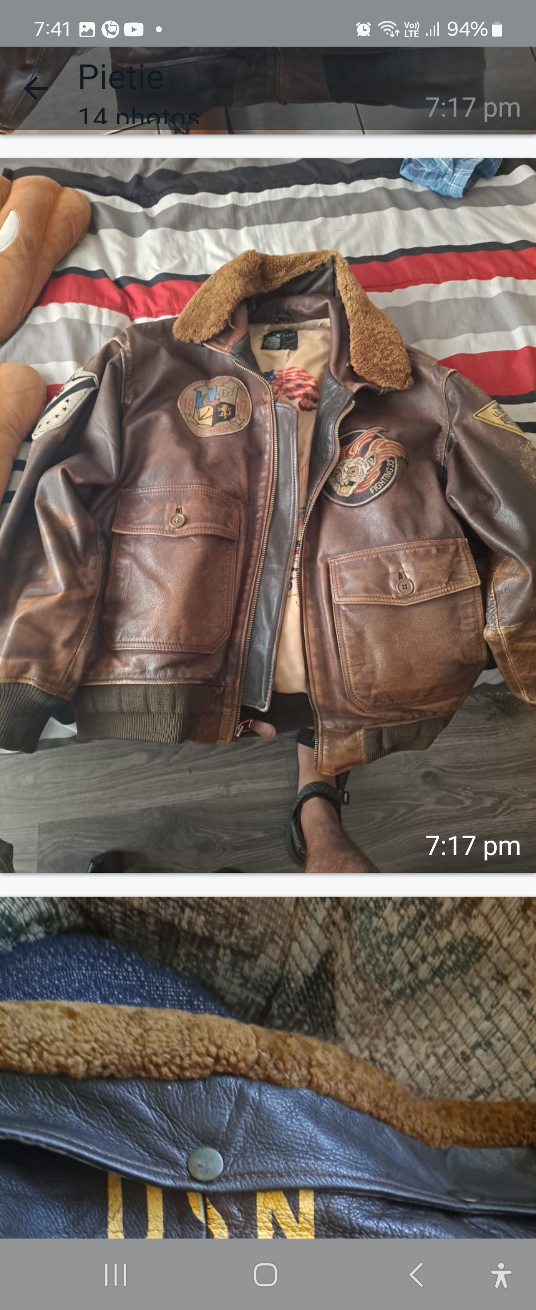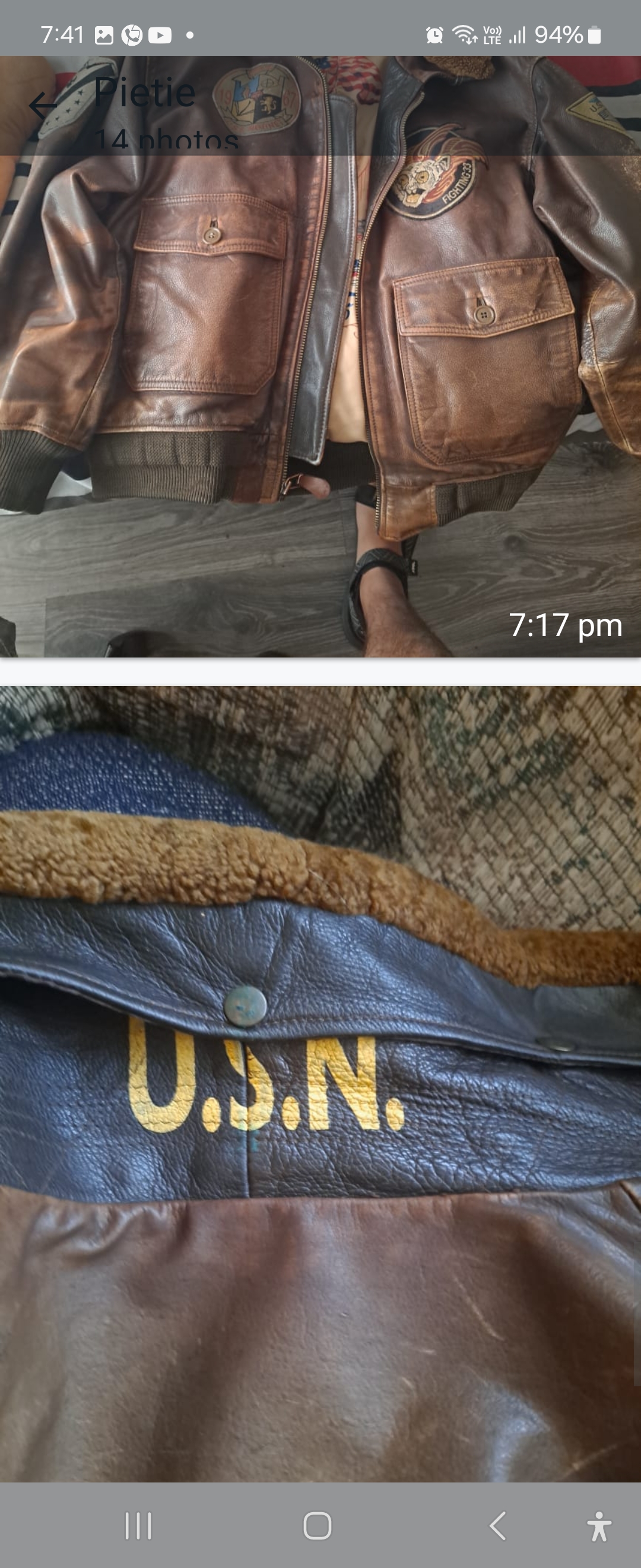 Wearable collectors item navy father and son avirex leather bomber jacket. Father used it in the 2nd world War and it was used later by the son. Size large. Market value R18000.00 Selling for R8000.00 negotiable.