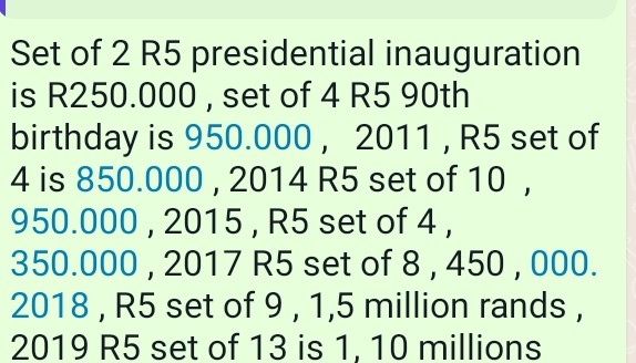 These are south African history Collectibles and includes 1994 presidential inauguration coins , 2008 his 90th birthday coins , 1924 to 2011 coins , 2014 20 years of freedom coins , 2015 Griqua town coins , 2017 O.R Tambo coins , 2018 Mandela centenary coins and 2019 strive for freedom coins thnx for more contacts for potential buyers 0663144020view more no itune card strictly for potential buyers.