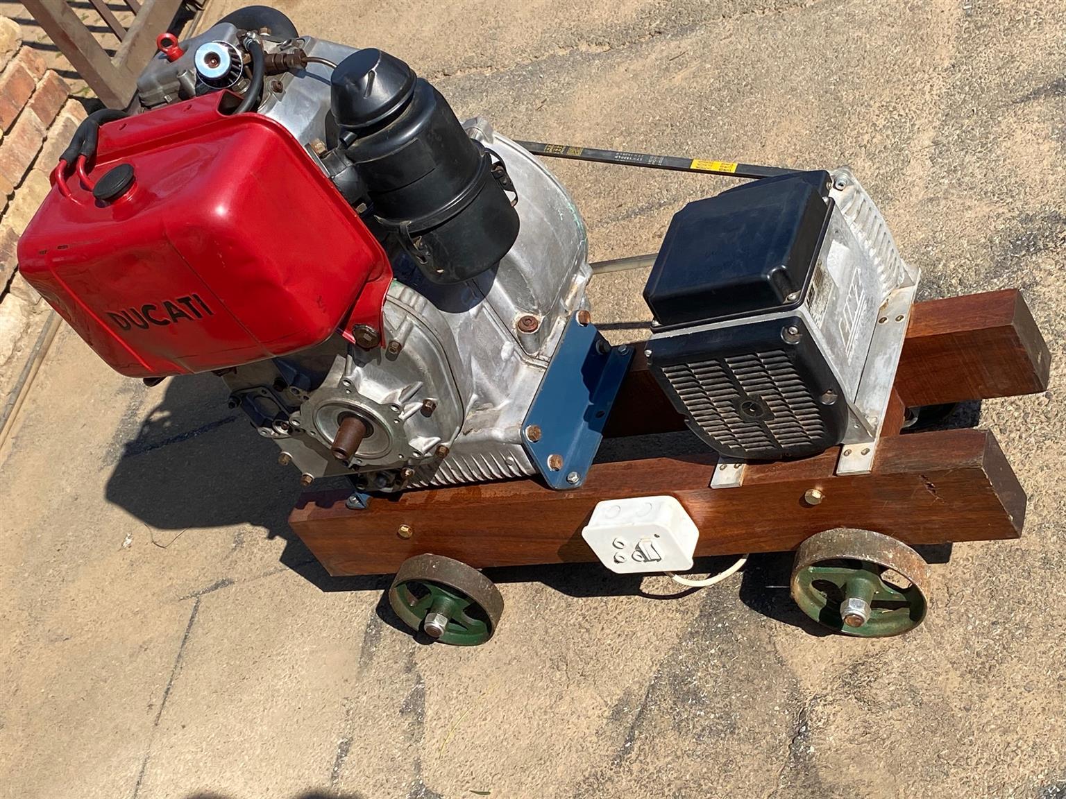 Stationery Engine Ducati Diesel Italian on a wooden frame with cast iron wheels & generator alternator 2,2 KVA 230Volts alluminium engines very scarce & sought after part of Museum Man Cave collection Deceased Estate. Have a few to choose from Antique Vintage Old Classic as per pictures.
