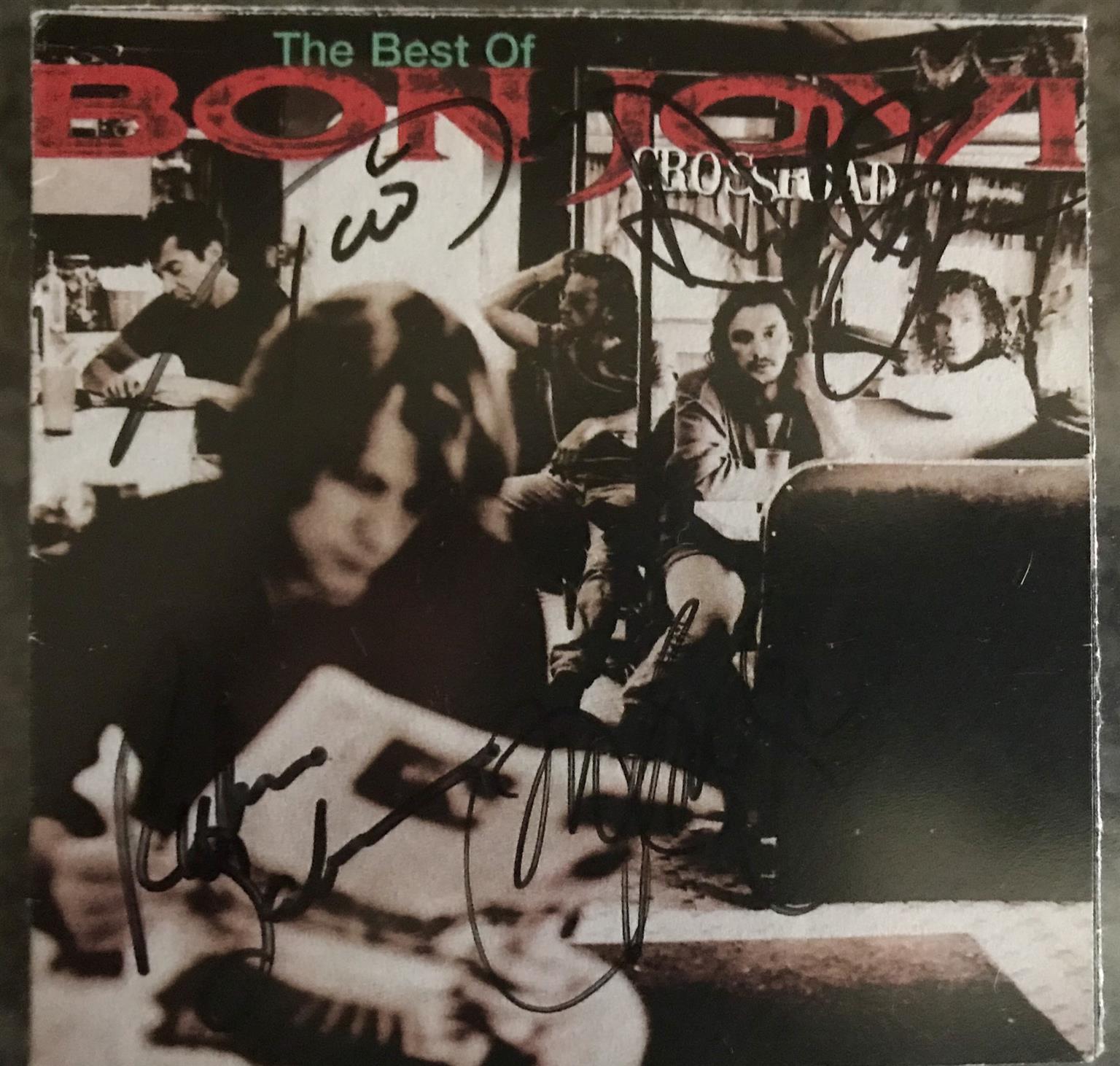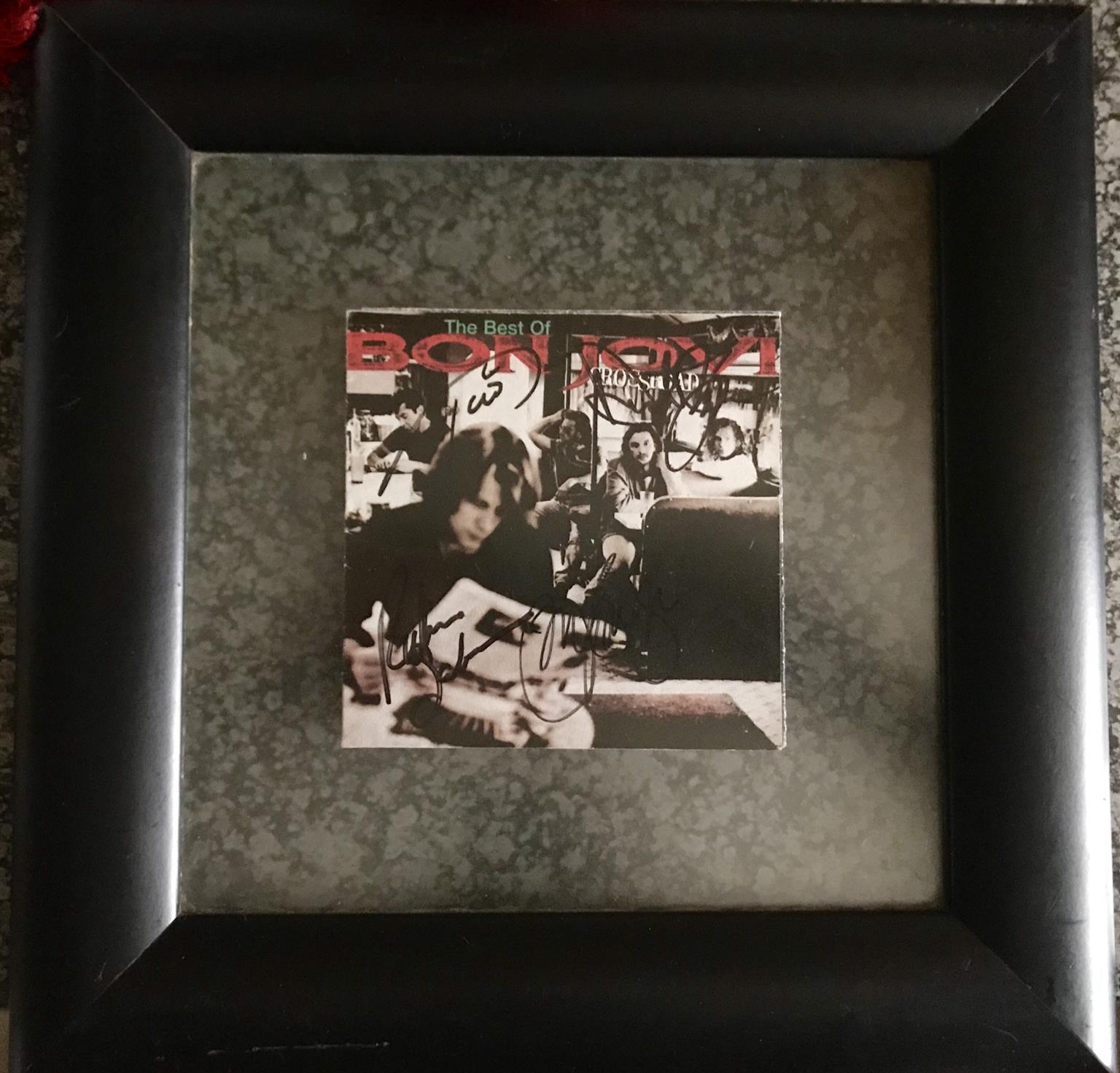 Autographed cd sleeve - the best of Bon Jovi Crossroad. Framed in glass with black wood.