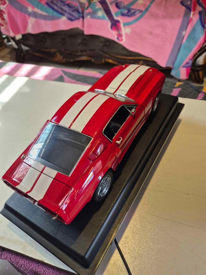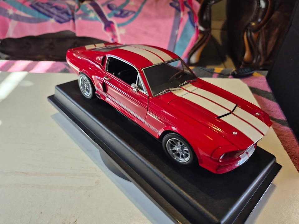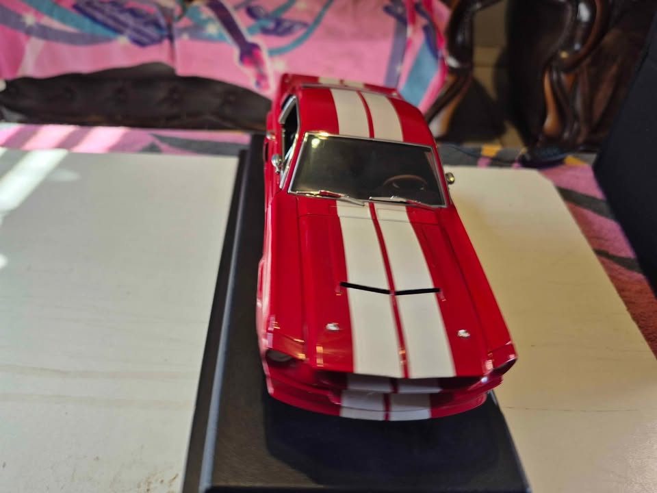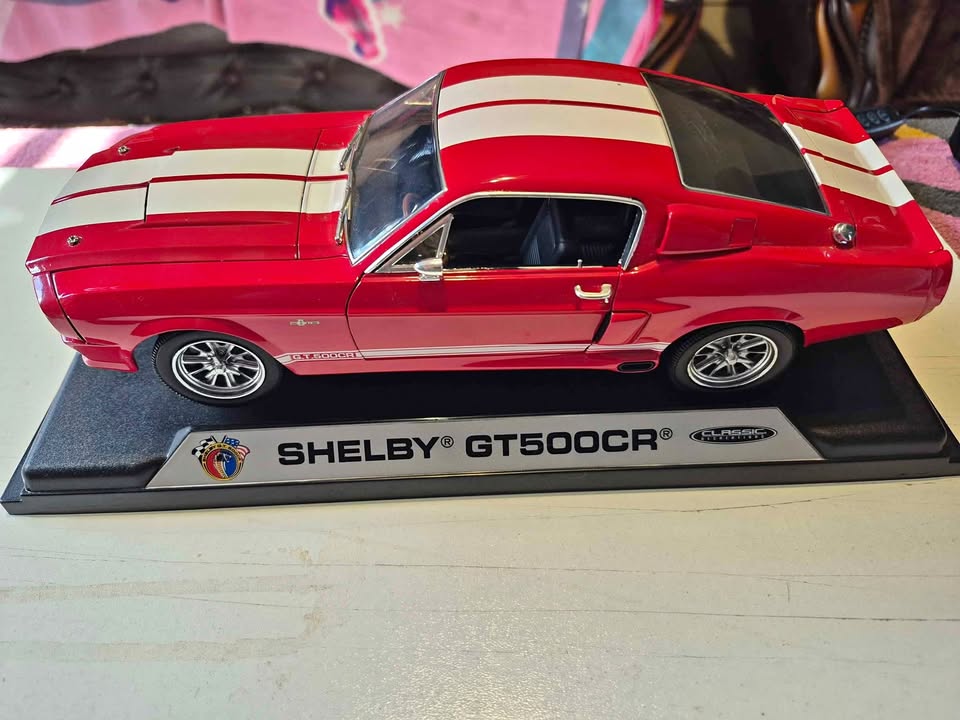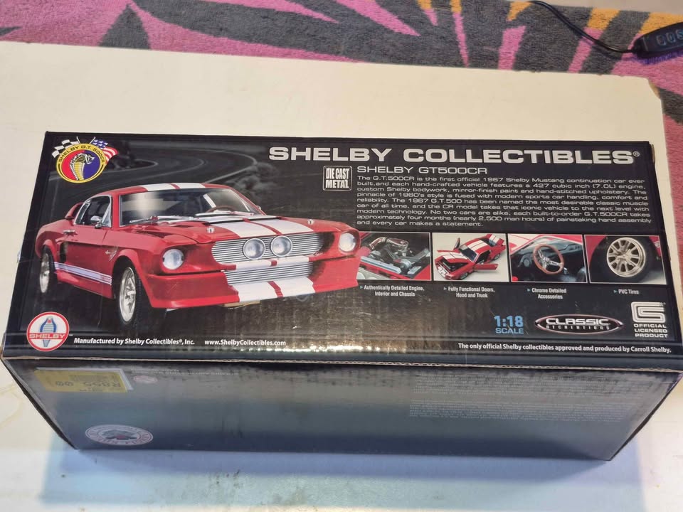 The model is a replica of a 1967 Shelby Mustang continuation car with a 427 cubic inch engine. It is a die-cast metal model with a scale of 1:18. The model features an authentically detailed engine, interior, and chassis, as well as fully functional doors, a hood, and a trunk. The manufacturer is Shelby Collectibles, Inc.