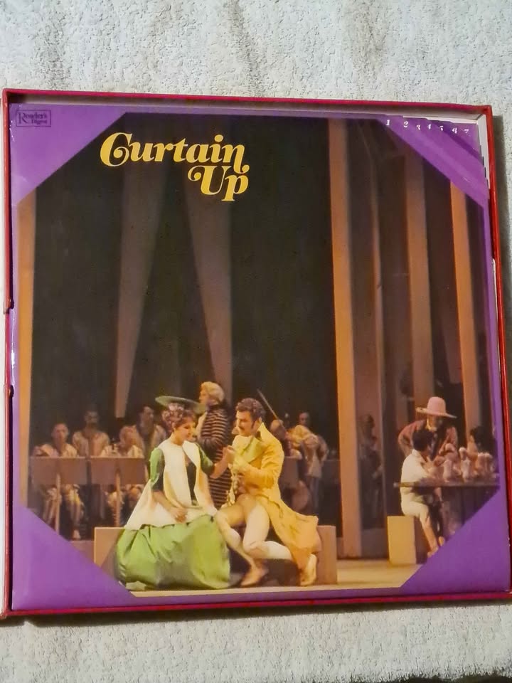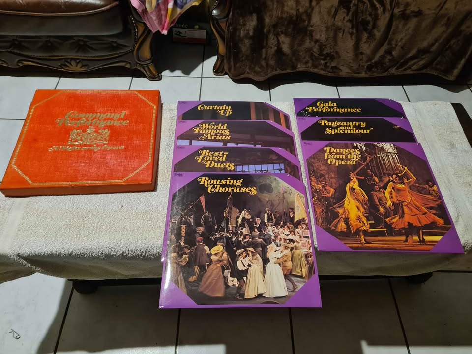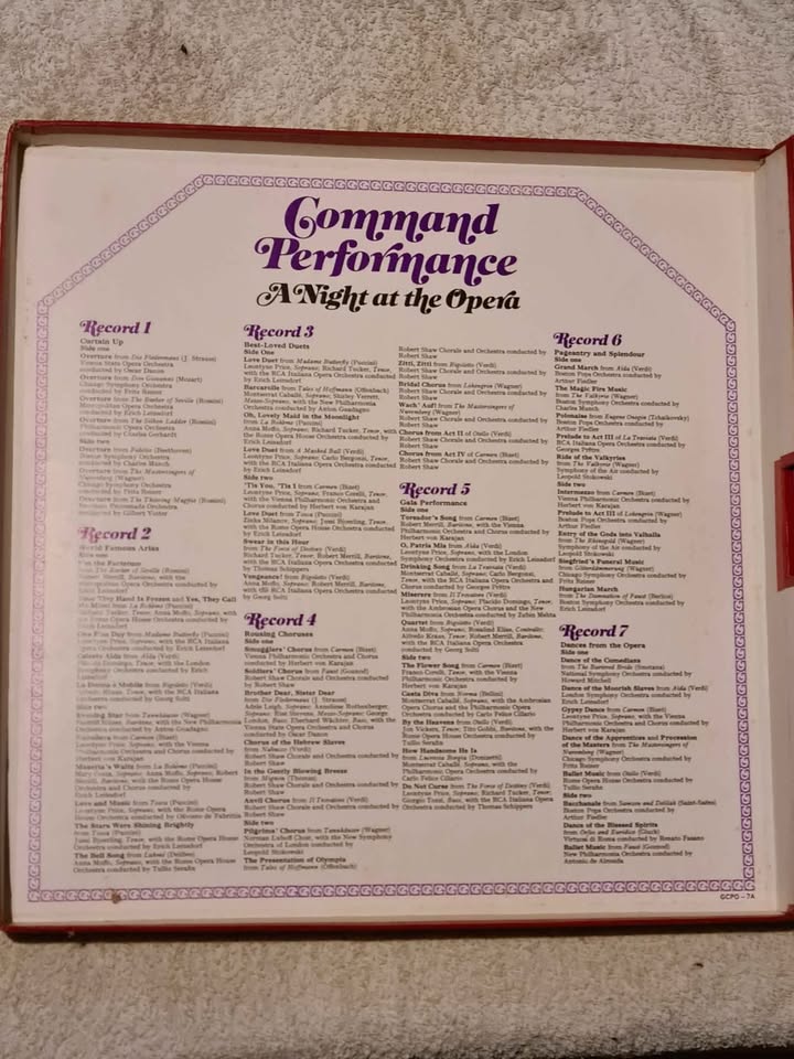 The set is divided into themes, such as "Curtain Call," "World Famous Arias," and "Gala Performance". It includes recordings by renowned opera singers like Leontyne Price, Richard Tucker, Montserrat Caballe and Anna Moffo. The music spans a range of well-known operas, including "Madame Butterfly," "The Barber of Seville," and "La Boheme". "Command Performance" as a term dates back to Queen Elizabeth I, referring to performances for the monarch. The box set is considered rare and collectible.