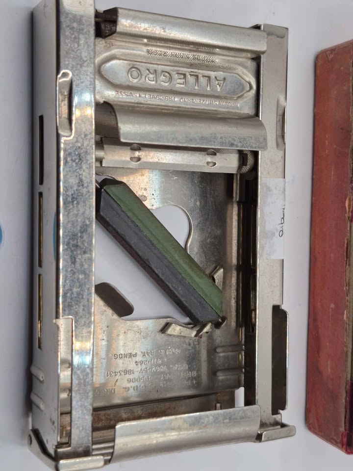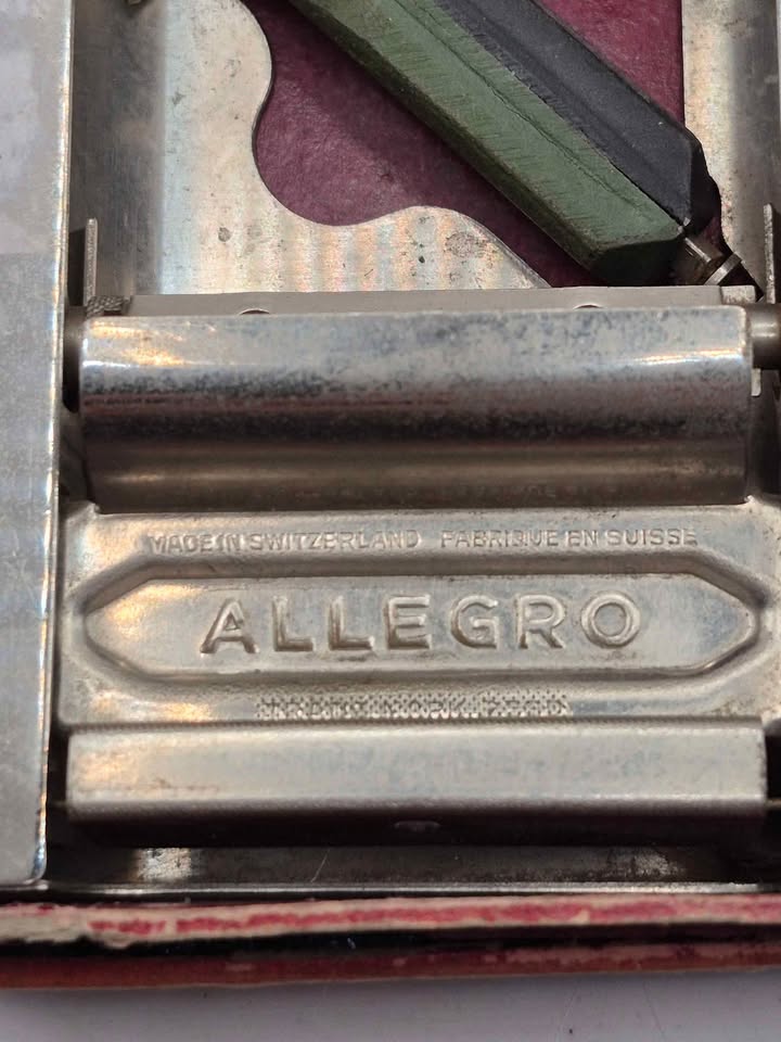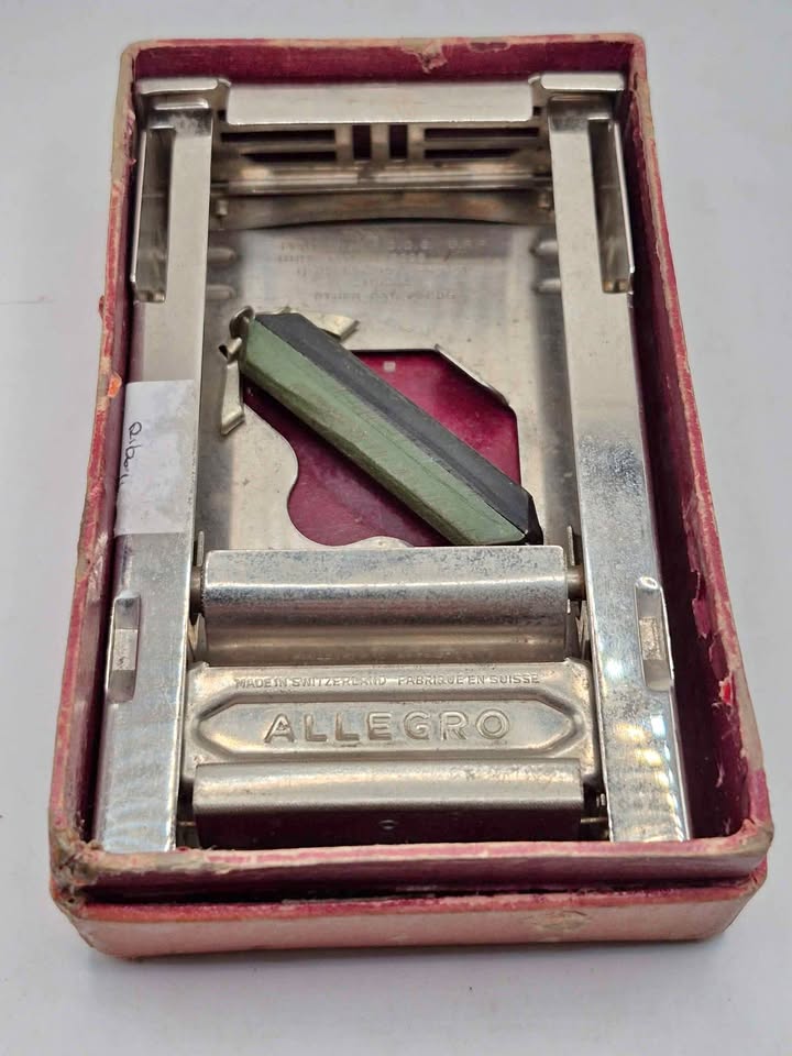 This particular model is a Swiss-made Allegro sharpener, as indicated by the "Made in Switzerland" inscription. It features a two-sided mechanism, typically with a sharpening stone on one side and a honing leather on the other, designed to sharpen double-edged blades. These sharpeners were popular for extending the life of razor blades during a time when disposable blades were less common. Vintage Allegro sharpeners are often sought after by collectors and enthusiasts of traditional shaving tools.