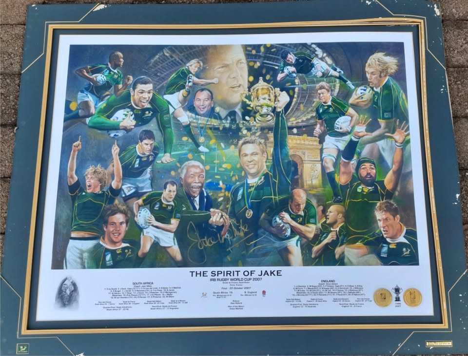 Rugby 2007 Memorabilia Print. Signed by Jake White. No frame, backing board needs to be replaced. Make me an offer. R1 is not the price. No chancers. You can watsapp me on .