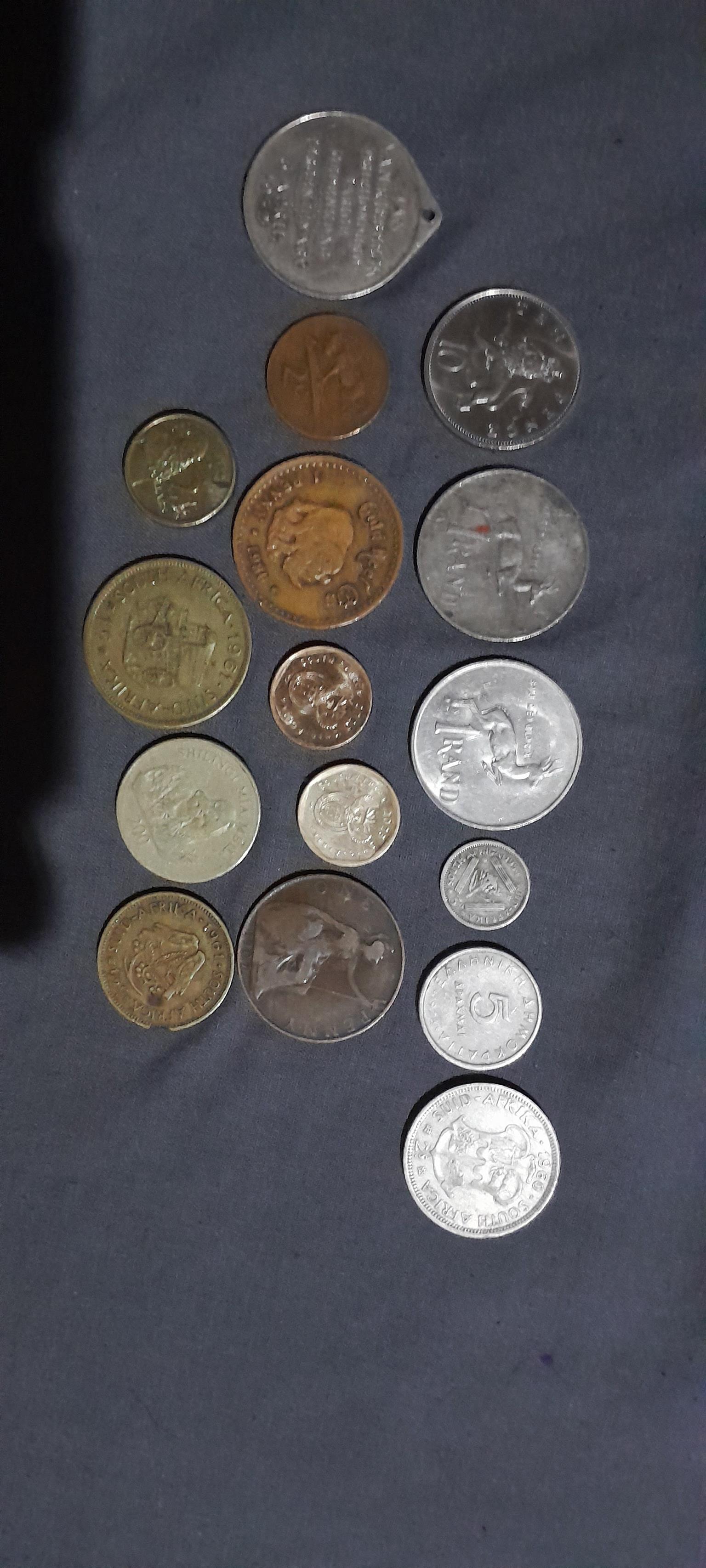 Silver & Nickel, Australia(1984 )$1, (2005) $2, zanzibar (1998 ) Shilinga 200, South Africa (1961) 1c, (1961) ½c, (1967) 2c, (1990) R1, (1979) R1, (1970) 50c, (1960) 2c, (1954) 3d, Singapur (1989) $1, Greek (1978) 5, British (1985) £1, (1907) 1penny, (1990) 5 pence, (1983) 10 pence, Gold Reef City (1986) 1penny, Jan van Riebeeck Tercentenary (6 April 1952)