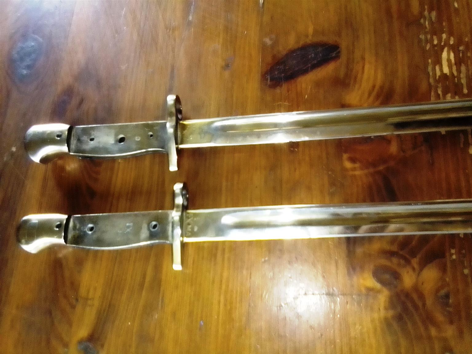 Two copper plated WW1 Bayonets, one stamped 1907. Very nice pieces. Have only one wood handle on each. Still very nice.