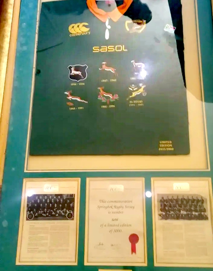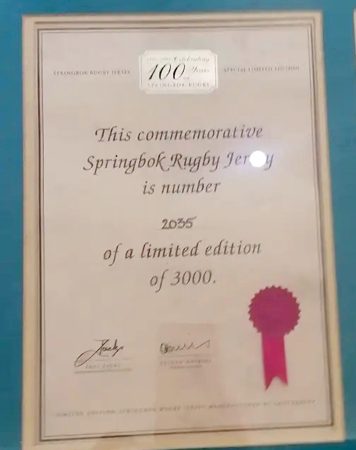 This is an original Springbok Emblem 100 years (1906 - 2006) anniversary Jersey !! The jersey depicts the different Springbok Emblems (Quality Embroidered) used on the official Springbok Jerseys issued to Springbok rugby players over the period 1906 - 2006. The item is authentic, high quality, a CERTIFIED LIMITED EDITION (#2035/3000), undamaged and comes with an Official Certificate verifying its authenticity and that it is part of ONLY 3000 Jerseys of this kind officially issued ever. It also comes with pictures of the 1906 Springbok Rugby team AND the 2006 Springbok Rugby team. Make me a offer...