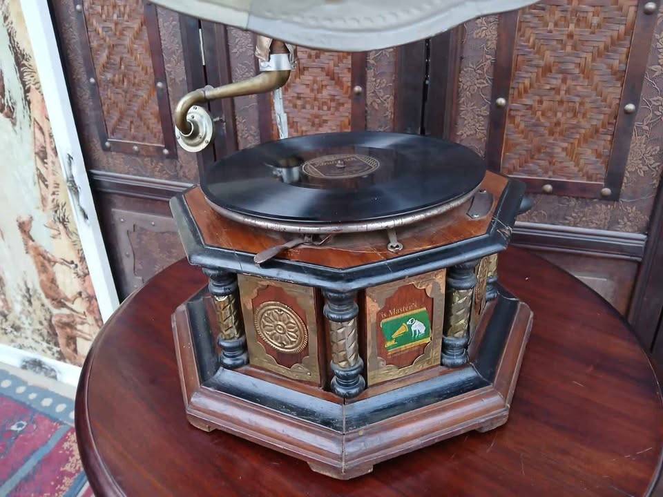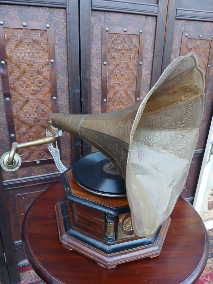 Beautiful vintage-style gramophone with a detailed brass horn and wooden base. Perfect as a decorative piece or for collectors of antique-style items. Adds charm and character to any home or office space.