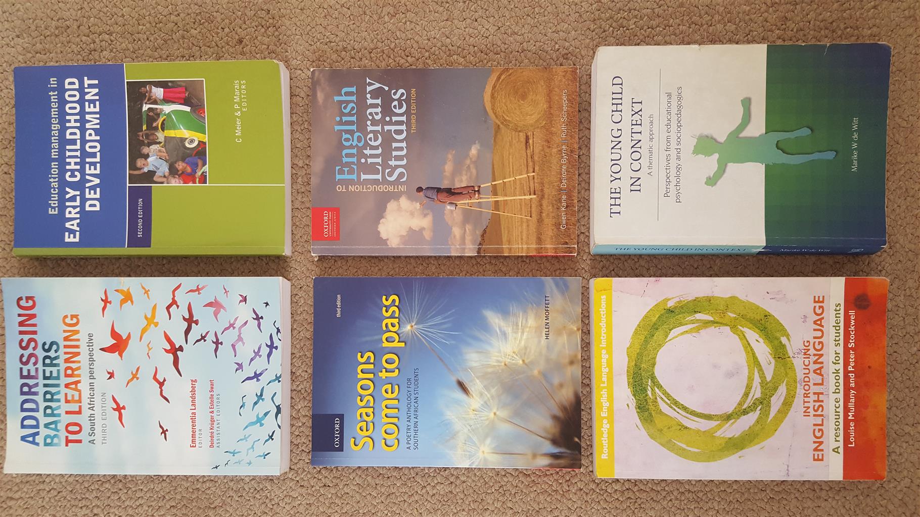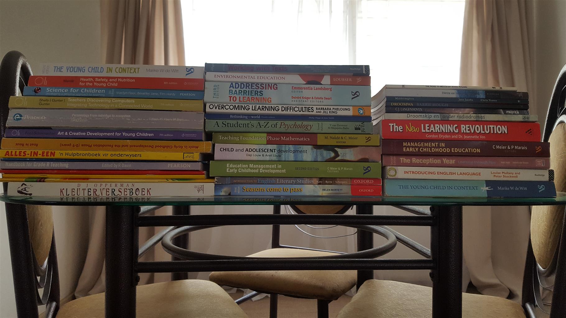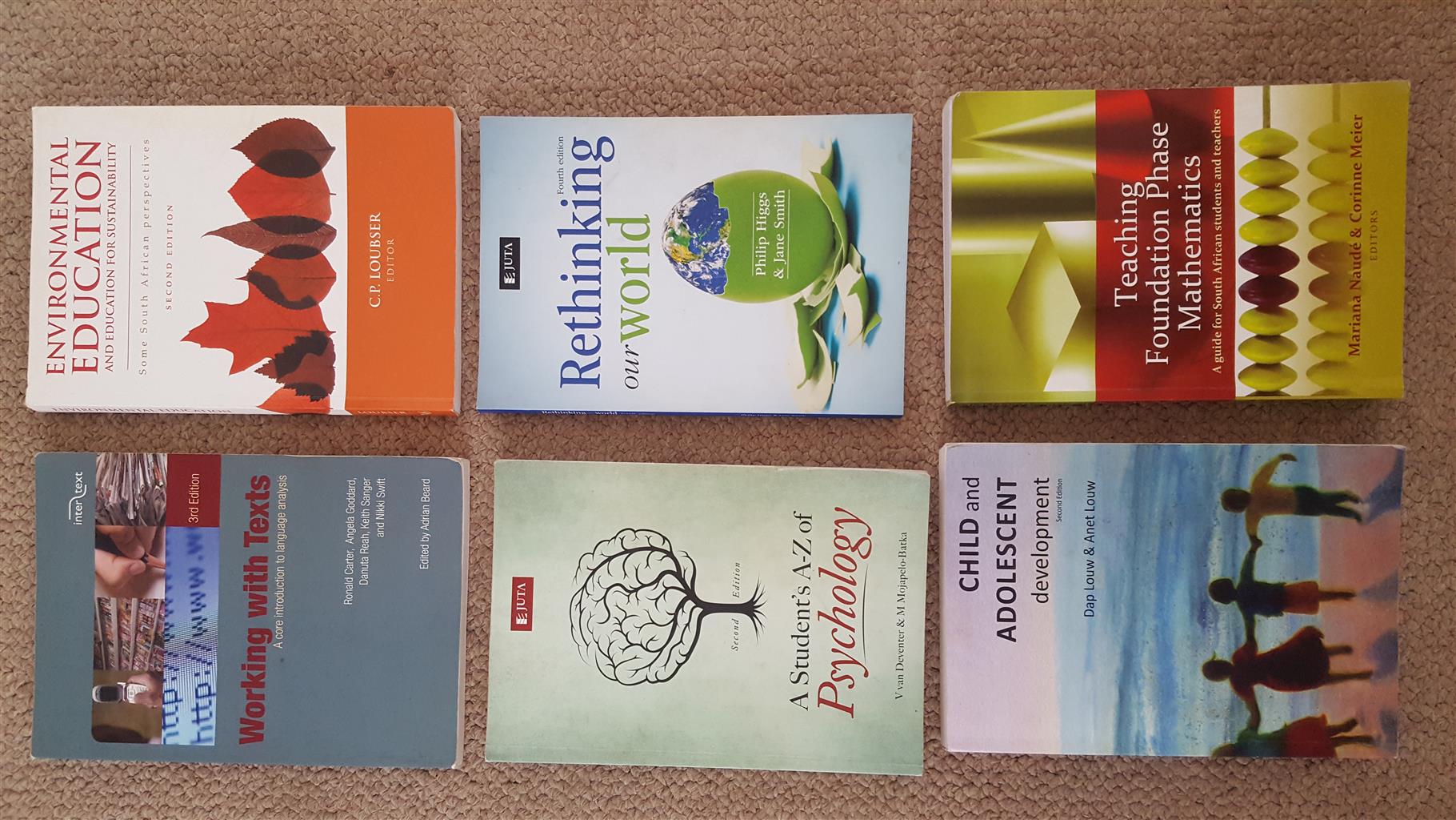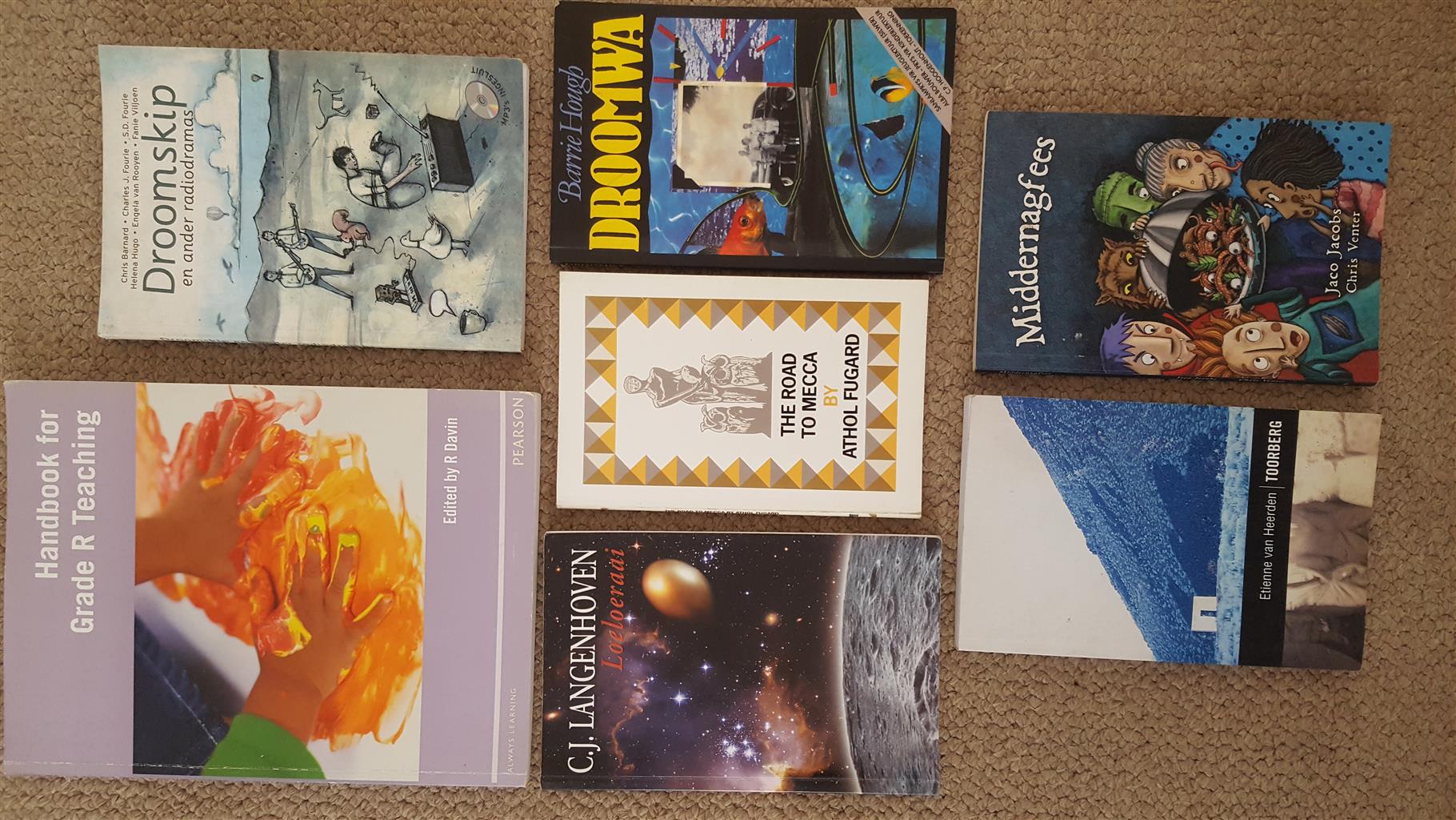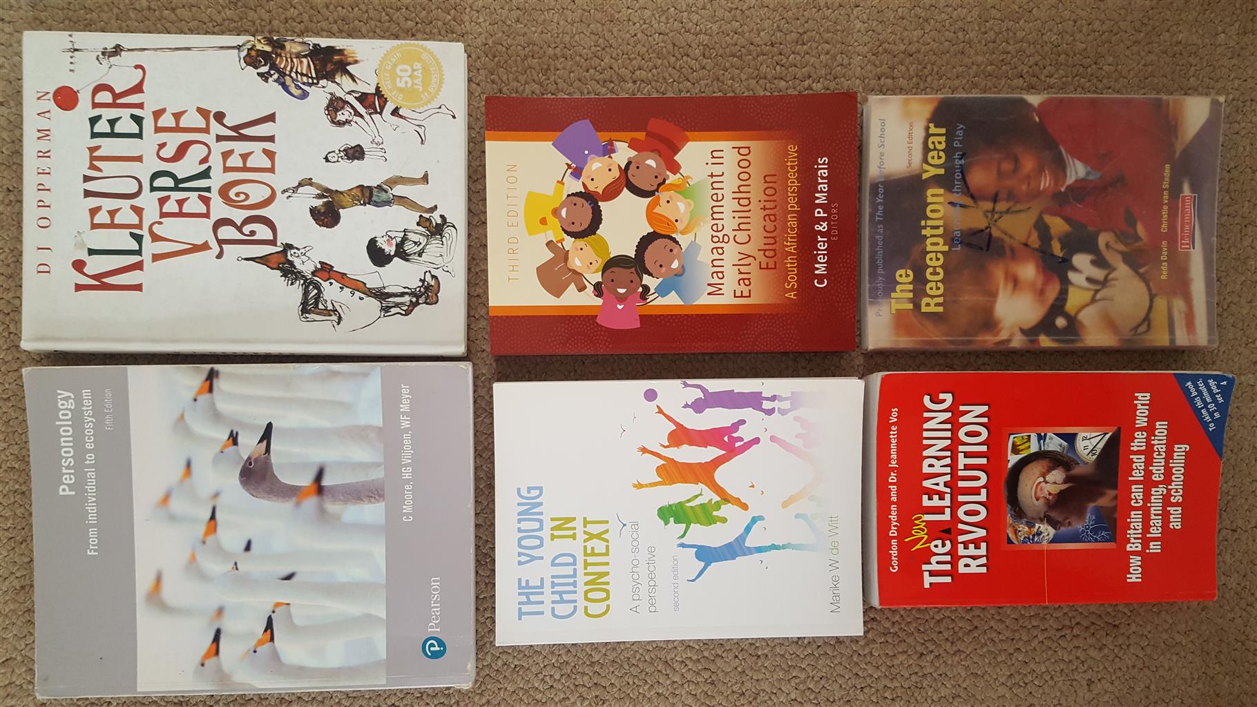 Middernagfees R60. The young child in context R220. Working with texts R180. Environmental education for sustainability R150. Music in early childhood development and foundation phase R350. Education management in early childhood development R210. Introduction to English literary studies R150. Seasons come to pass R150. The road to Mecca R110. Teaching foundation phase mathematics R210. Child and adolescents development R220. Science for children development, a personal approach to teaching R500. Management in early childhood education R240. The new learning revolution R80. Introducing English language, a resource book for students R160. Art and creative development for young children R120. Personology from individual to ecosystem R320. Teachers discovering computers integrated technology in a connected world R420. Health, safety and nutrition for the young child R480. The young child in context,a mathematical approach R170. A students A-Z of psychology R120. Rethinking our world R80. Overcoming learning difficulties R260. Addressing barriers to learning R270. Loeloeraai by C.J.LANGENHOVEN R80. Droomwa by Barrie Hough R60. Toorberg by Etienne van Heerden R120. Droomskip en Ander radiodramas R120. The reception years, learning through play R140. Handbook for grade R teaching R120. Kleuter verse book R120.