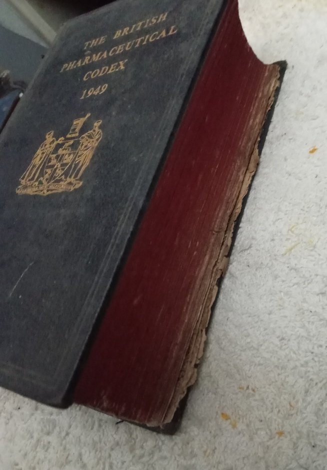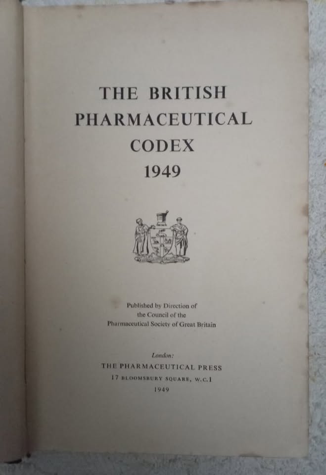 The British Pharmaceutical Codex 1949 published by Direction of the Council of the Pharmaceutical Society of Great Britain 1562 plus pages Condition : no fly leaf ; 1 loose page ; inside has foxing ; last few pages worn at edges R160 Postage : by the courier of your choice Postnet /Courier guy/Express etc...plus R10 for packaging if local = Durban Westville = collect / deliver Contact Toni or steve at Email Cell or or