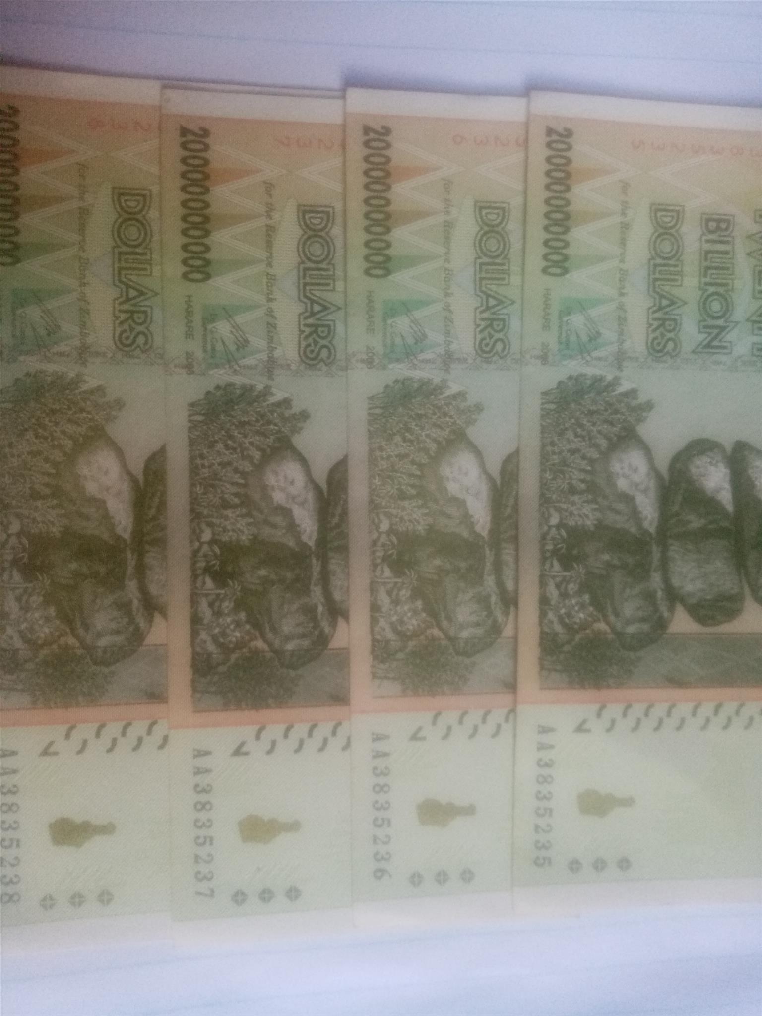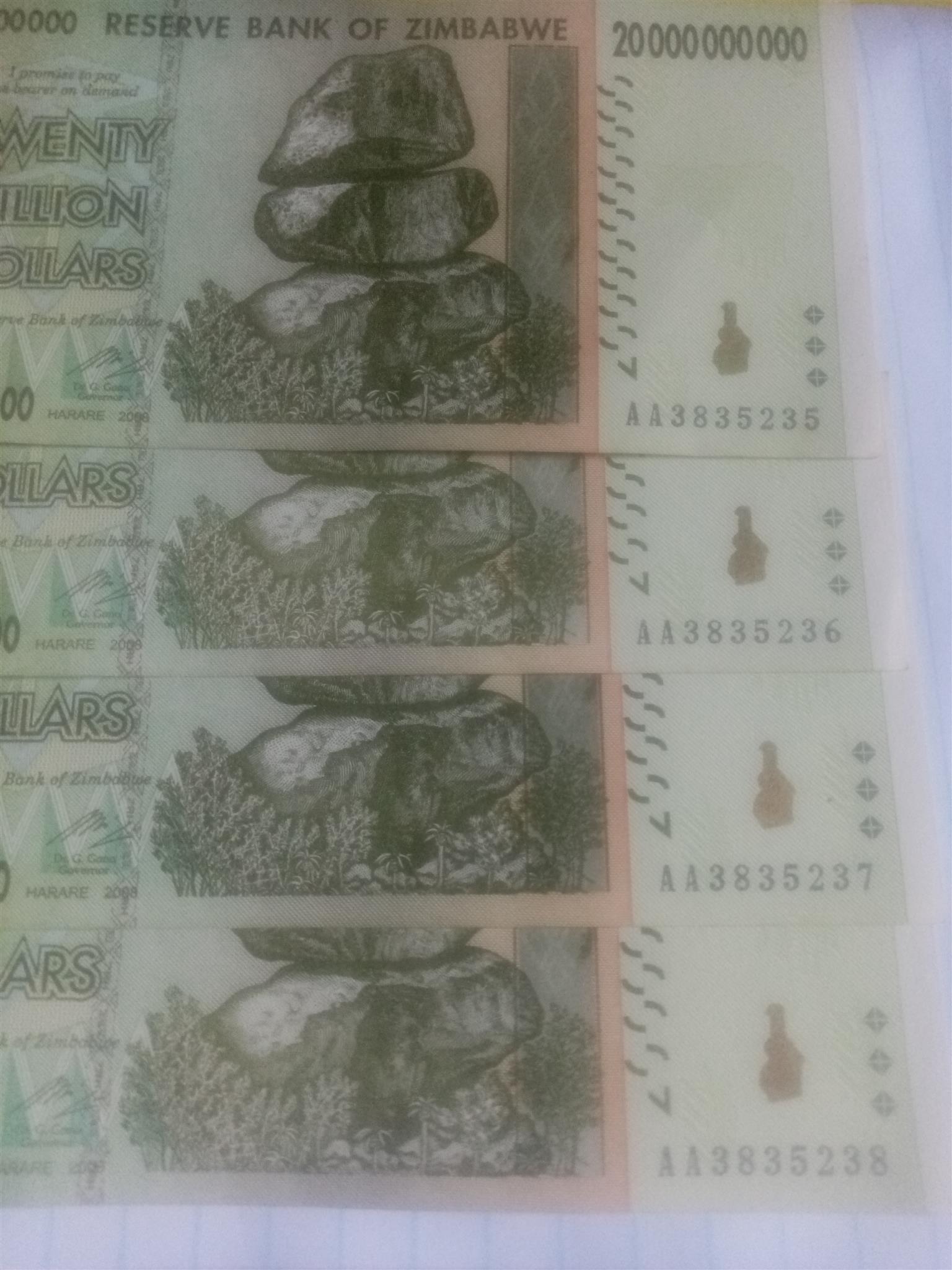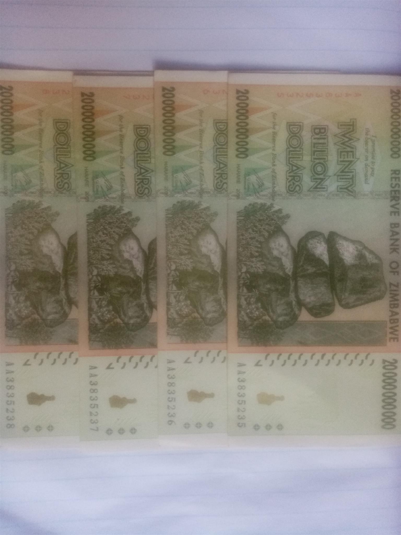 Hi all I'm selling a 2008 collection of twenty billion dollars of Zimbabwe in there consecutive order serial number follow after each other VEARY RARE find. Make me a offer 0653433442view more