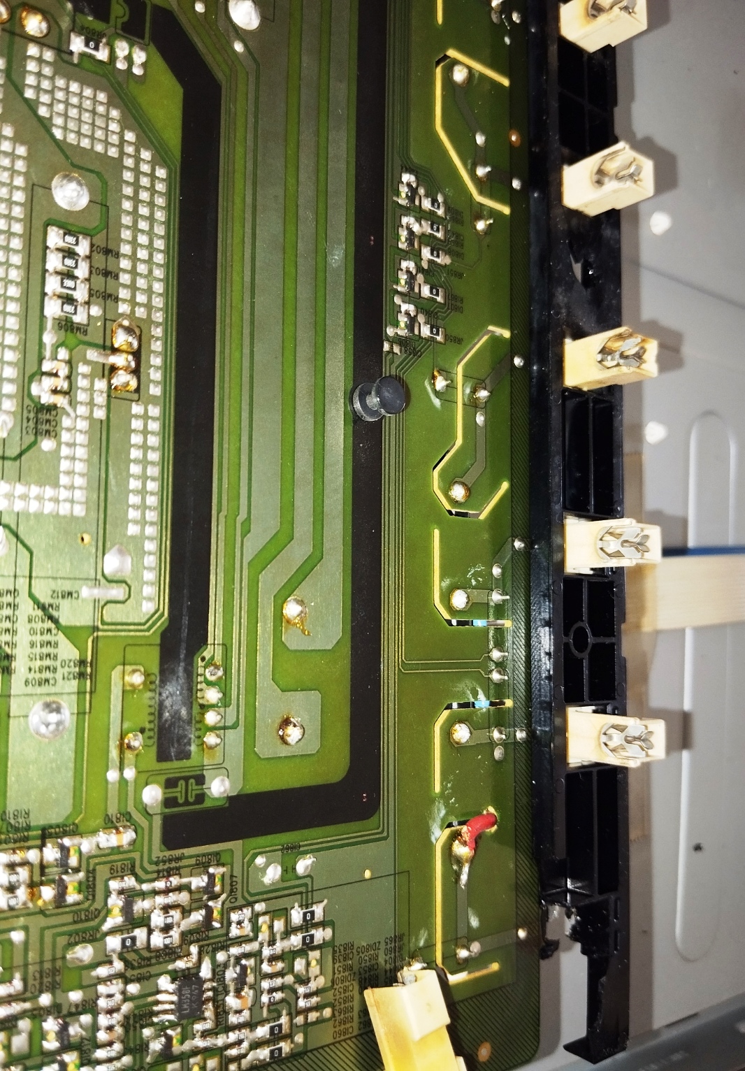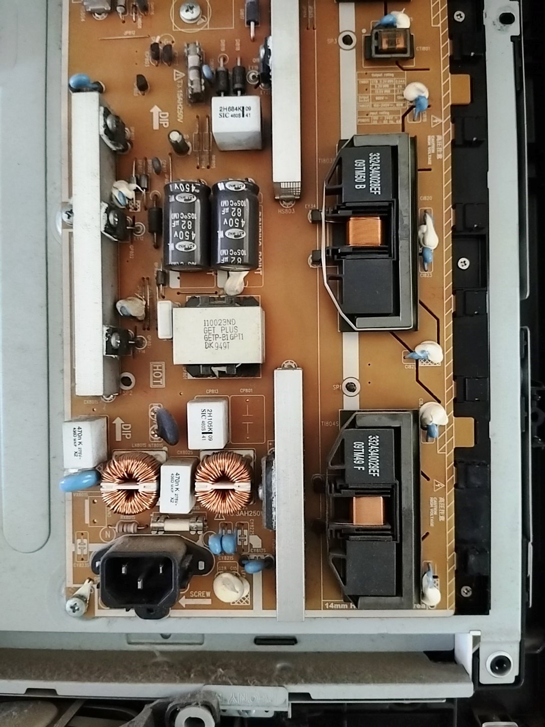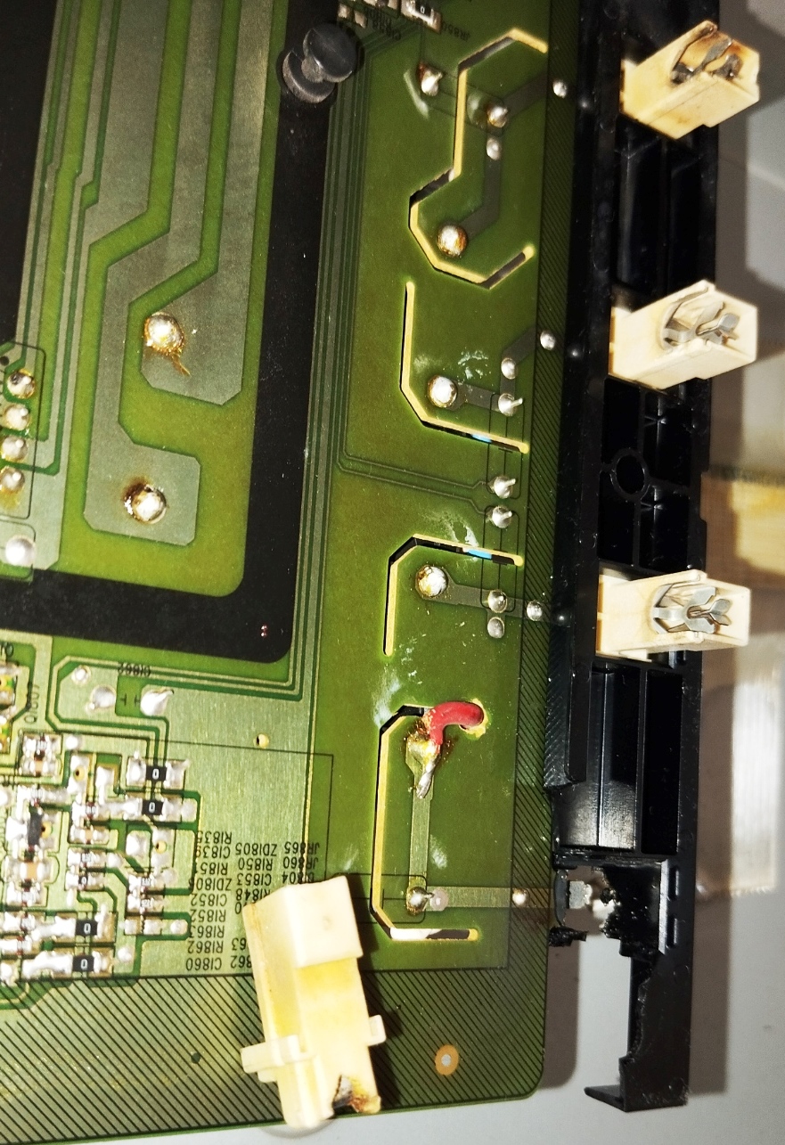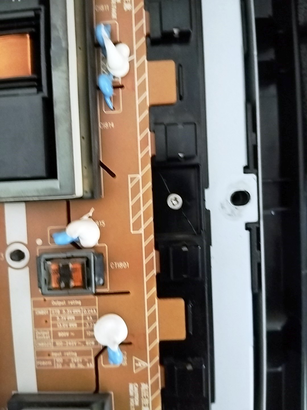 Power PCB seems to be faulty. Backlighting faulty with a broken post or two.