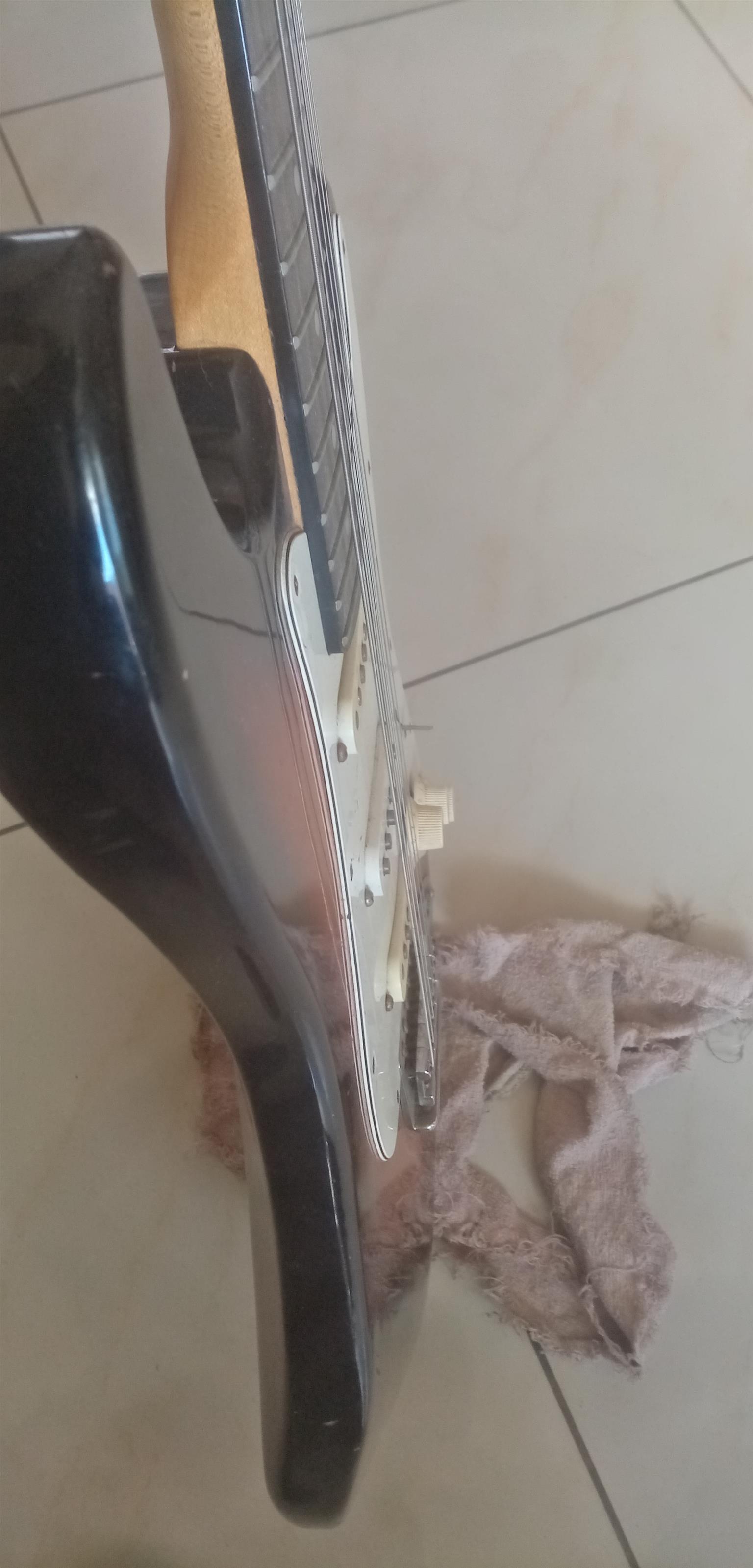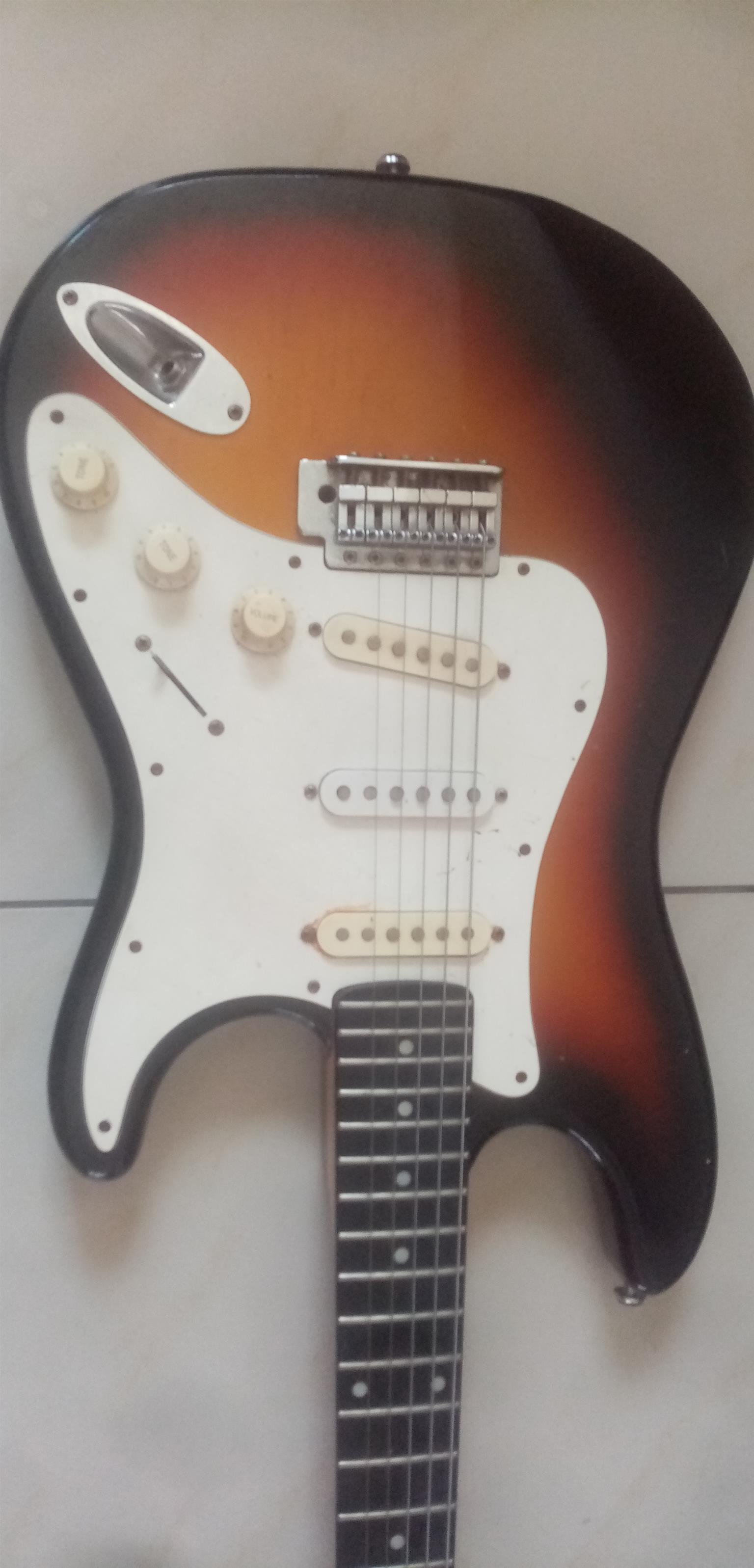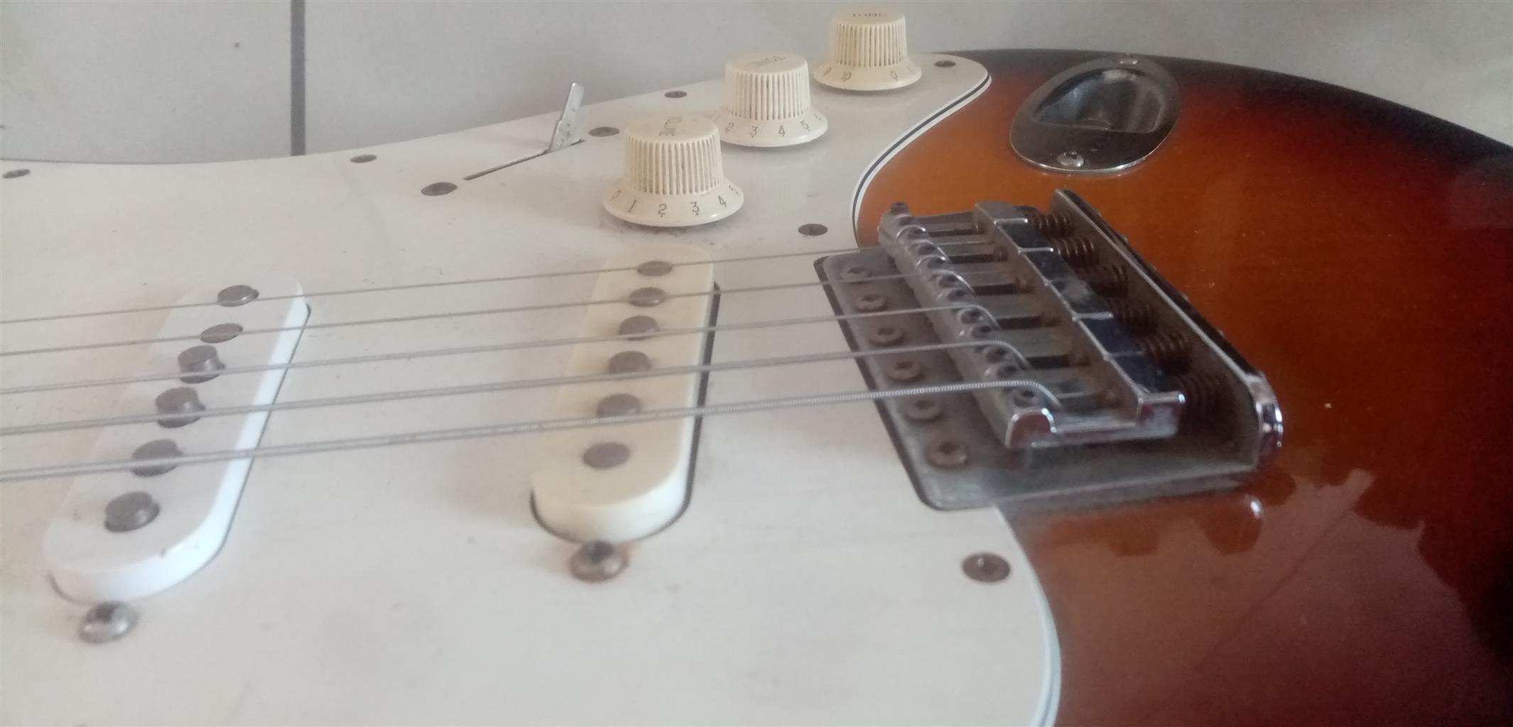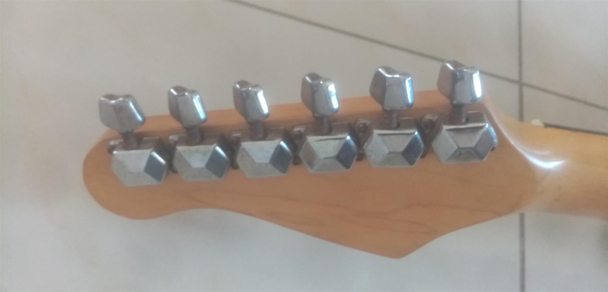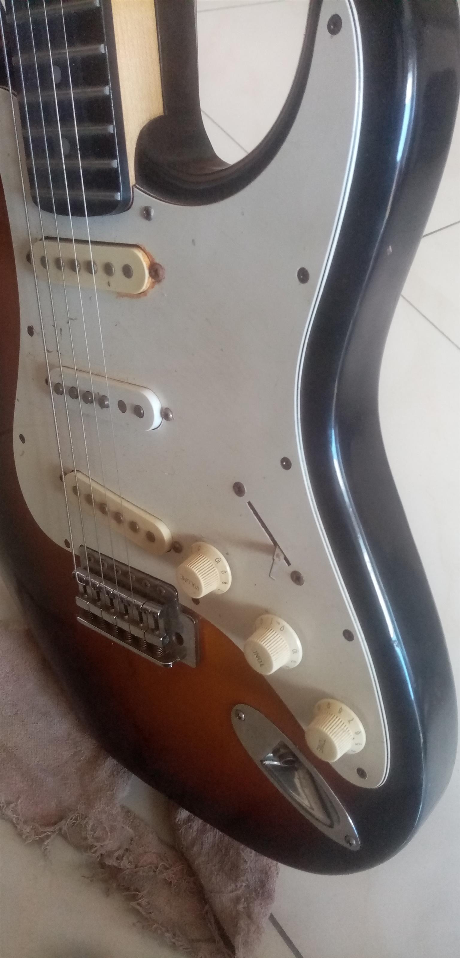 80s Fender Made in Japan Stratocaster with locking tremolo. Overall in good shape. Has a few small blemishes but nothing big or ugly. The electronics work on the guitar as they should.