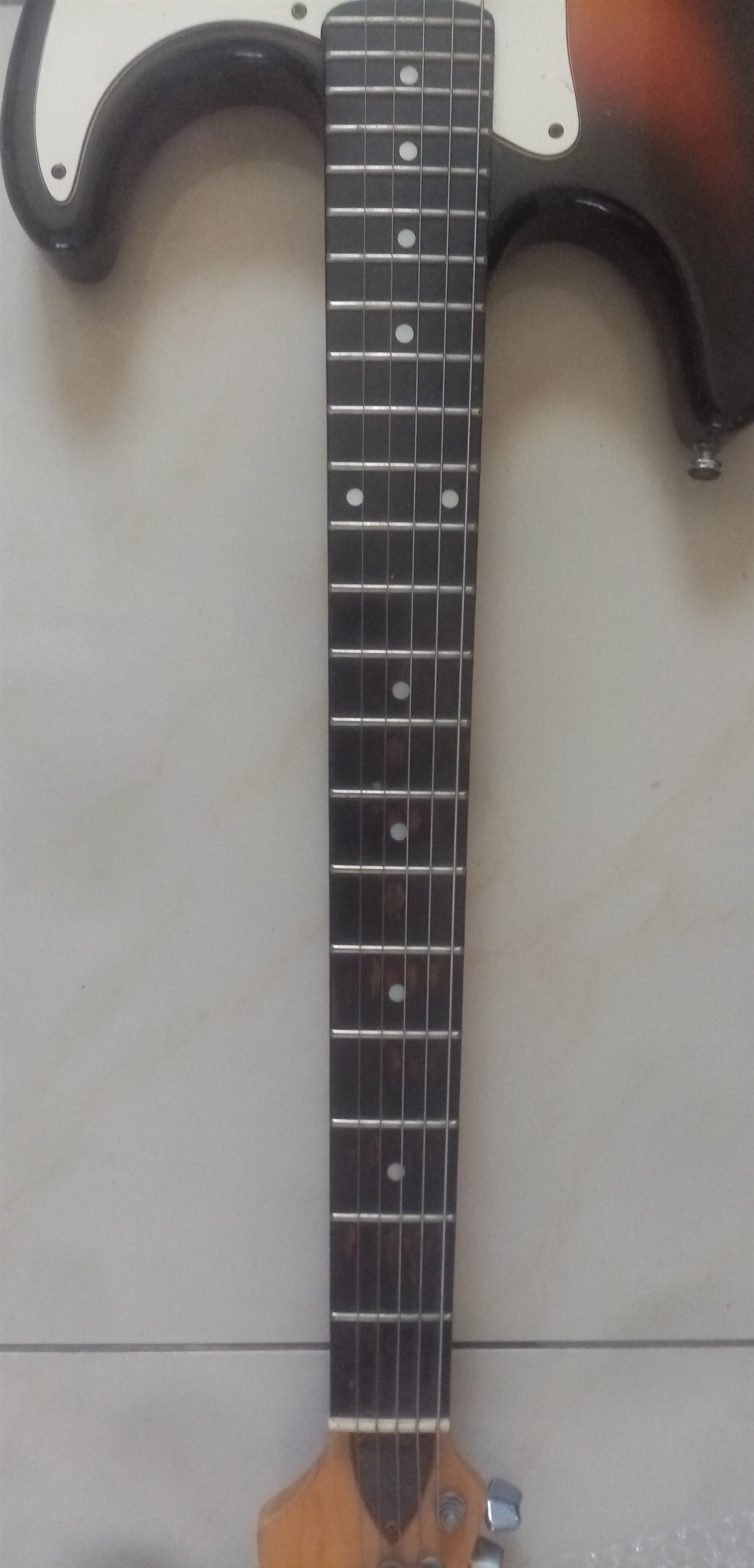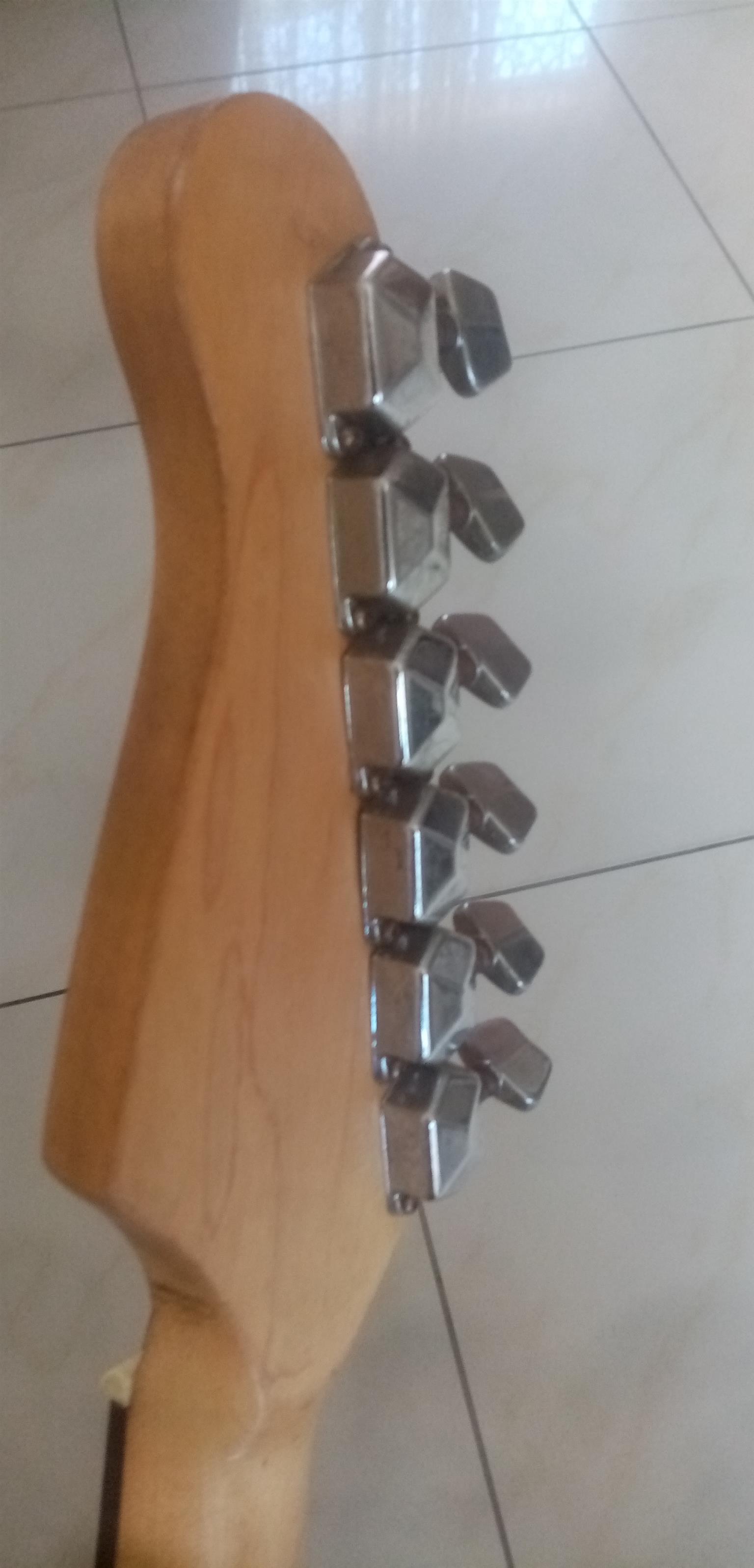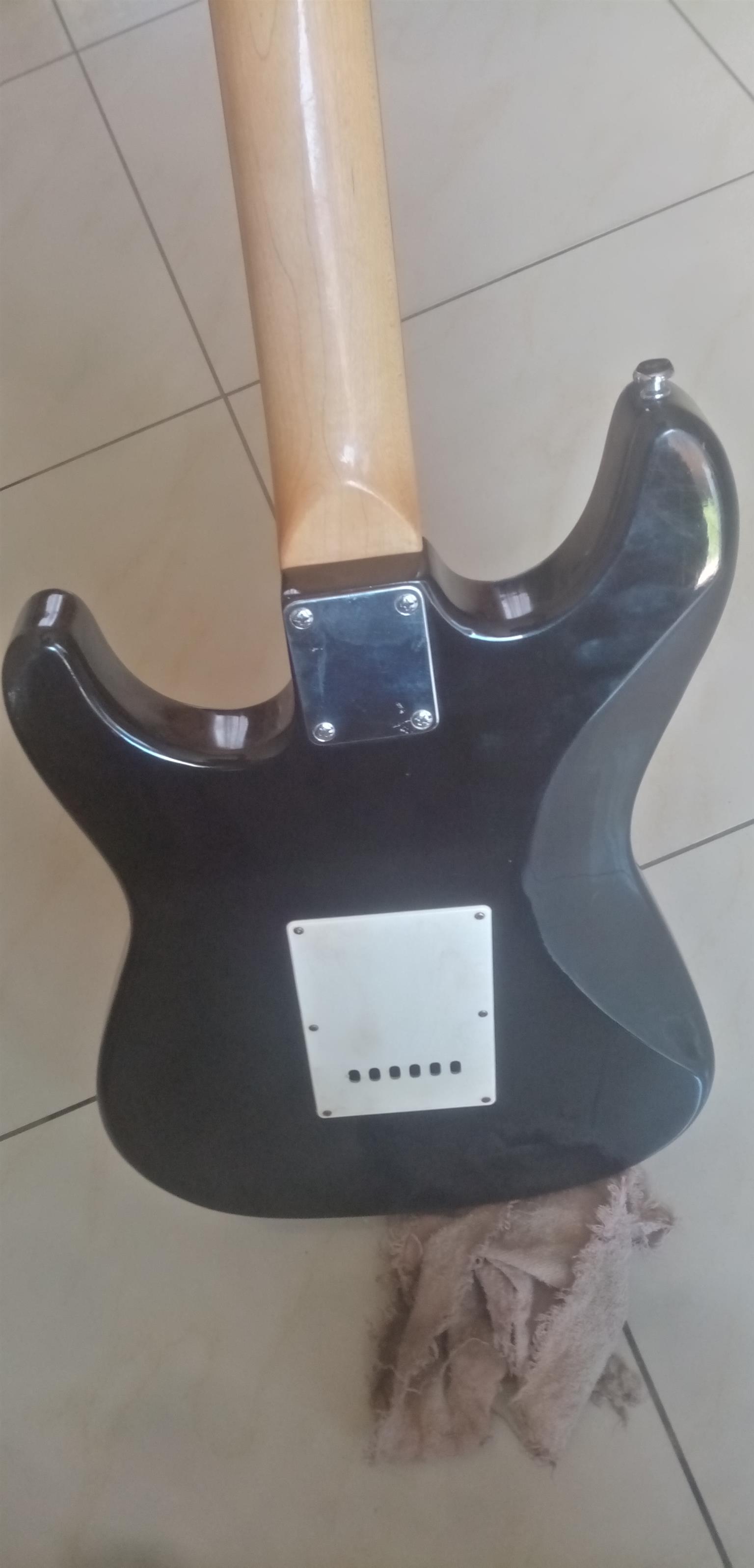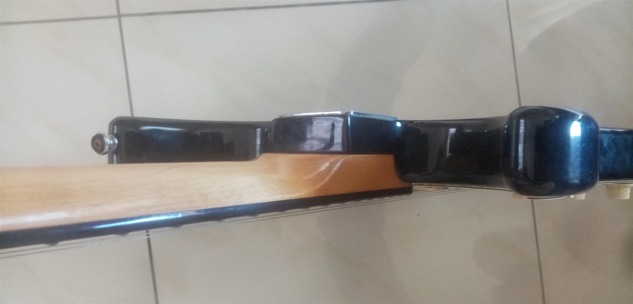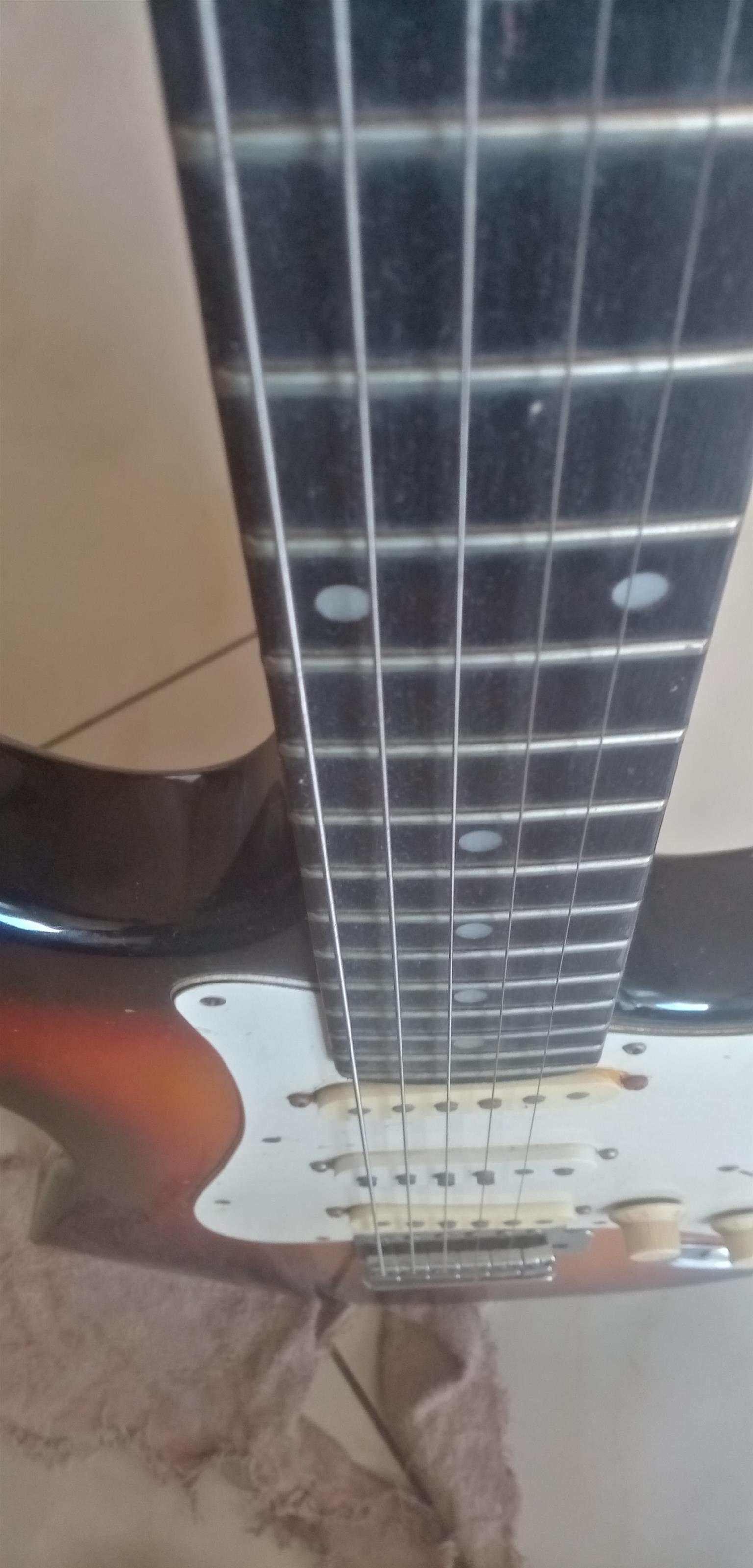 80s Fender Made in Japan Stratocaster with locking tremolo. Overall in good shape. Has a few small blemishes but nothing big or ugly. The electronics work on the guitar as they should.
