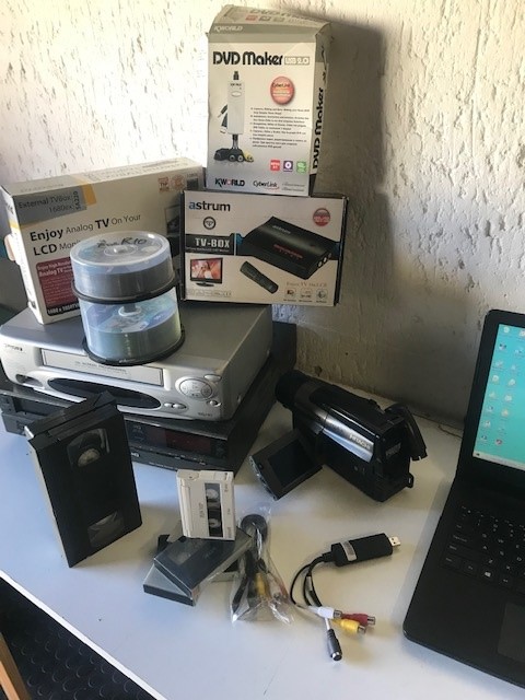 Includes USB Converting Device and software, 2 old VHS Video machines, Hitachi video camera with mini cassettes. Old IDE hard drive to USB connection set. Analog TV to LCD converting Devices.