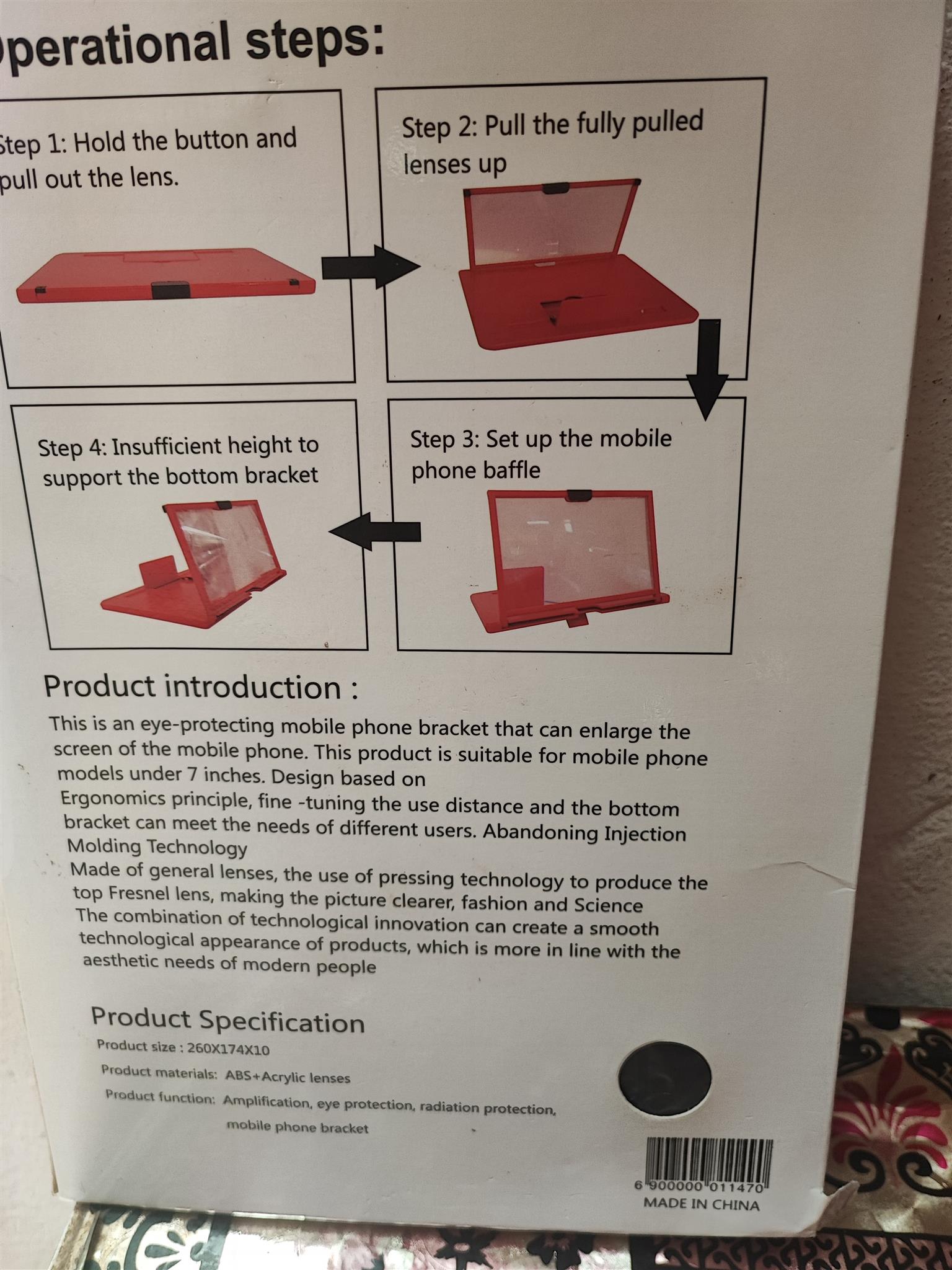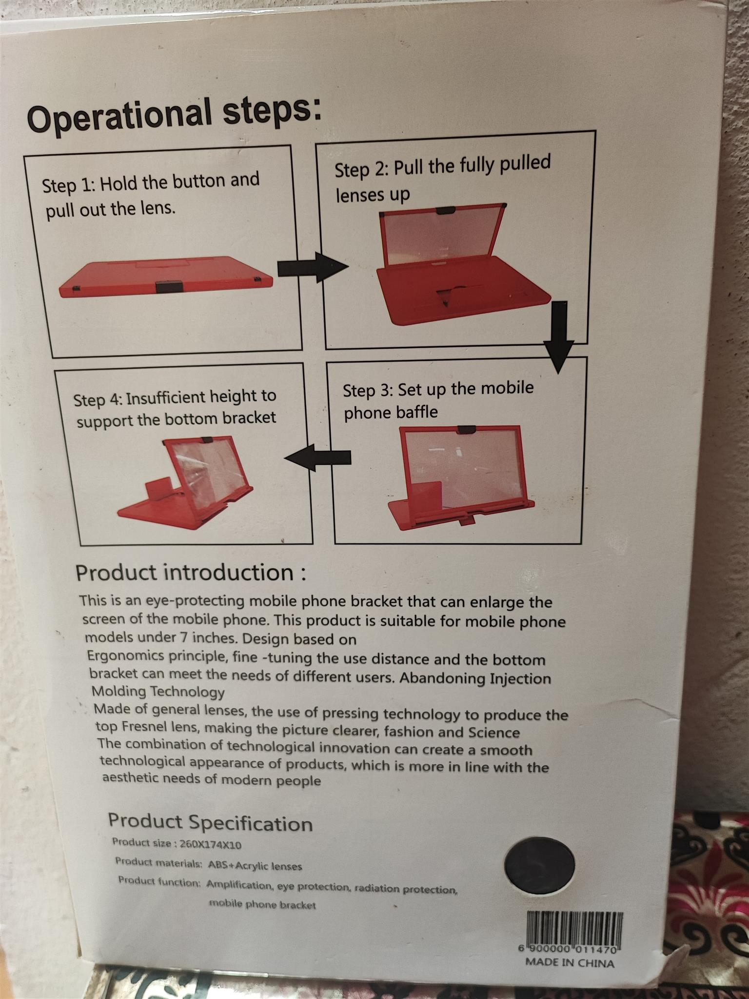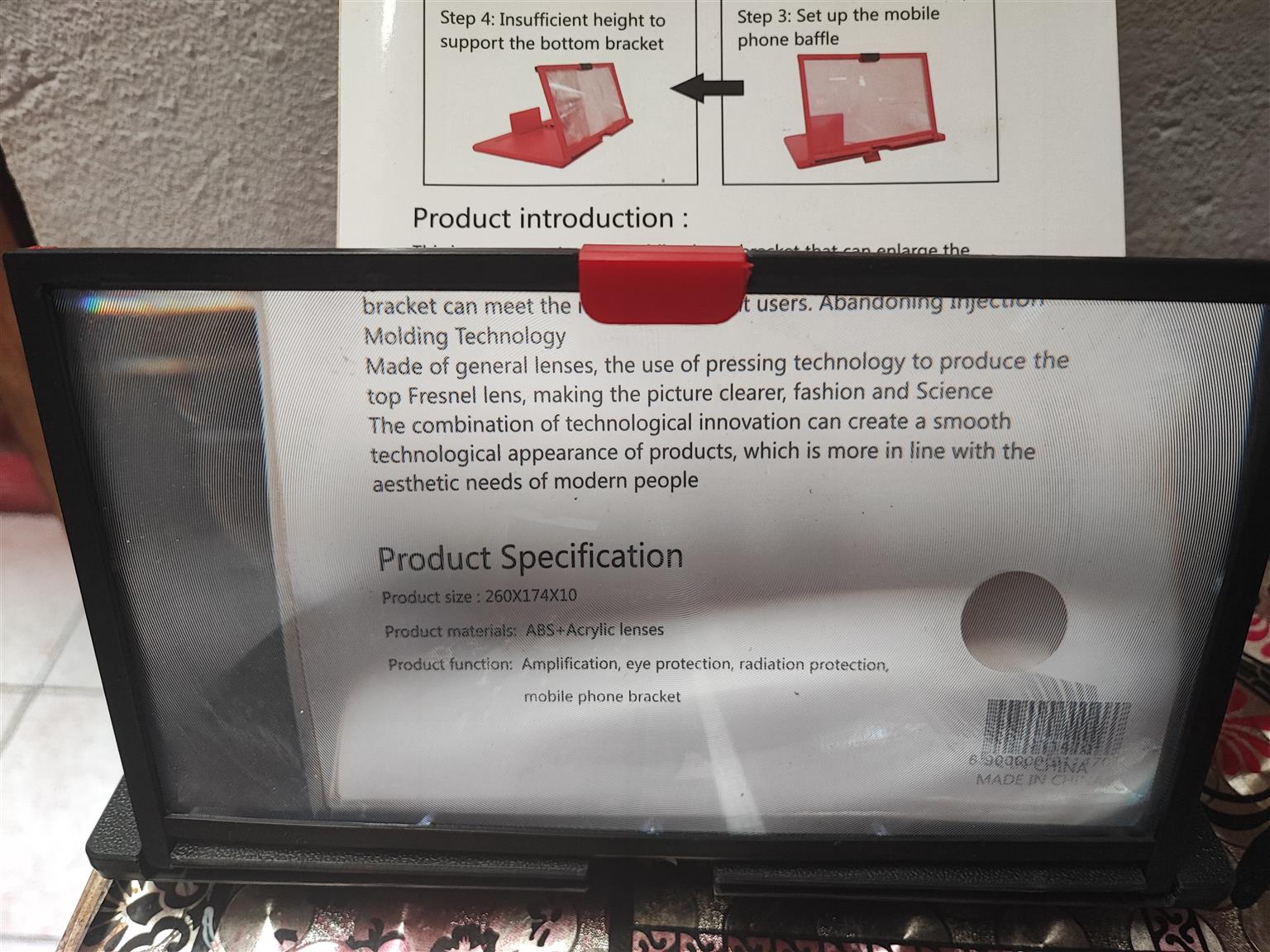 Brand new item for sale. 5D Mobile phone video amplifier. Easy to assemble. Eye protecting mobile phone bracket which enlarged images and font. Suitable for phones under 7 inches.