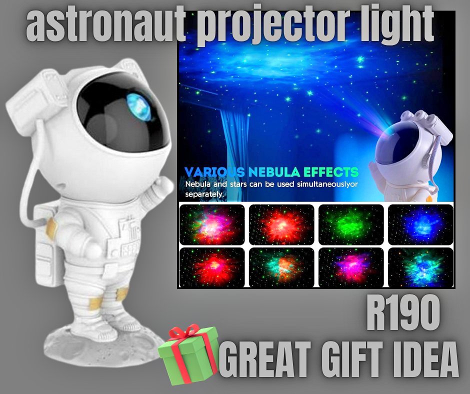 Cute astronaut projection light projects nebulas & stars With remote to control density and colours great gift idea R190 each collection in Westdene JHB or shipping options available (PAXI, PUDO or aramex. Cost on buyer)
