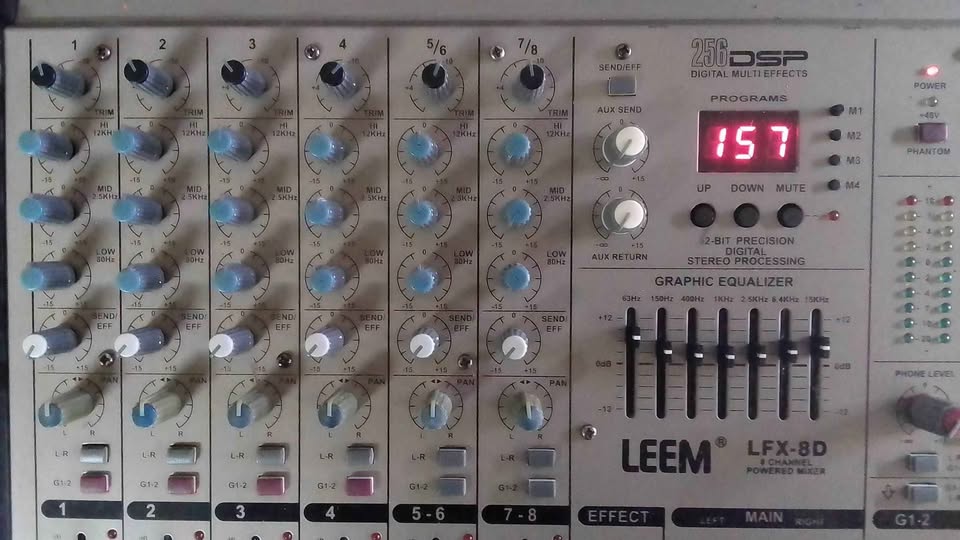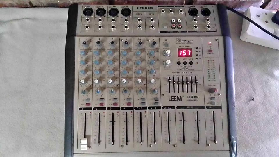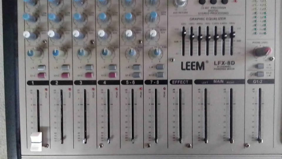Leem LFX-8D 8 channel powered mixer with fx In excellent condition, just missing slider caps (easy to replace) All sliders have been replaced with new. Ideal for a band, d.j, house of worship or small studio, with enough power for a decent set of speakers. Specs: 8 channels 2 x stereo (dual TRS) 4 x mono (XLR & TRS) Inserts on mic channels Rec in/out (RCA) Aux send/return Gain, hi, mid, low, pan and fx on all chan 7 band graphic EQ Headphone output Left & right main output (XLR & TRS) Group output - assignable (TRS) 256 DSP effects (32 bit) 200w RMS per channel Amplifier 2 x amp outputs per channel (TRS) Cooling fan Sturdy construction. Testing welcome Collection in Walkerville, or I can courier countrywide at buyers cost via Pudo (courier guy)
