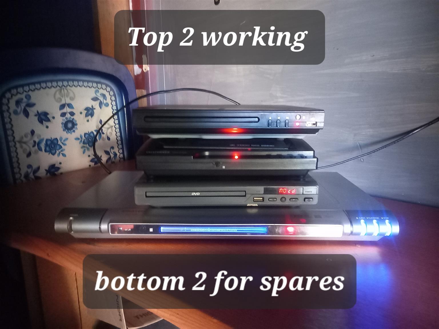 4 x DVD players top 2 working R100 each or R150 bothBottom 2 for spares R100 for bothKrugersdorp north 068-219-3076view more Urgent sale