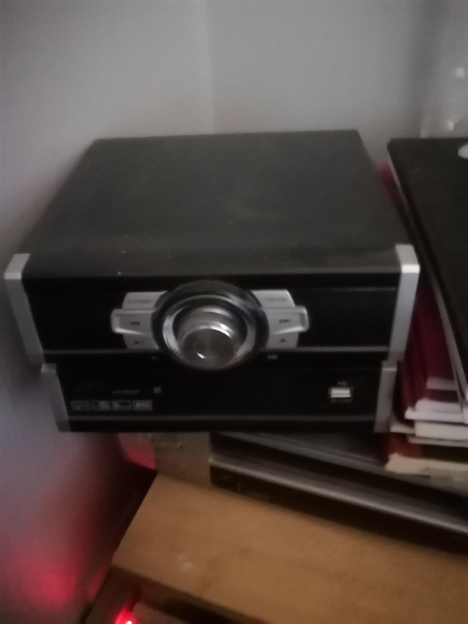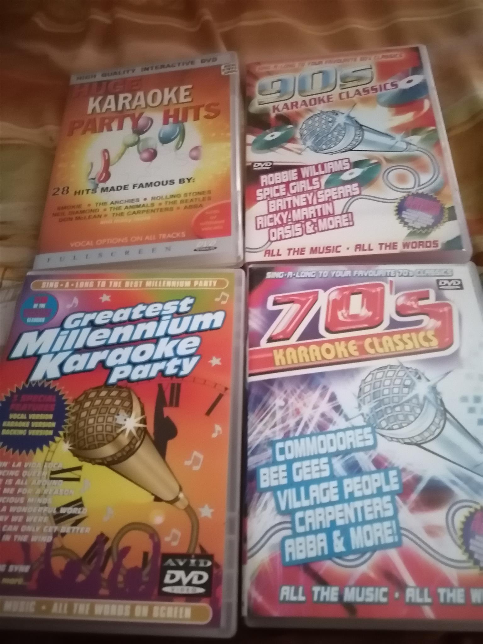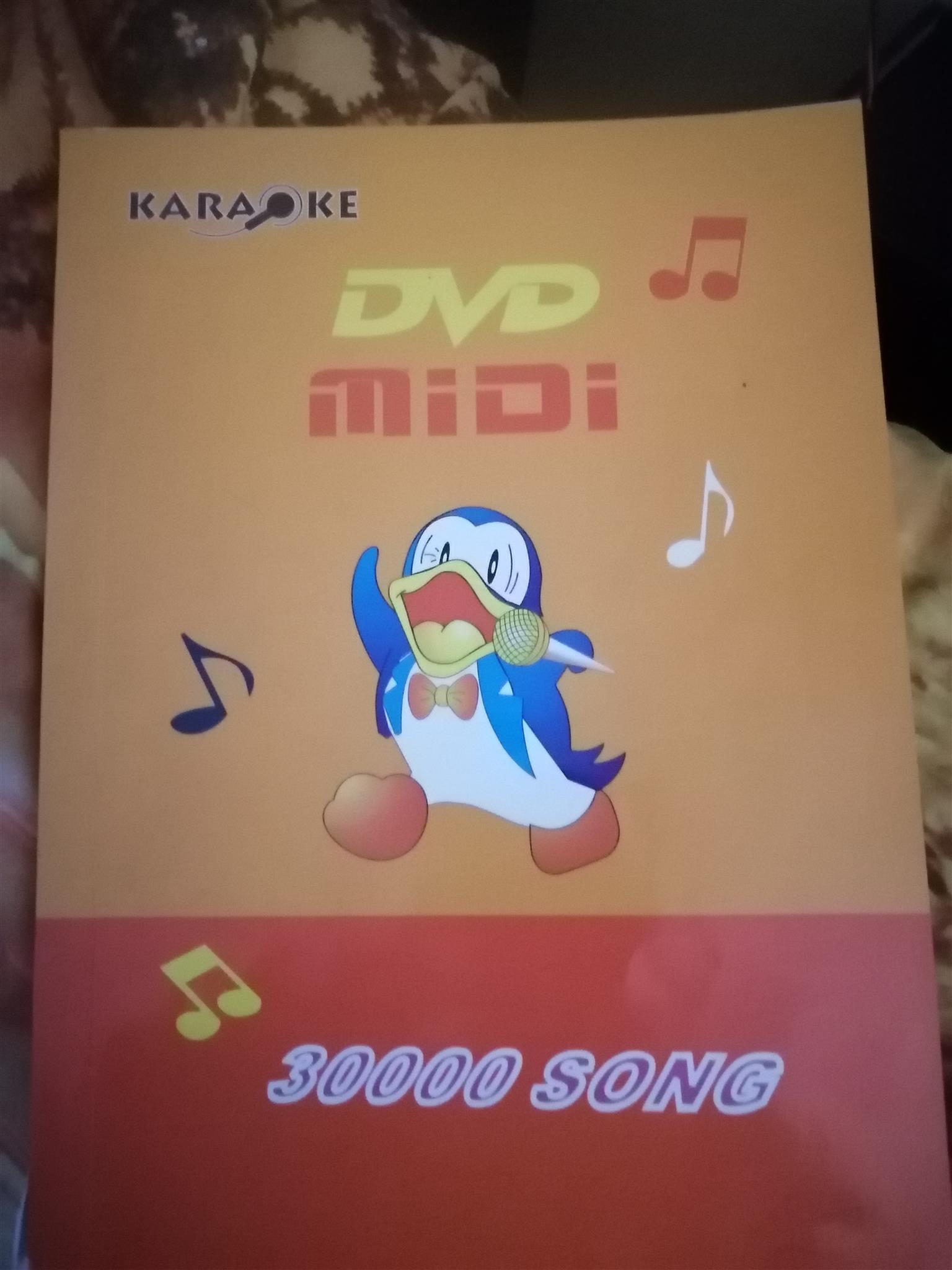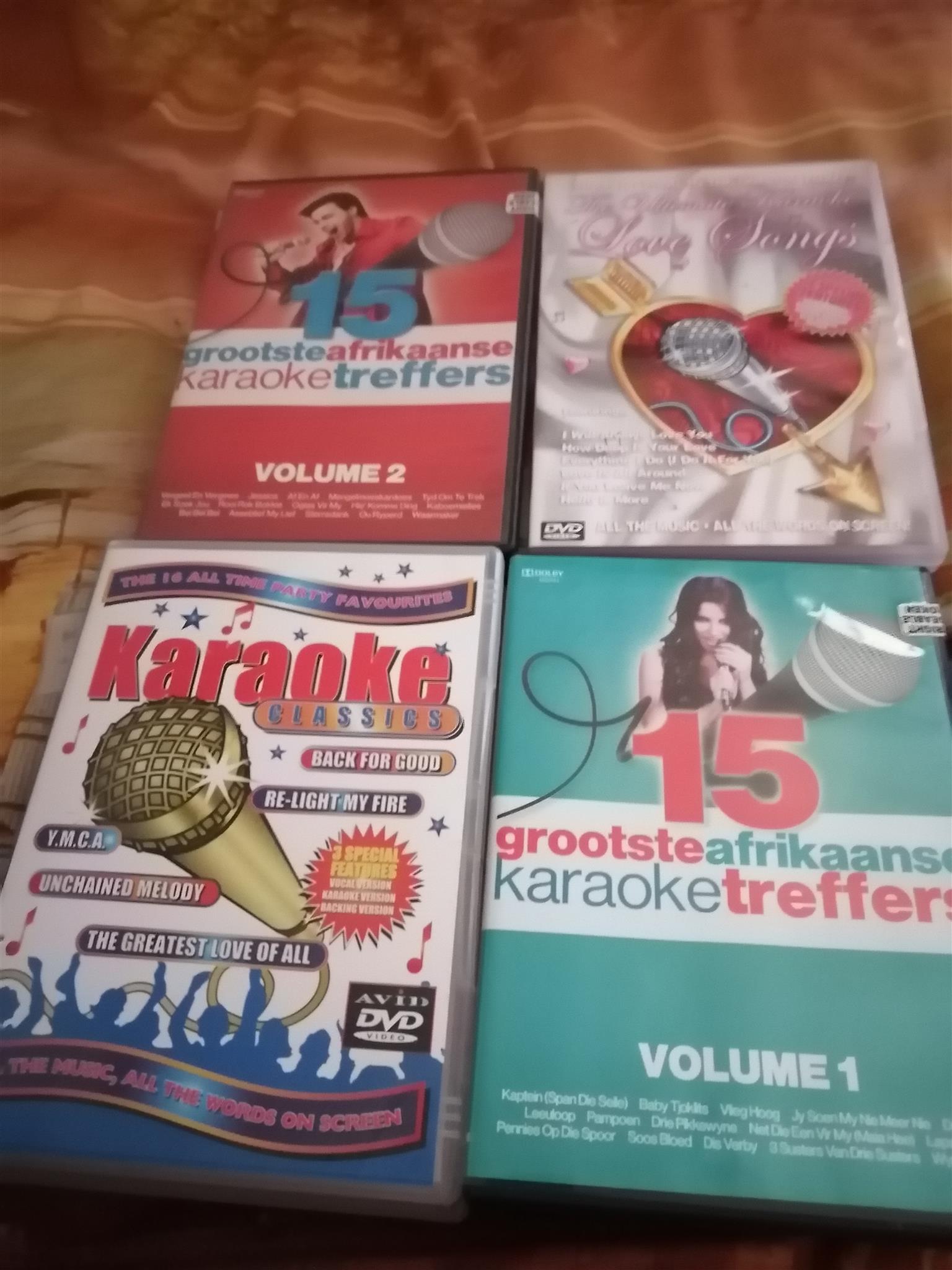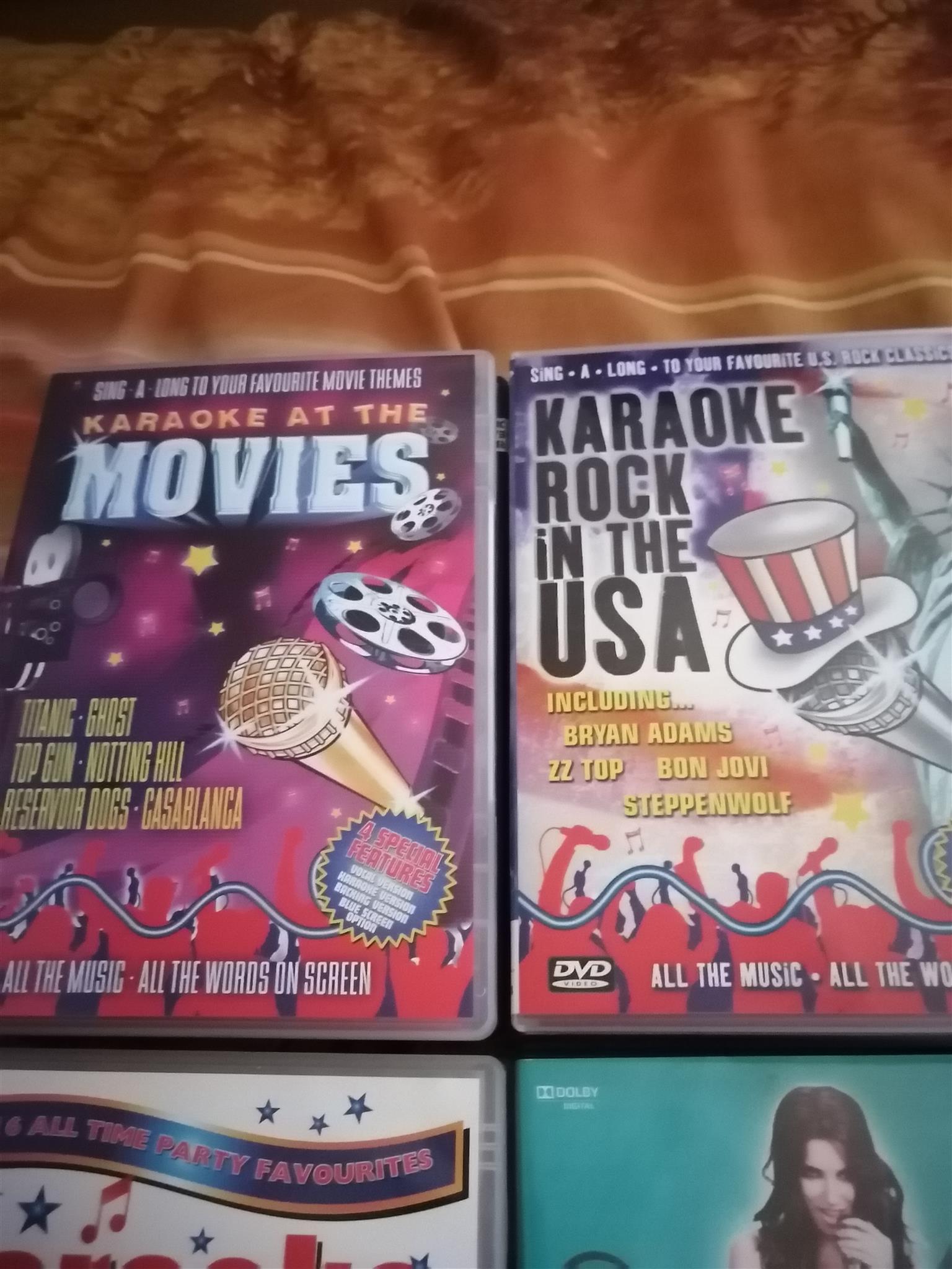 Karoake system with build in radio and cd player, 2 speakers, 10 karoake dvd's. Microphone, and book with cd of 3000 songs of karoake. Used products only once.