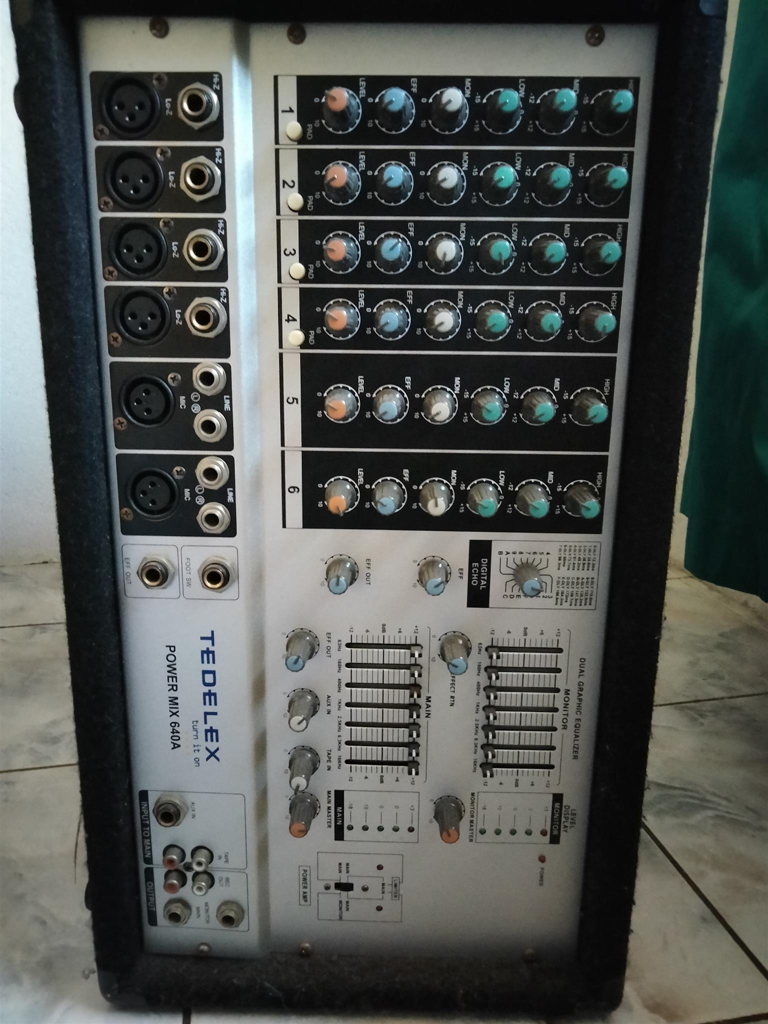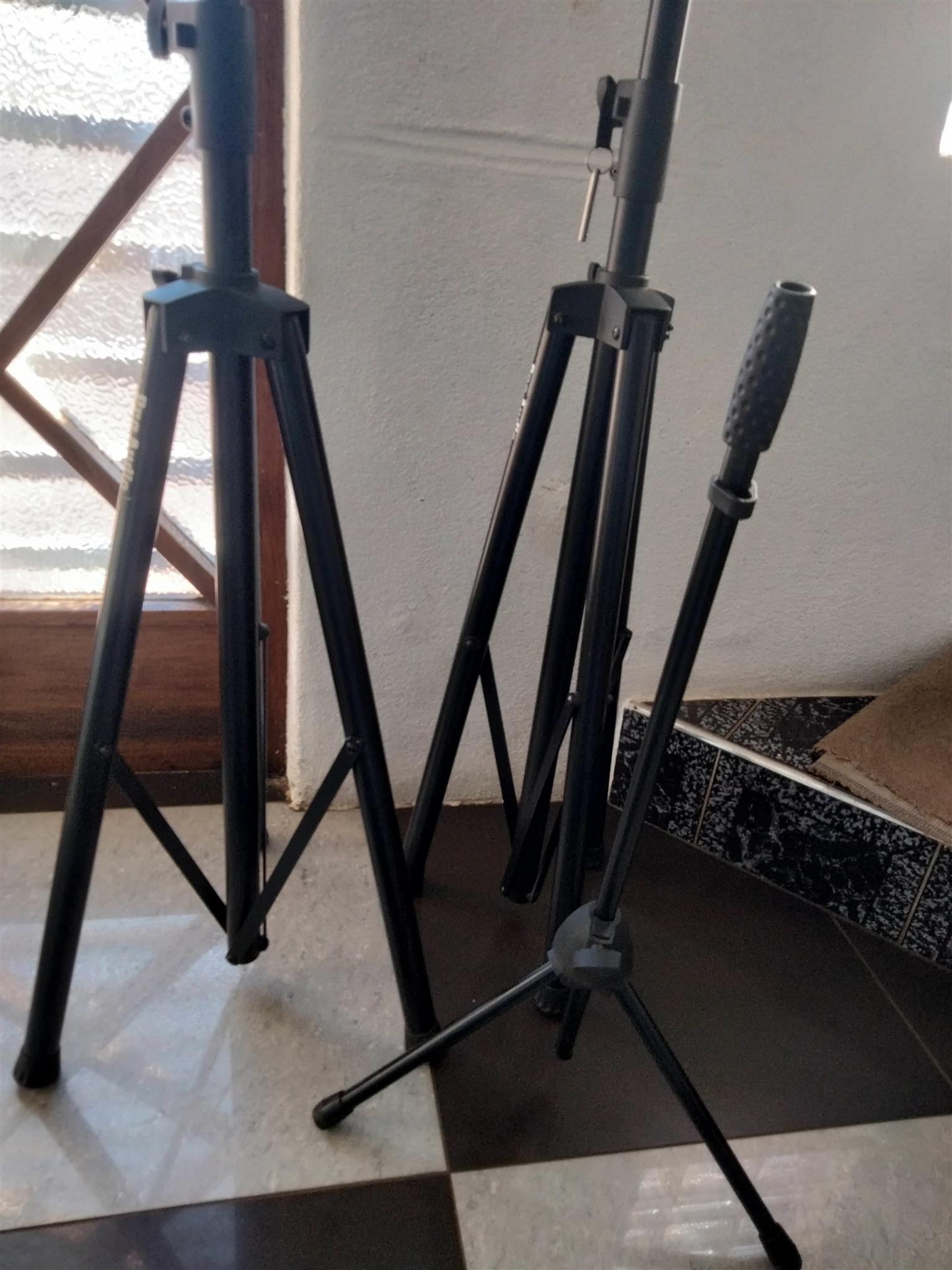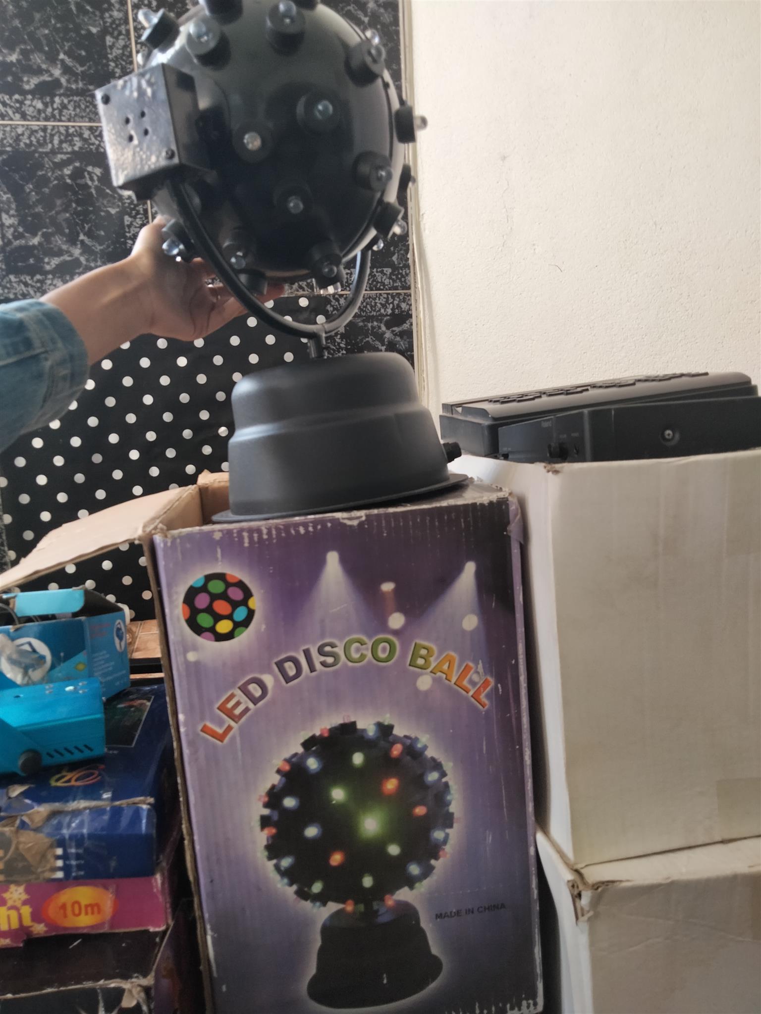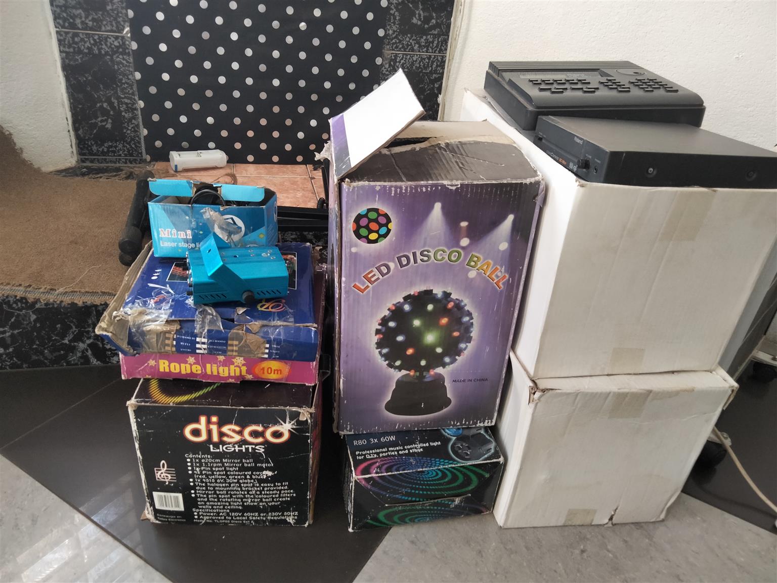 2 speakers, 2 stands, 1 amplifier and multiple lights including disco ball