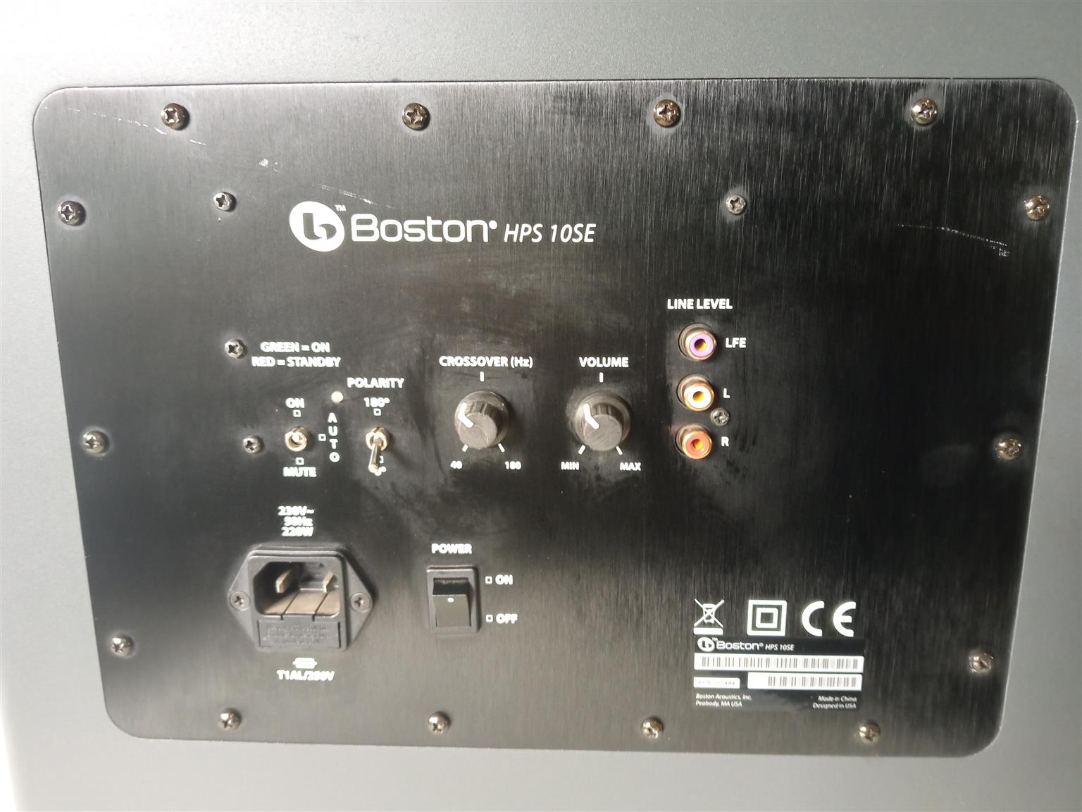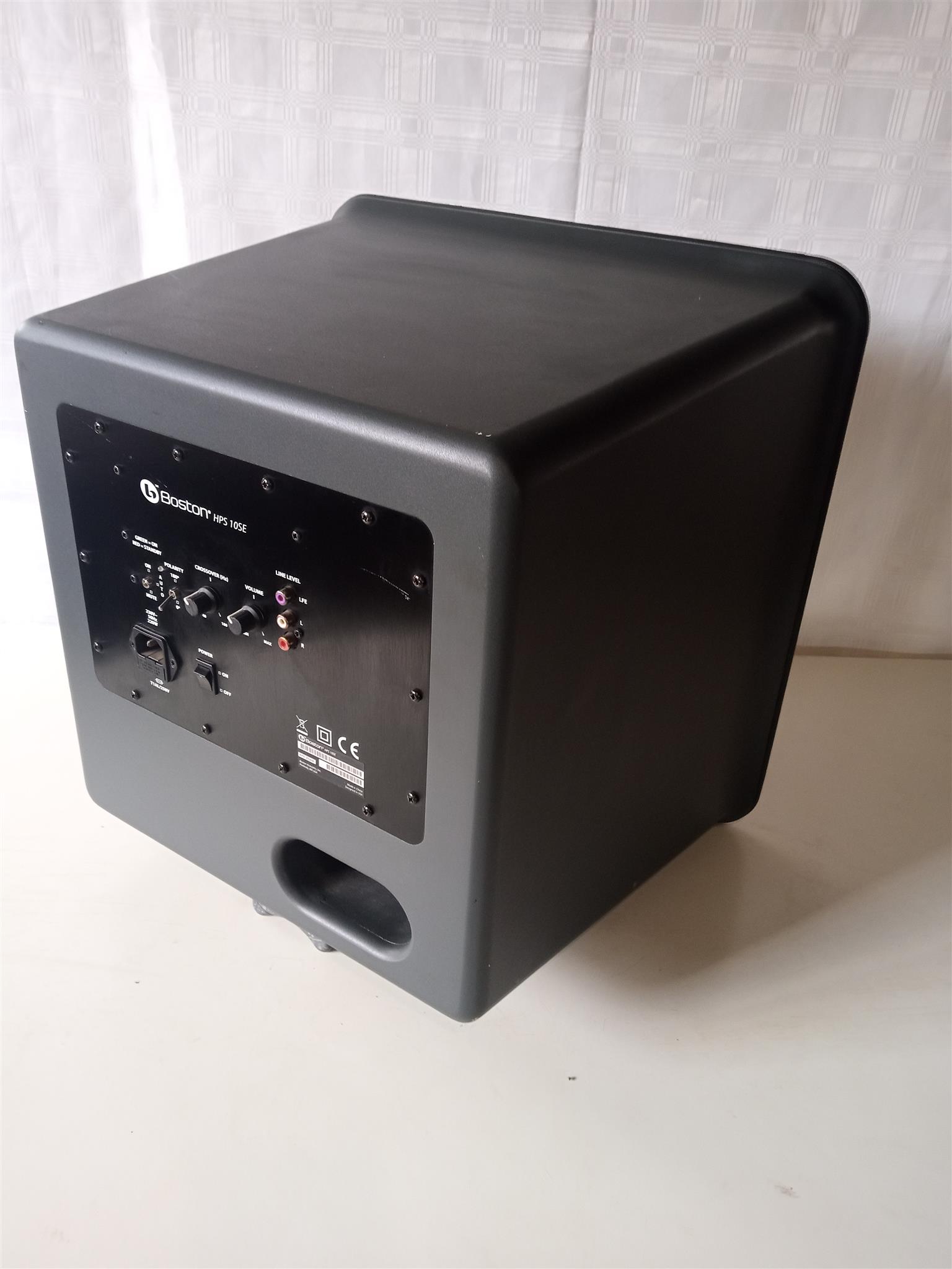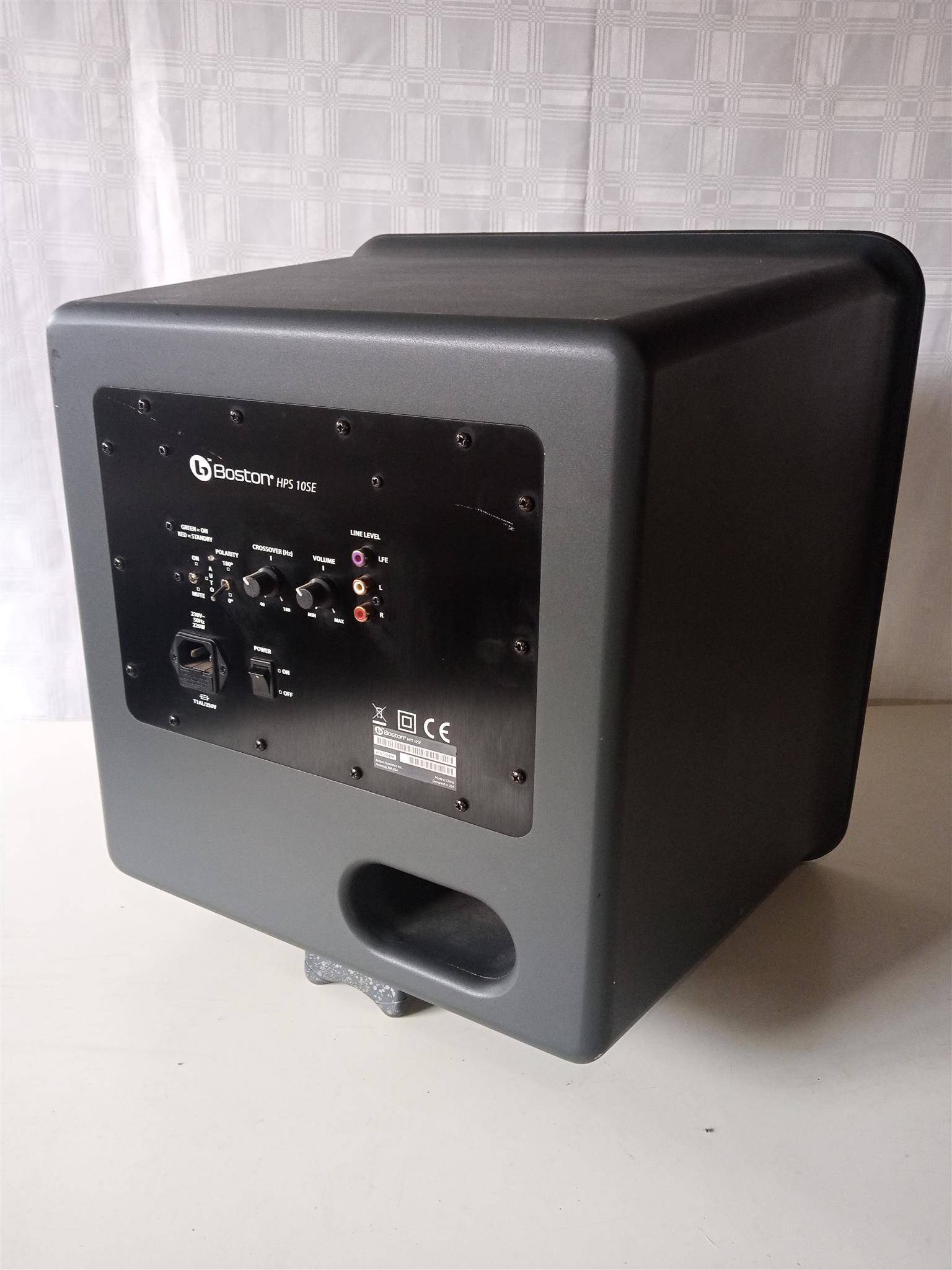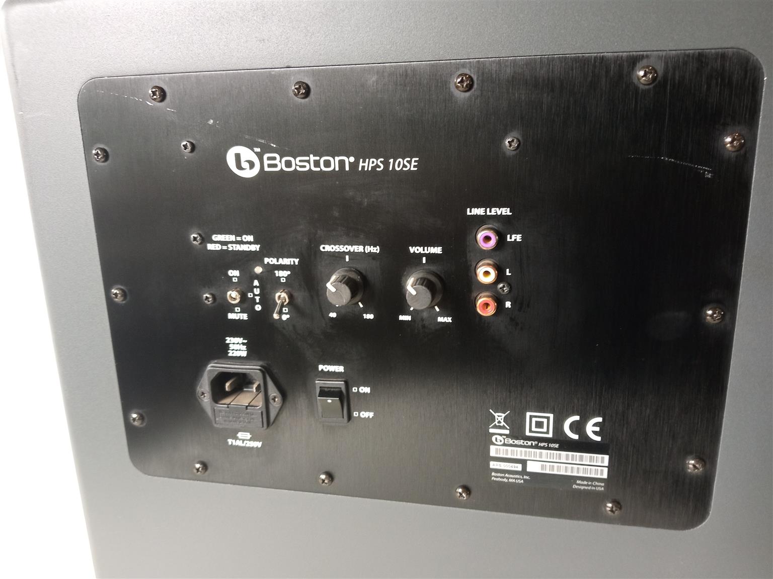 Boston Acoustics HPS10SE Front-Firing Powered Subwoofer · 10-inch woofer cone · 150 watts RMS · High-output front firing, rear ported DCD driver. The internal amplifier delivers 150W RMS of power for a strong, clear performance. The rear panel features speaker-level output connectors to connect to a variety of home theater and music systems. A volume control and phase switch let you adjust the volume to suit your preferences and sync the subwoofer output to your speakers.