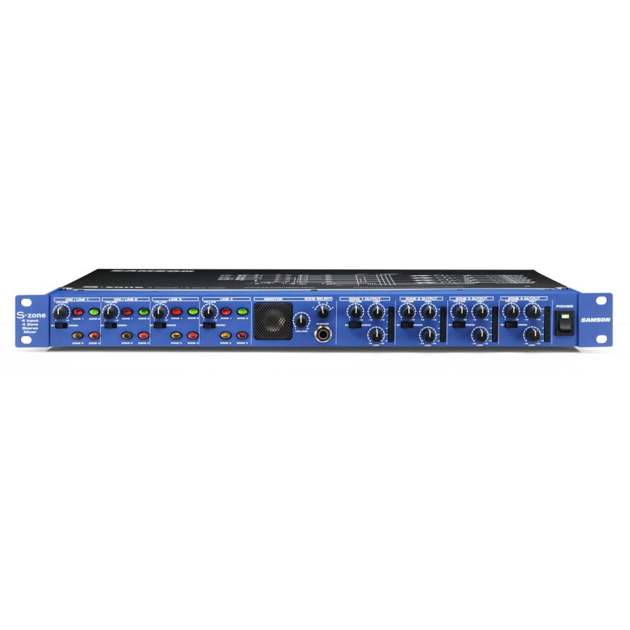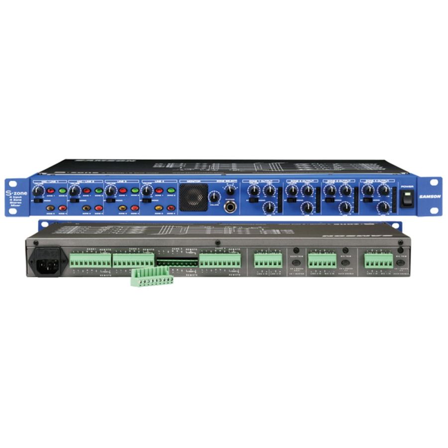 The Samson S-Zone is a 4 zone stereo mixer designed for fixed installation in bars, restaurants, clubs, offices, schools and more. The mixer is designed with 4 inputs that are completely assignable to any of the 4 output zones. The result is an audio matrix, routing system that can isolate audio in specific areas within a venue. 2 balanced microphone and 4 balanced aux/line inputs are featured.