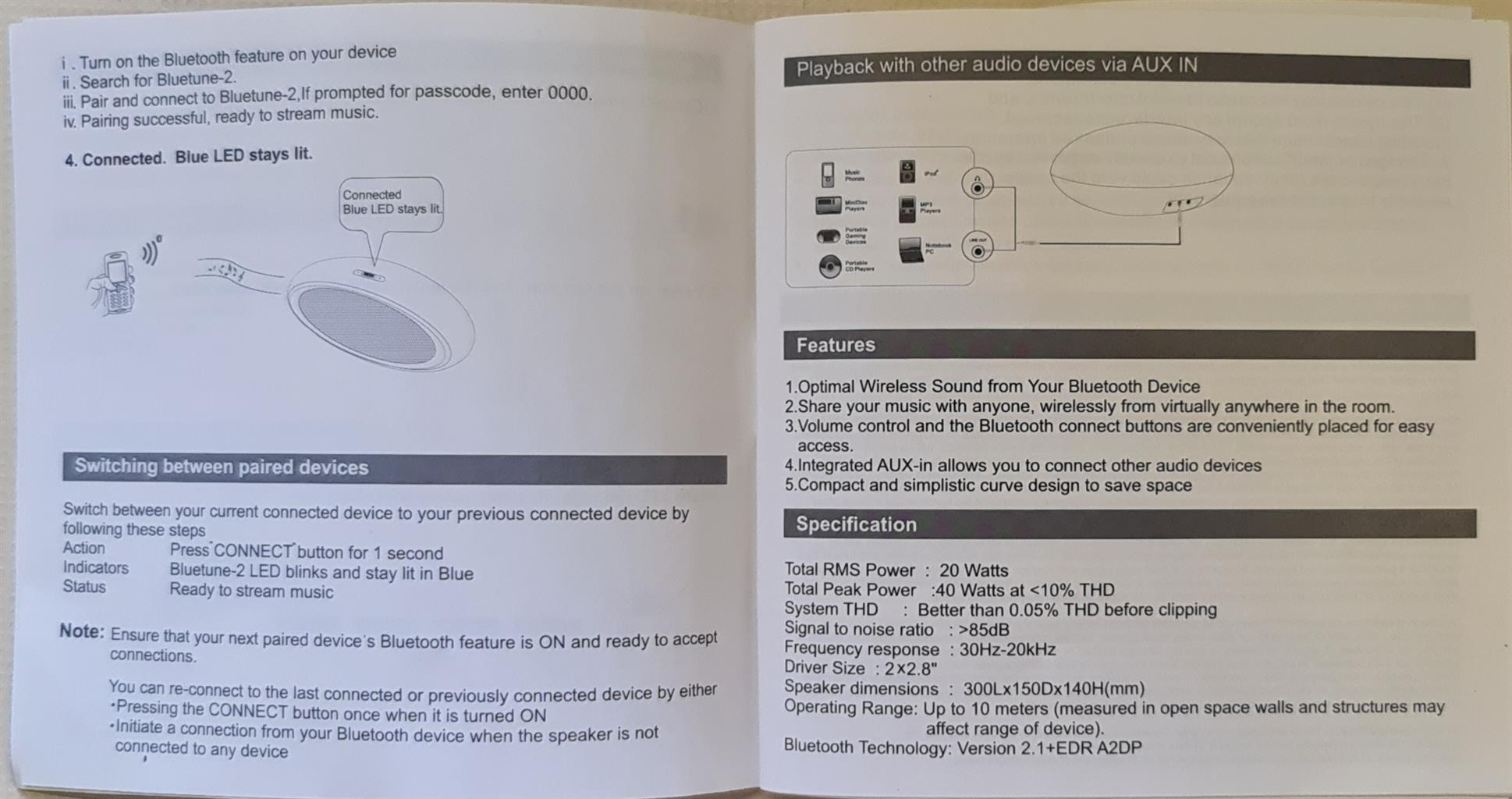 Built with award-winning Bluetooth technology, Divoom Bluetune-2 is a Home-use speaker with elegant design, world-class tuning and audiophile-like wireless Sound quality. The buttons for volume control and Bluetooth connection are easily accessible on the top of the panel. High-performance digital amplifiers and drivers are housed within the sturdy, single-shell chassis to yield distortion-free sound. It works with iPhone, iPad and any other Smartphone and Tablet. Additionally, the clean, elegant design makes the speaker a handsome addition to your home. The speaker system easily pairs with iPhones, iPads, notebooks, and other Bluetooth-enabled.