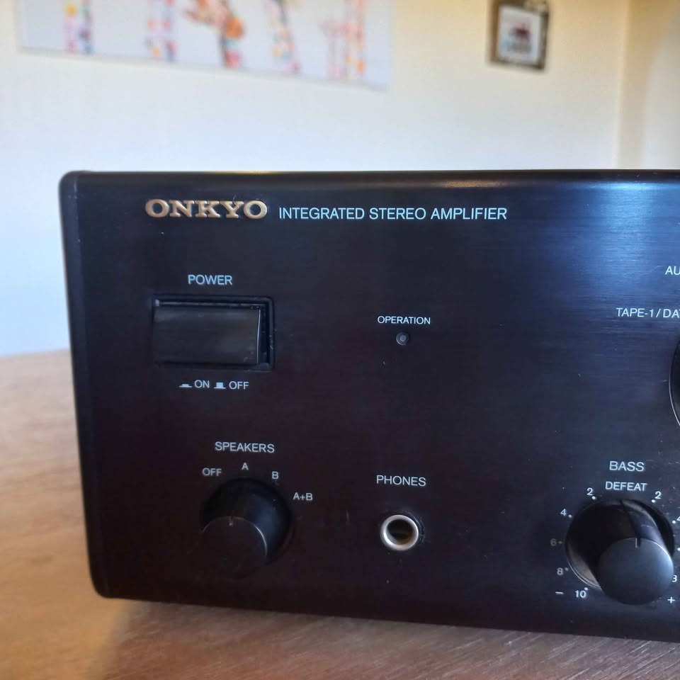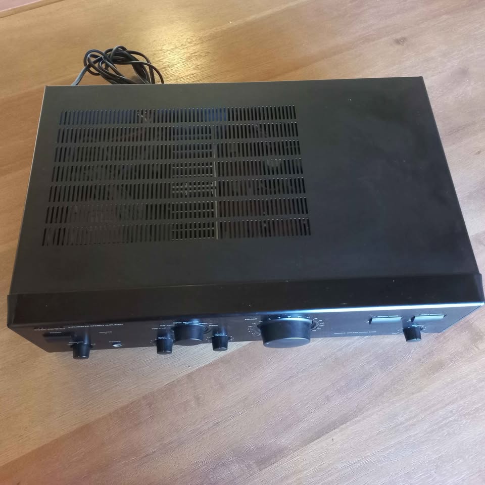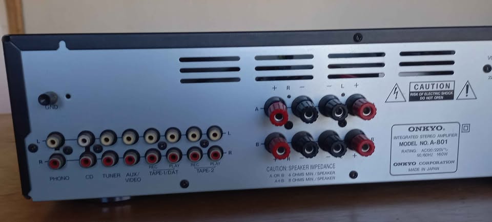 The Onkyo A-801 is a vintage stereo integrated amplifier introduced in 1991, renowned for its solid build and clean, neutral sound signature. Manufactured in Japan, it was designed for audiophiles seeking reliable performance in a mid-powered amplifier. 🔧 Key Specifications Power Output: 40 watts per channel into 8Ω (stereo) Frequency Response: 15Hz to 30kHz Total Harmonic Distortion (THD): 0.06% Signal-to-Noise Ratio: 102dB (line input) Inputs: Multiple line-level inputs, including a phono input for turntables Speaker Outputs: Twin sets of large speaker terminals, allowing for A/B speaker switching